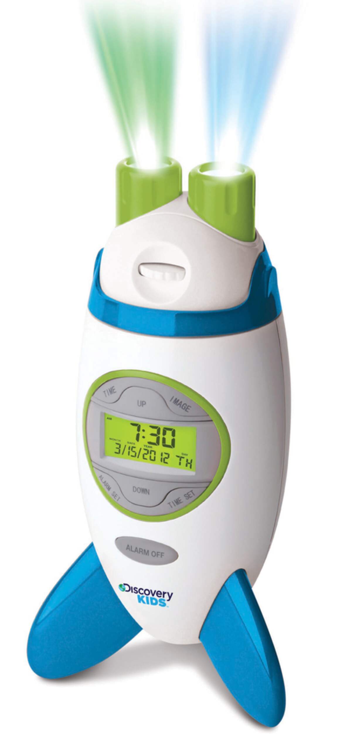Discovery Kids Projection Alarm Clock features a built-in alarm clock with On/Off function