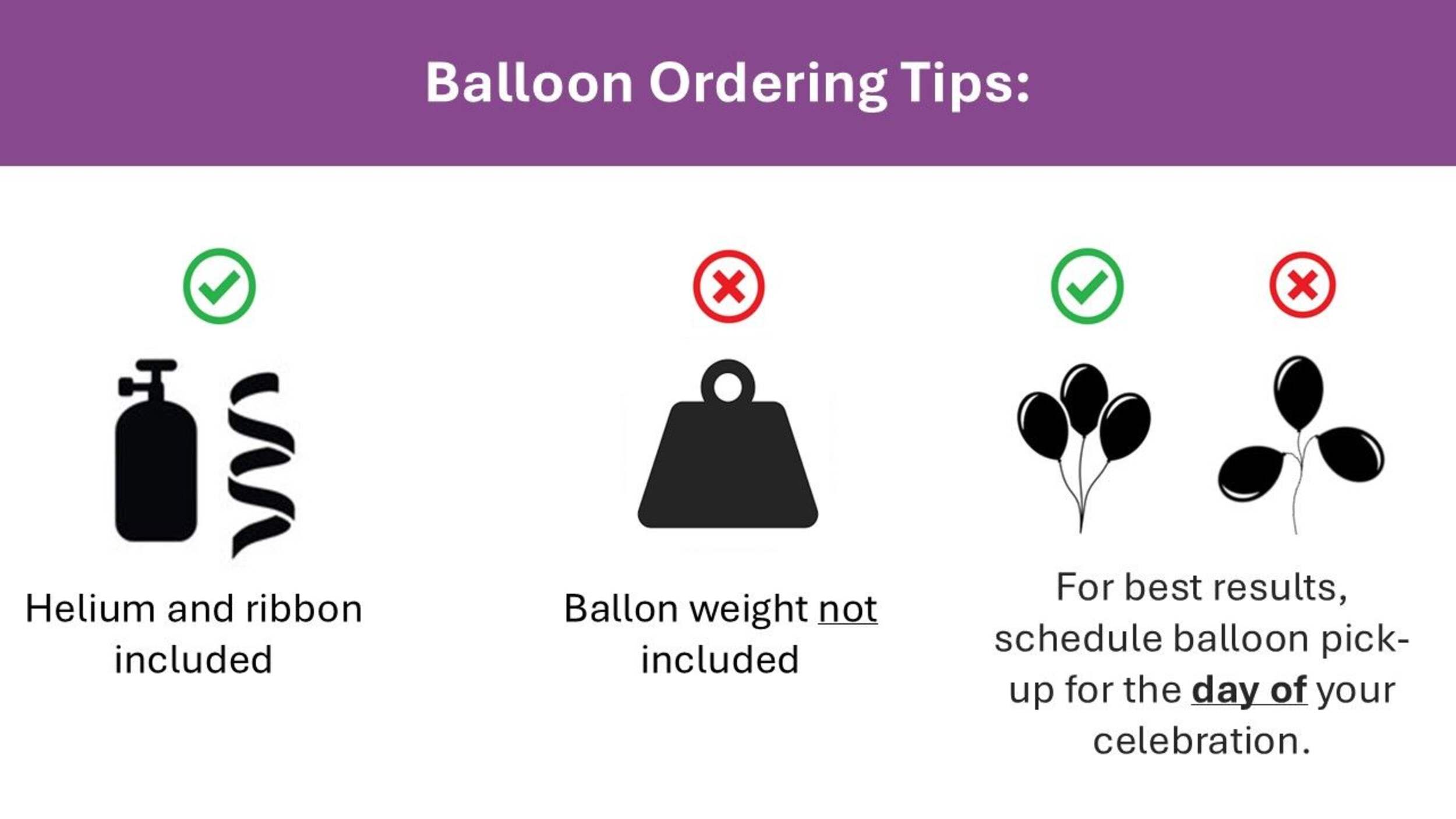Balloons look their best the same day as inflated. For best results, schedule balloon pick-up for the day of your celebration. Inflated balloons are not returnable. Appointments can be modified or cancelled up to 24 hours prior to the date and time selected. Please visit our FAQs for more details.