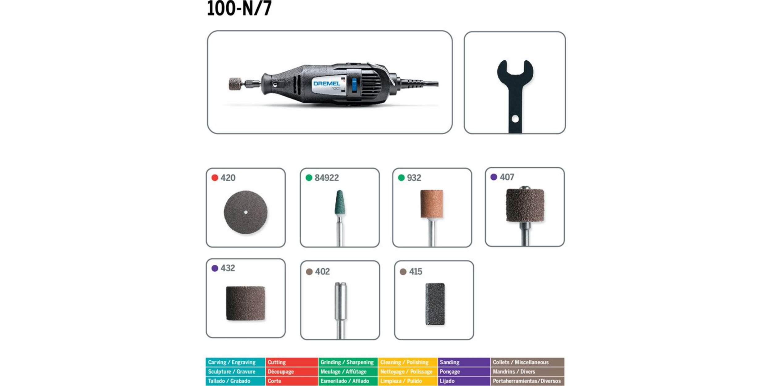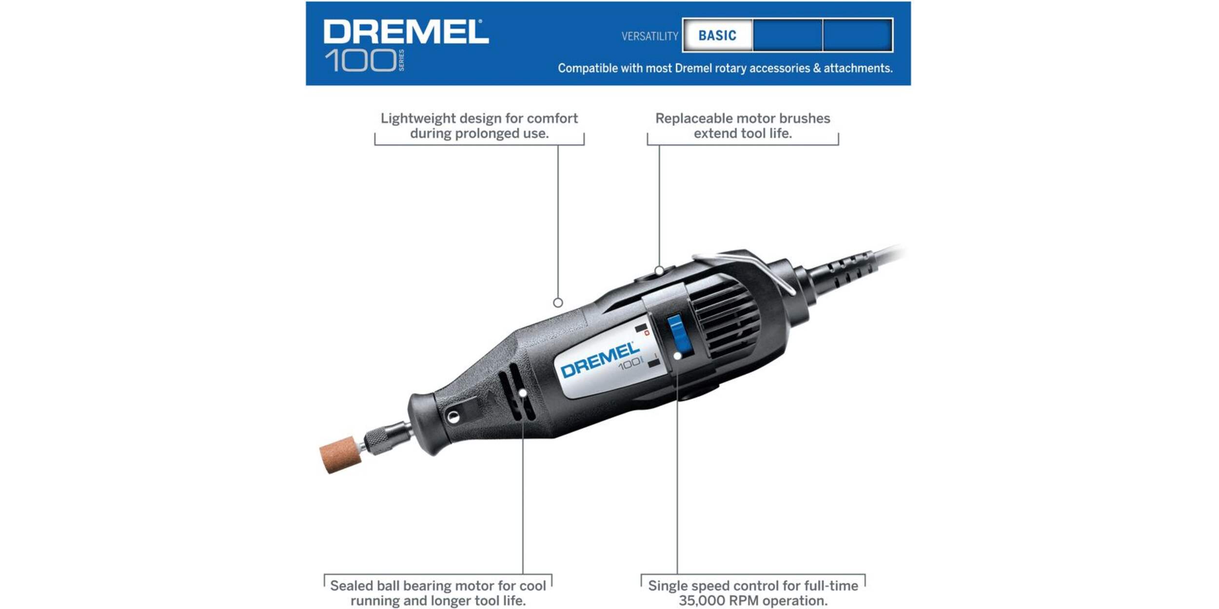 Includes: DREMEL 100 rotary tool and 7 accessories