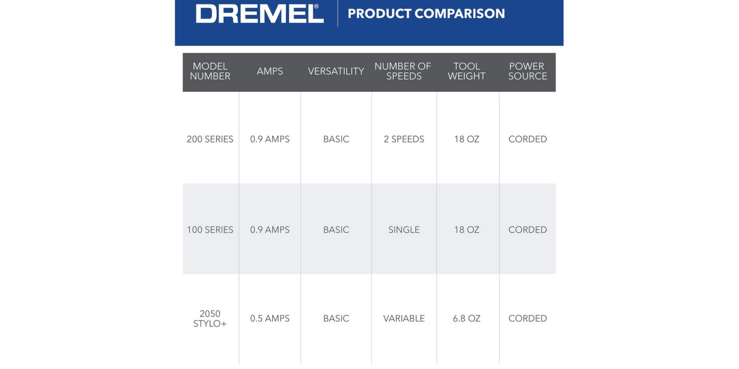 | Accessories List | Collets, Grinding Bits, Mandrels, Polishing Compound, Sanders | Accessory Case, Collets, Cutting Bits, Grinding Bits, Mandrels, Sanders, Storage Case | Accessory Case, Collets, Grinding Bits, Mandrels, Polishing Compound, Sanders, Storage Case | Rechargeable Battery, Battery Charger | |