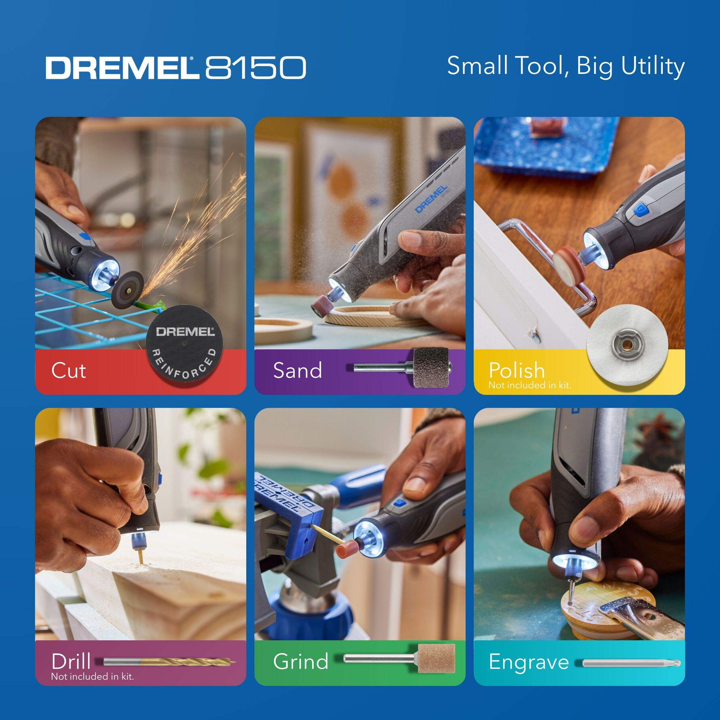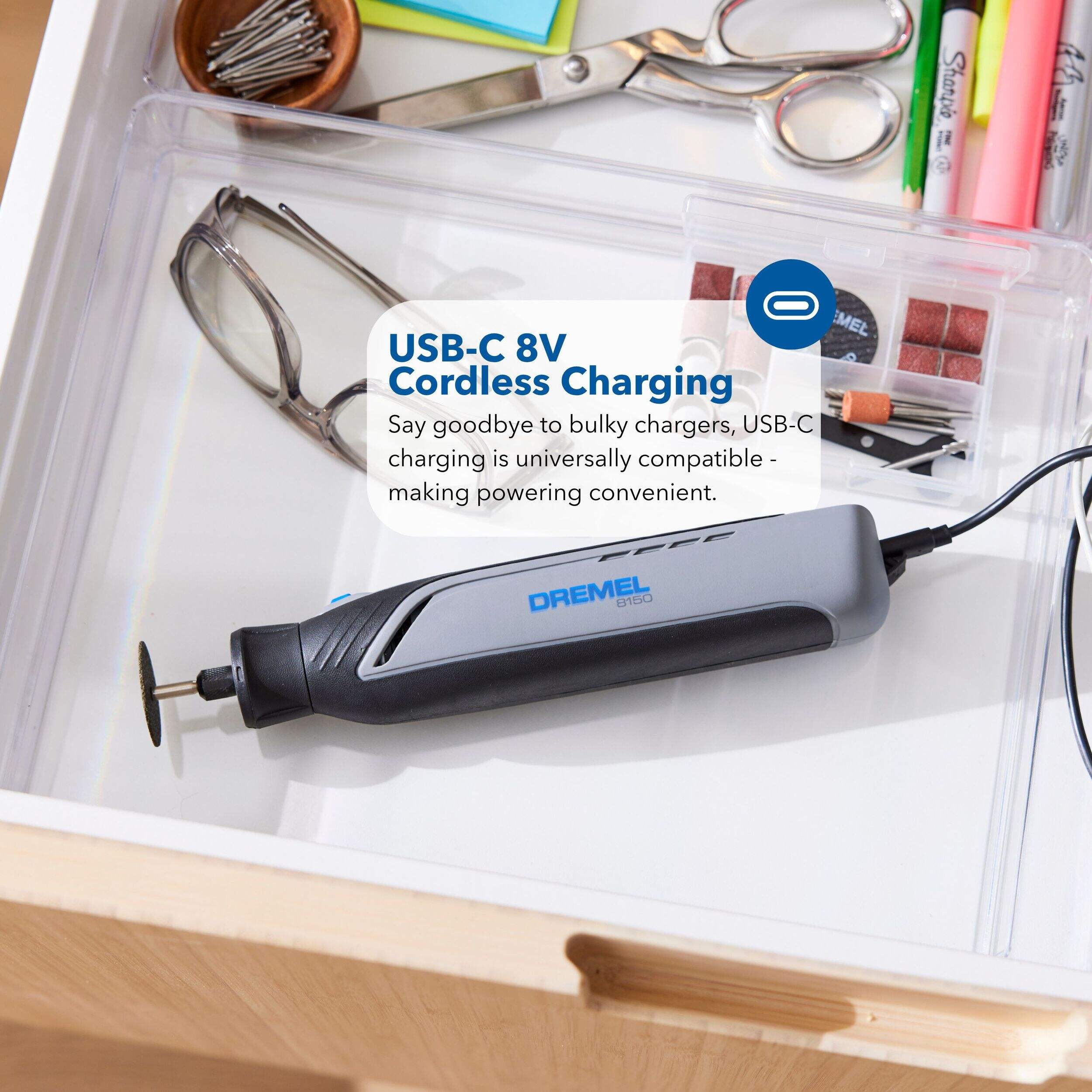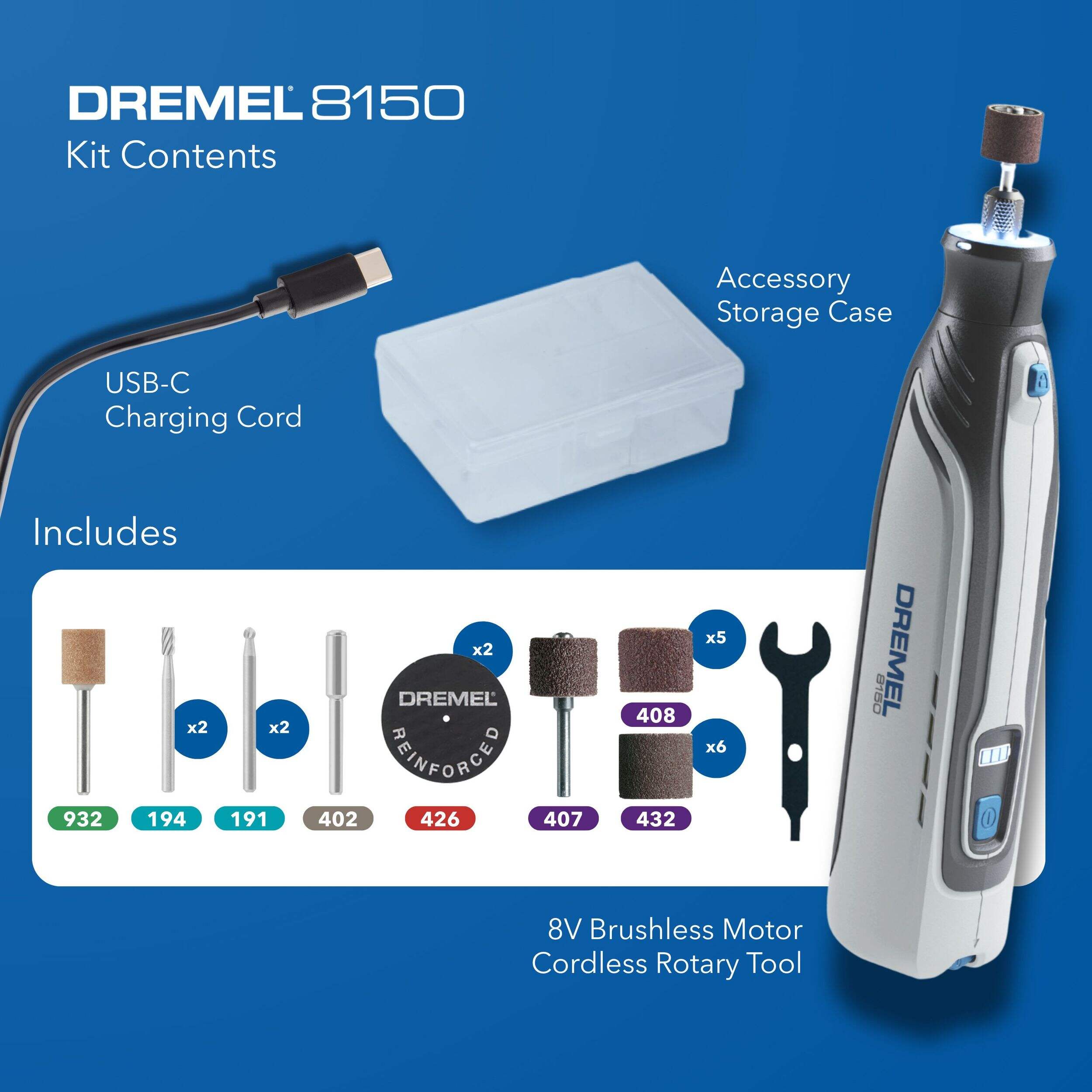 The Dremel 8150-N/20 8V Brushless USB-C Rechargeable Rotary Tool Kit is designed for precision. The included rotary tool's compact size and ergonomic design make it easy to handle, while an integrated LED work light ensures optimal visibility on the job. Perfect for hobbyists and DIY enthusiasts alike, this rotary tool kit includes everything you need to get started on a wide array of home improvement projects.