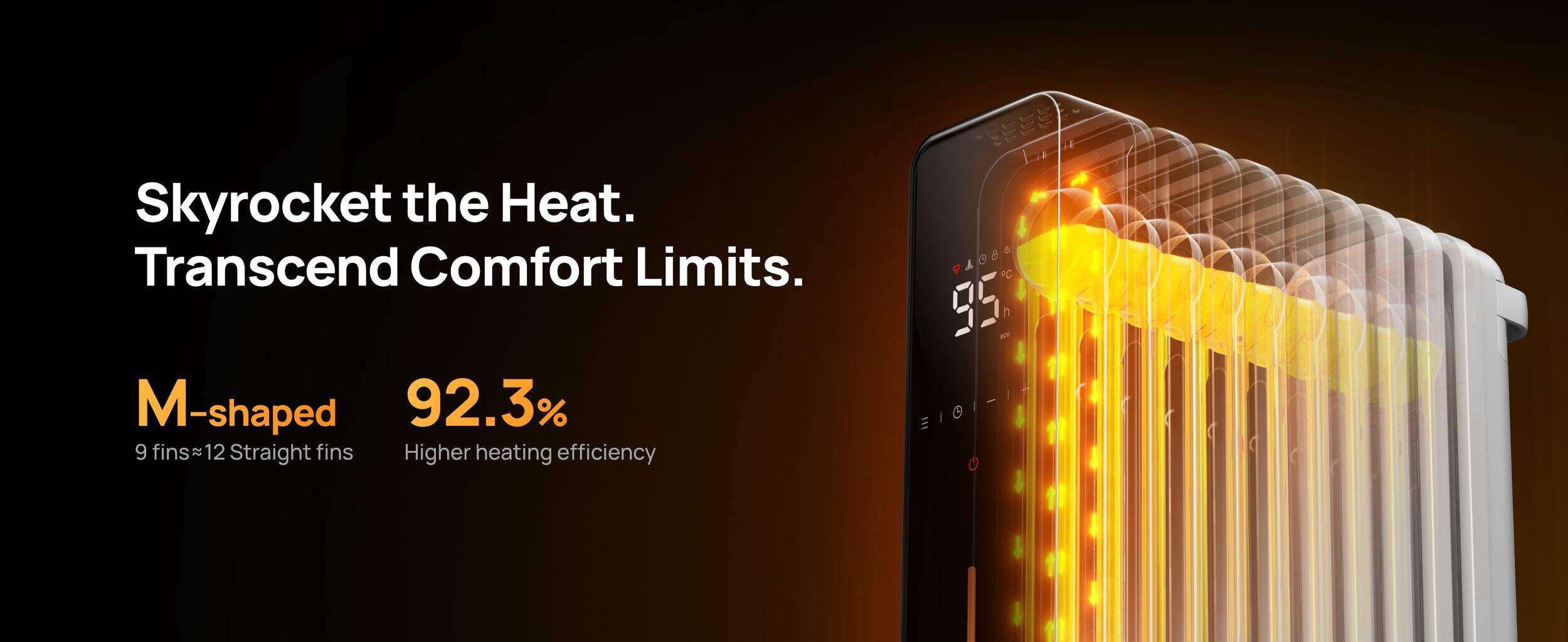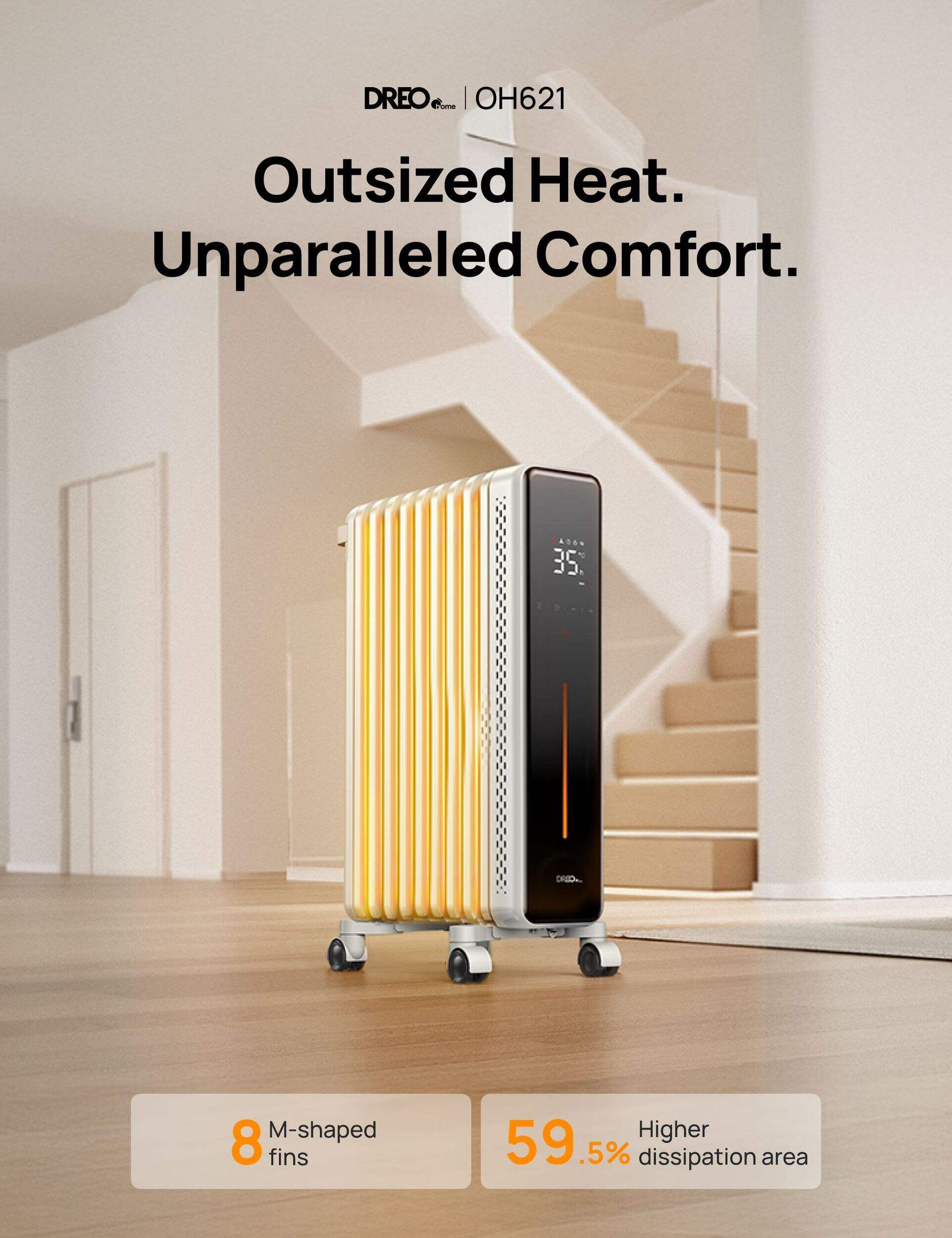 Fast & Safe Heating in One: DREO's oil-filled radiator heater features an eight M-shaped fin design that increase the heat dissipation area by 59.5%, delivering wide, even warmth while keeping the surface cool to the touch — perfect for safe, comfortable heating throughout your home.