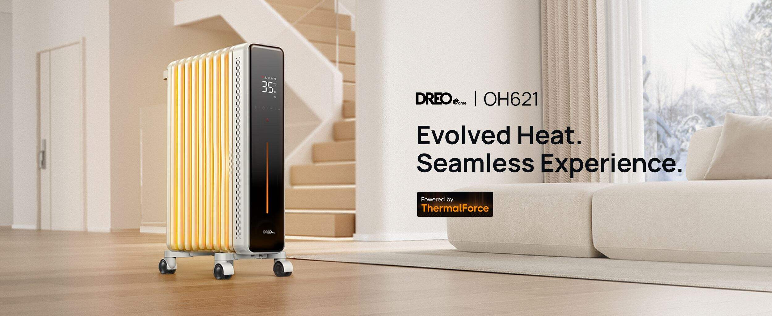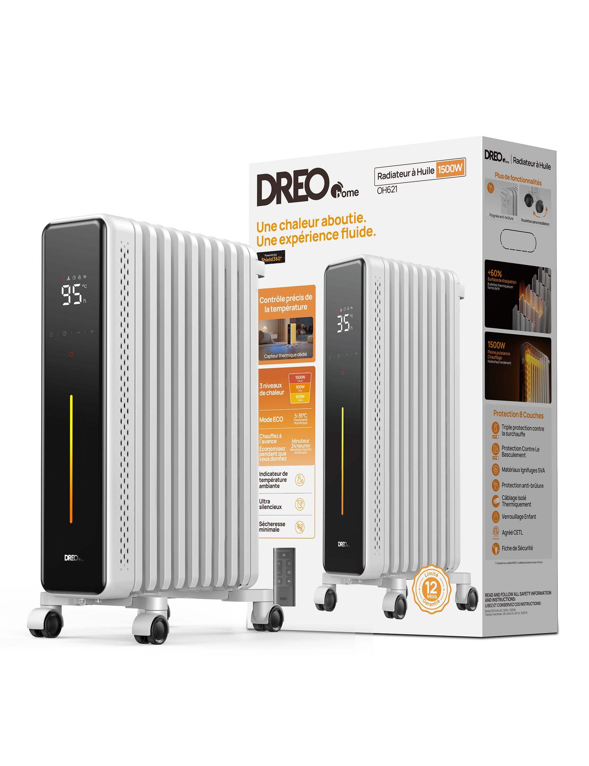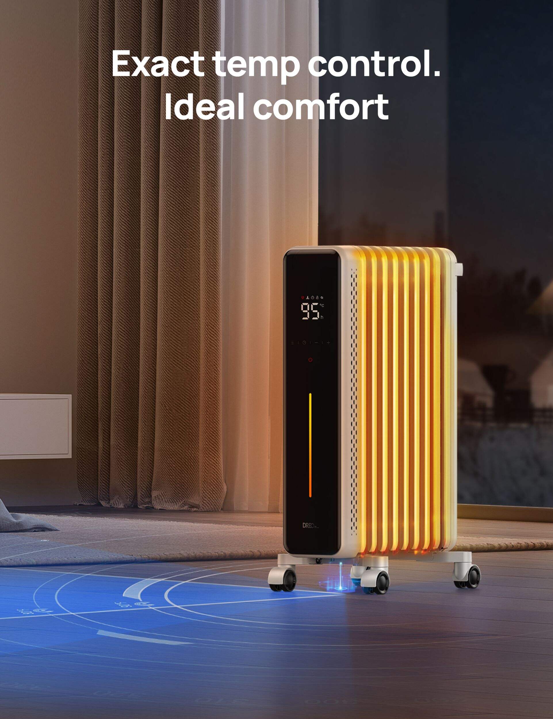 The DREO Home Oil-Filled Radiator Heater delivers fast, even warmth with enhanced safety and energy efficiency. Its eight M-shaped fins expand heat coverage by 59.5%, while 1500W of power and multiple heat settings, including Smart ECO mode, let you customize comfort and cut energy use. Built-in safety features like tip-over protection, overheat protection, and a cool-touch exterior ensure peace of mind.