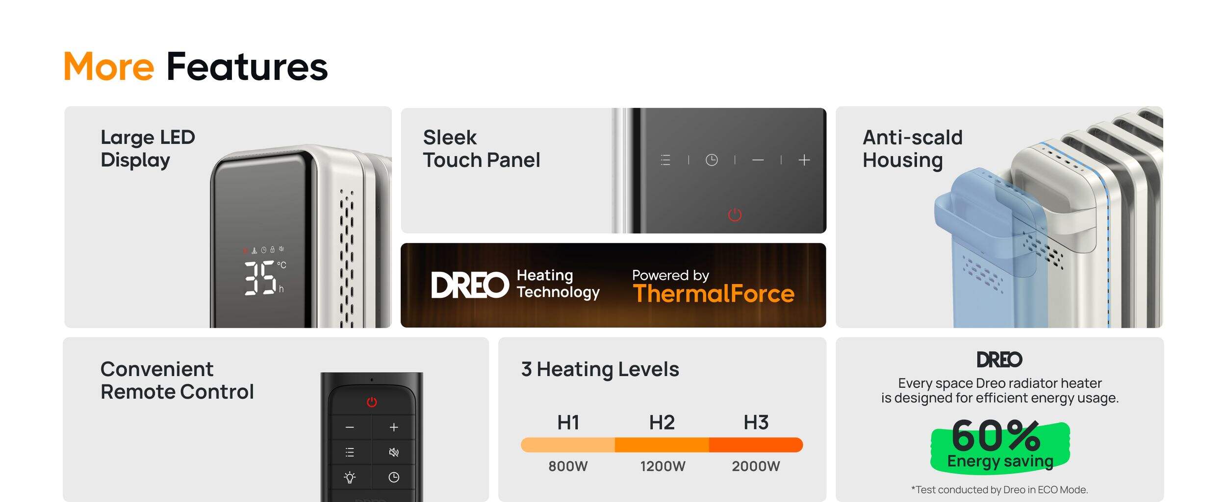Your Heat, Your Pick: Choose from 600W, 900W, 1500W, or Smart ECO mode, with precise temperature control from 41°F to 95°F in 1°F increments. ECO mode adapts to room conditions, maintaining comfort while reducing energy consumption.