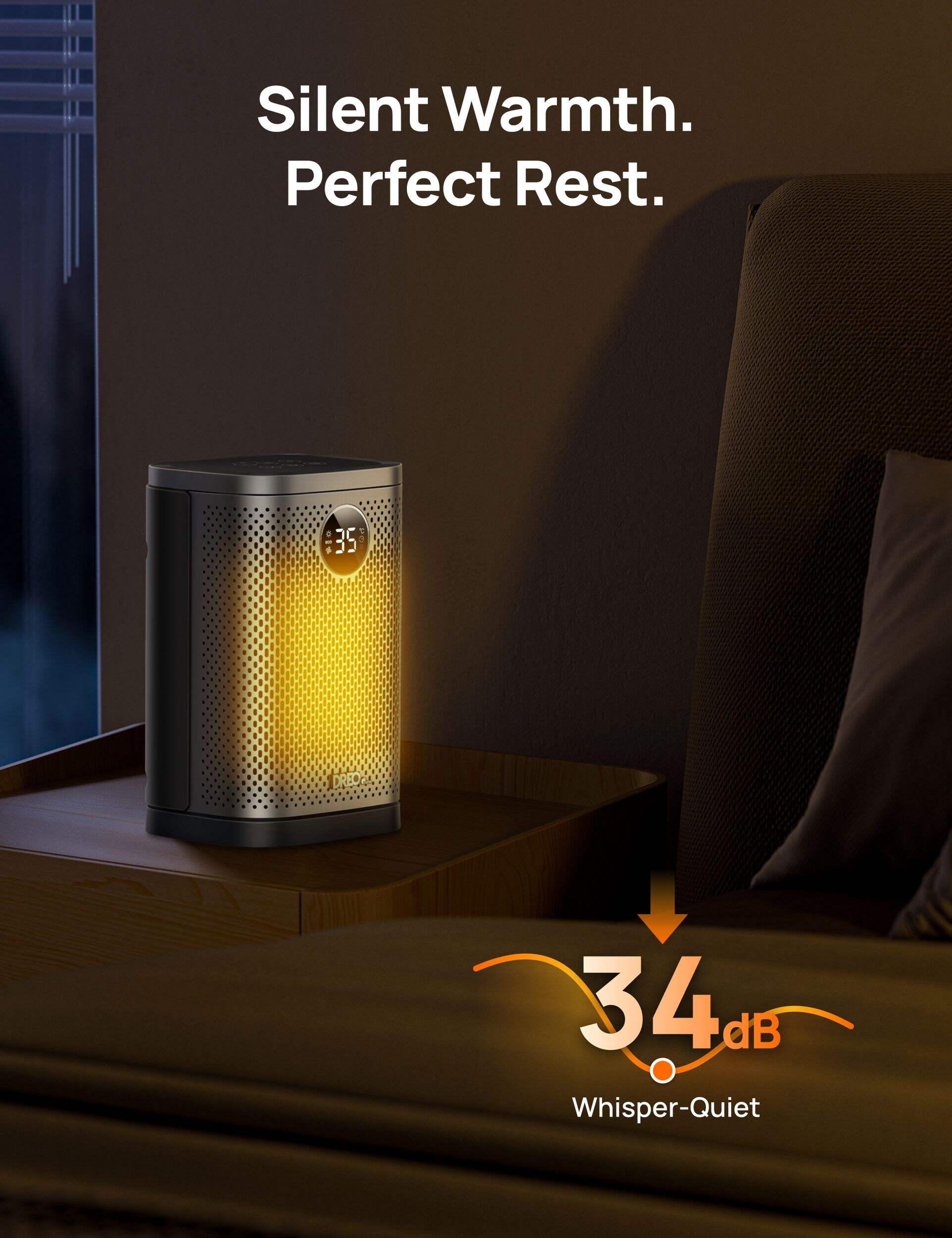 Silent Comfort in Every Corner: With its 70˚ wide oscillation, this heater ensures warmth is spread to every corner of your room. Operating at a mere 34dB, literally quieter than a library, it creates a calm, undisturbed atmosphere for sleep, focus, or relaxation. Perfect for bedrooms, nurseries, and spaces where silence matters.