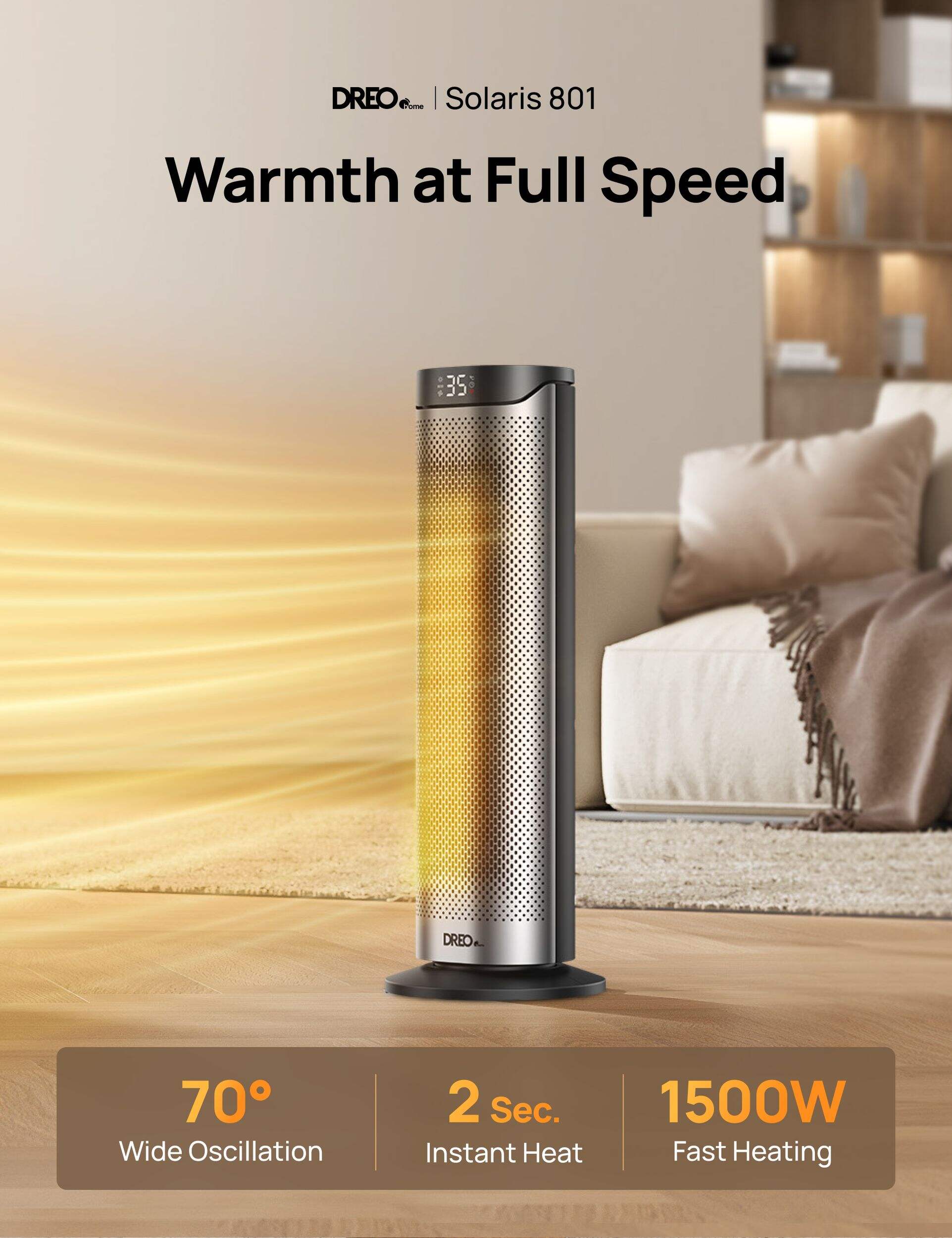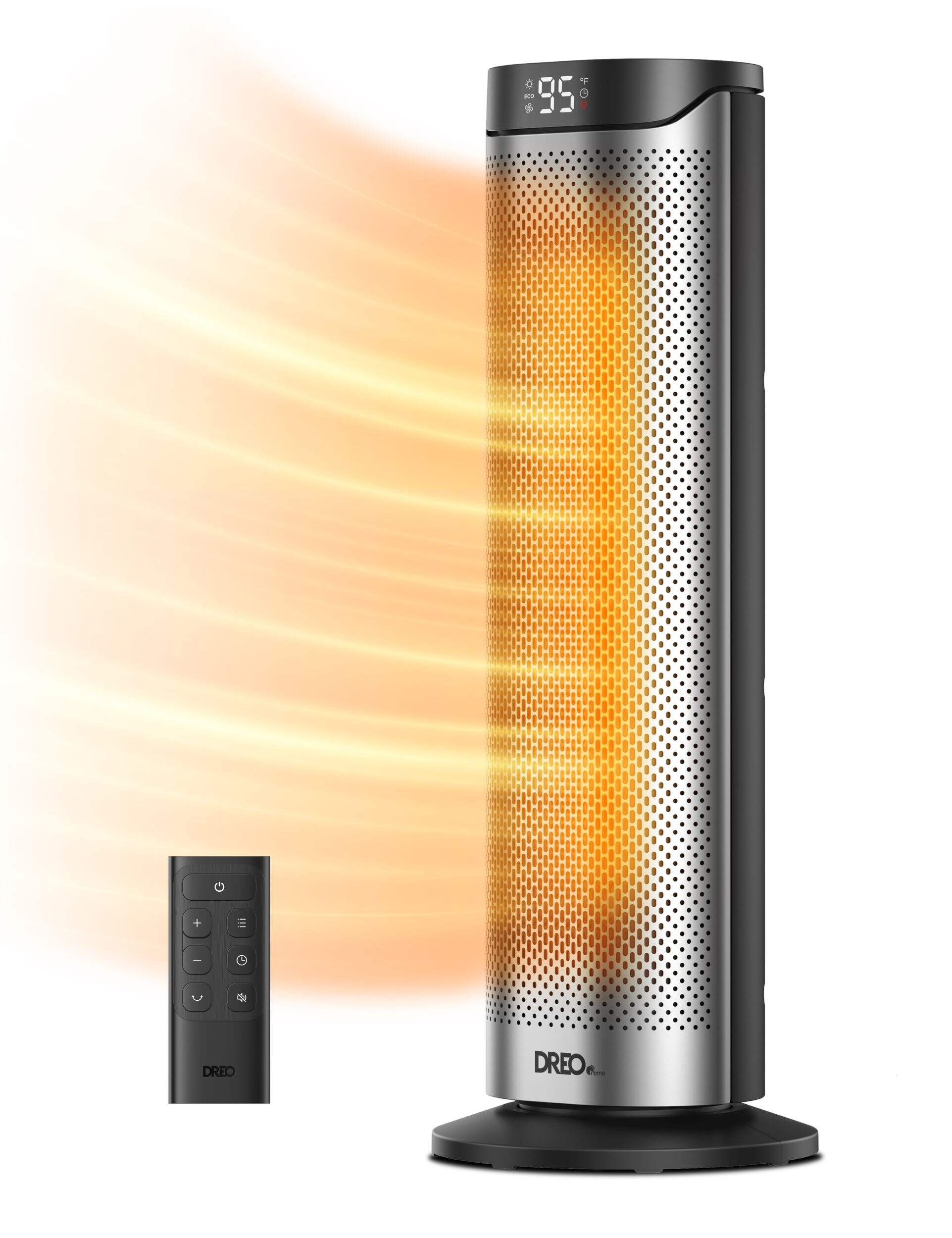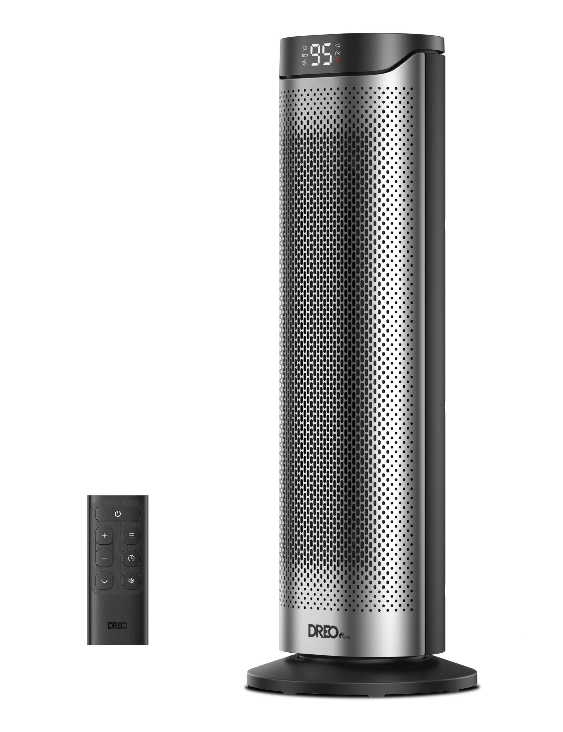 The DREO Home Solaris heater delivers powerful 1500W PTC ceramic warmth that fills your entire room in seconds, thanks to its dual DC motor and 70° widespread oscillation. Whether you're working, sleeping, or relaxing, it ensures whisper-quiet comfort at just 34dB, perfect for bedrooms, nurseries, or home offices. Its 8-layer safety system provides peace of mind with built-in protections against tipping, overheating, and accidental touches. Easily tailor your warmth from 41–95°F with 1°F precision and enjoy energy savings with ECO mode that adjusts output to your room’s needs. With intuitive controls, 3 heat levels, 3 fan speeds, and a 12-hour timer plus remote, comfort is always just a button away.