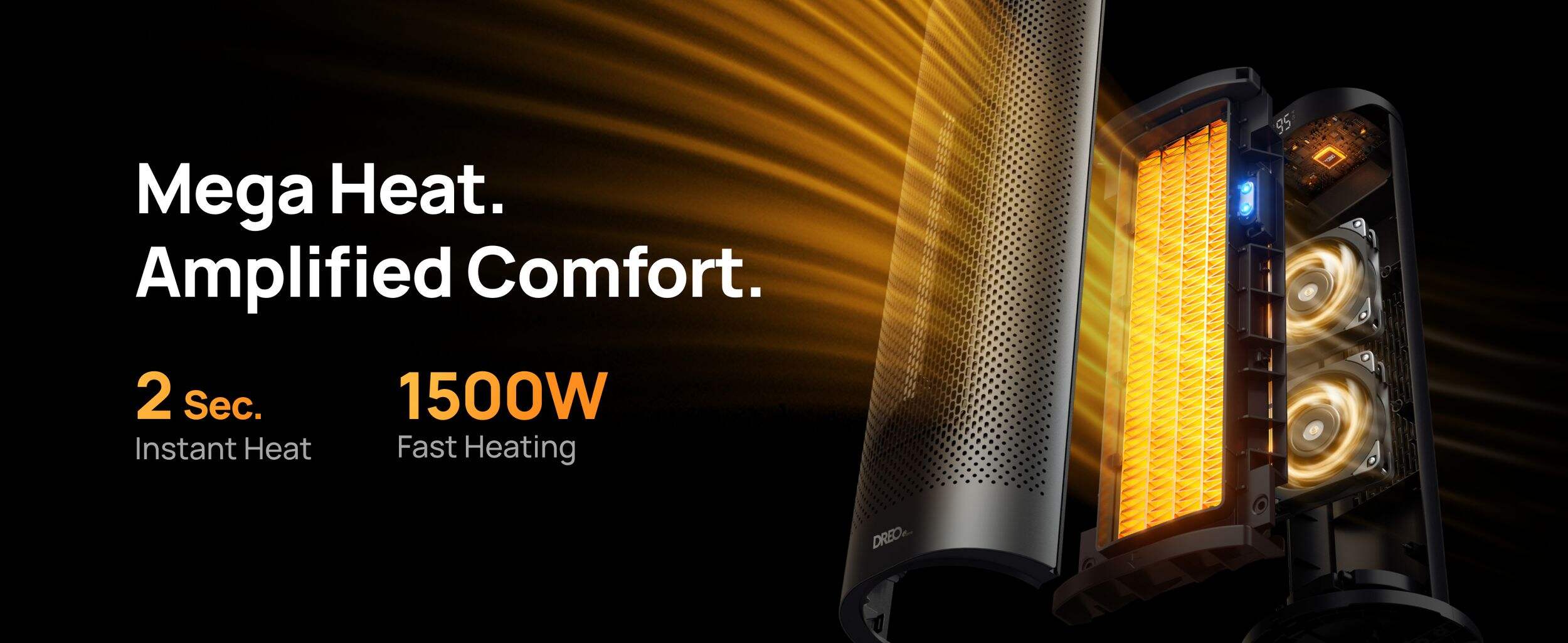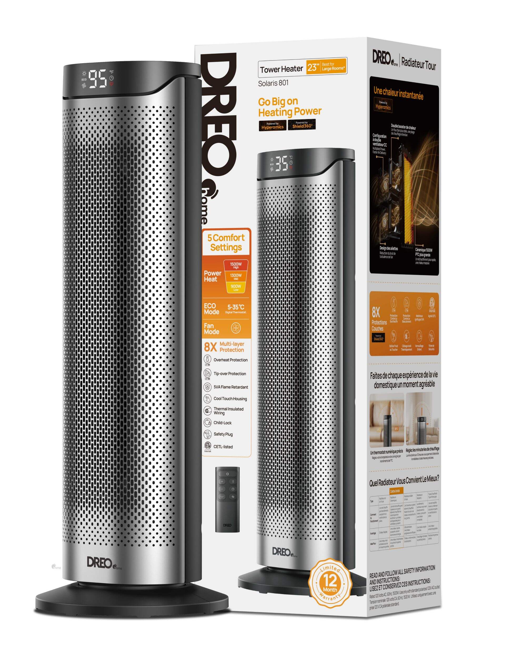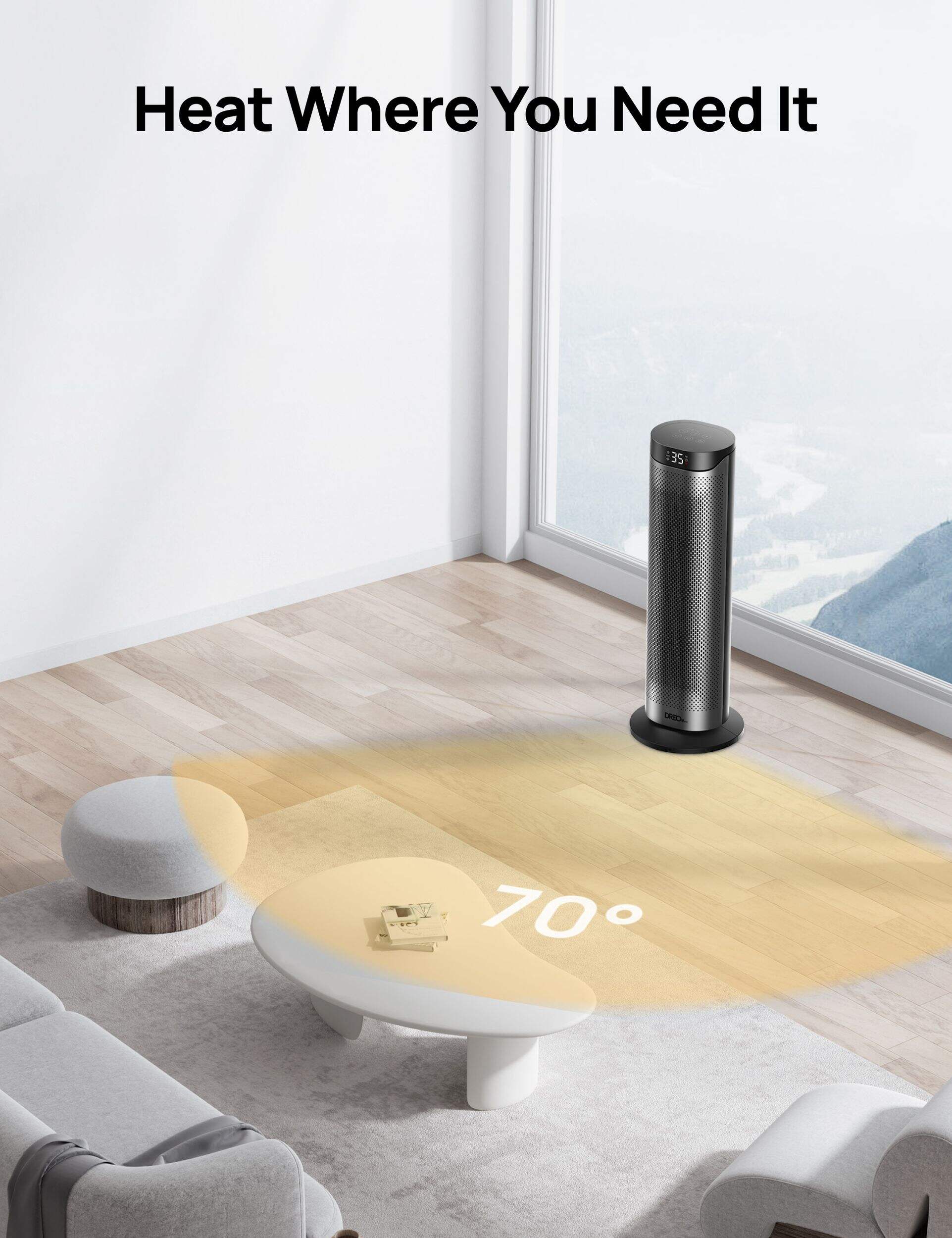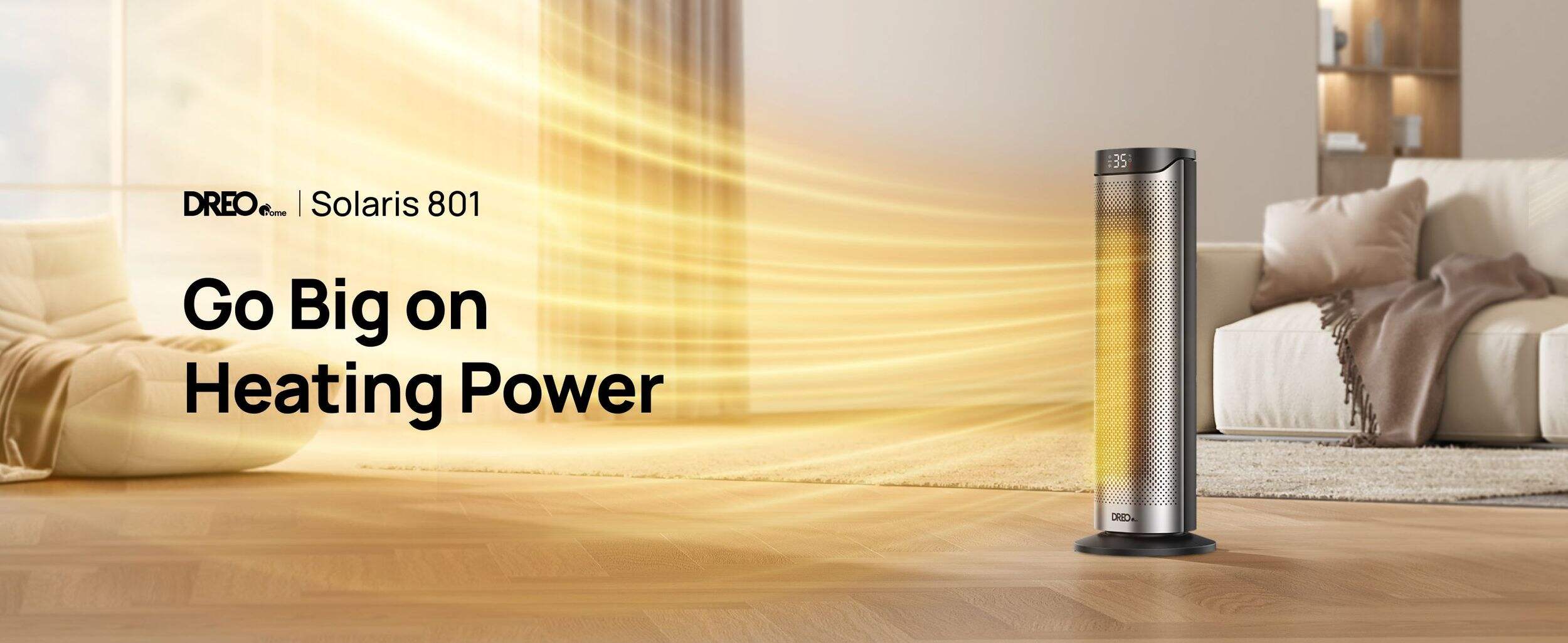 The DREO Home Solaris heater delivers powerful 1500W PTC ceramic warmth that fills your entire room in seconds, thanks to its dual DC motor and 70° widespread oscillation. Whether you're working, sleeping, or relaxing, it ensures whisper-quiet comfort at just 34dB, perfect for bedrooms, nurseries, or home offices. Its 8-layer safety system provides peace of mind with built-in protections against tipping, overheating, and accidental touches. Easily tailor your warmth from 41–95°F with 1°F precision and enjoy energy savings with ECO mode that adjusts output to your room’s needs. With intuitive controls, 3 heat levels, 3 fan speeds, and a 12-hour timer plus remote, comfort is always just a button away.