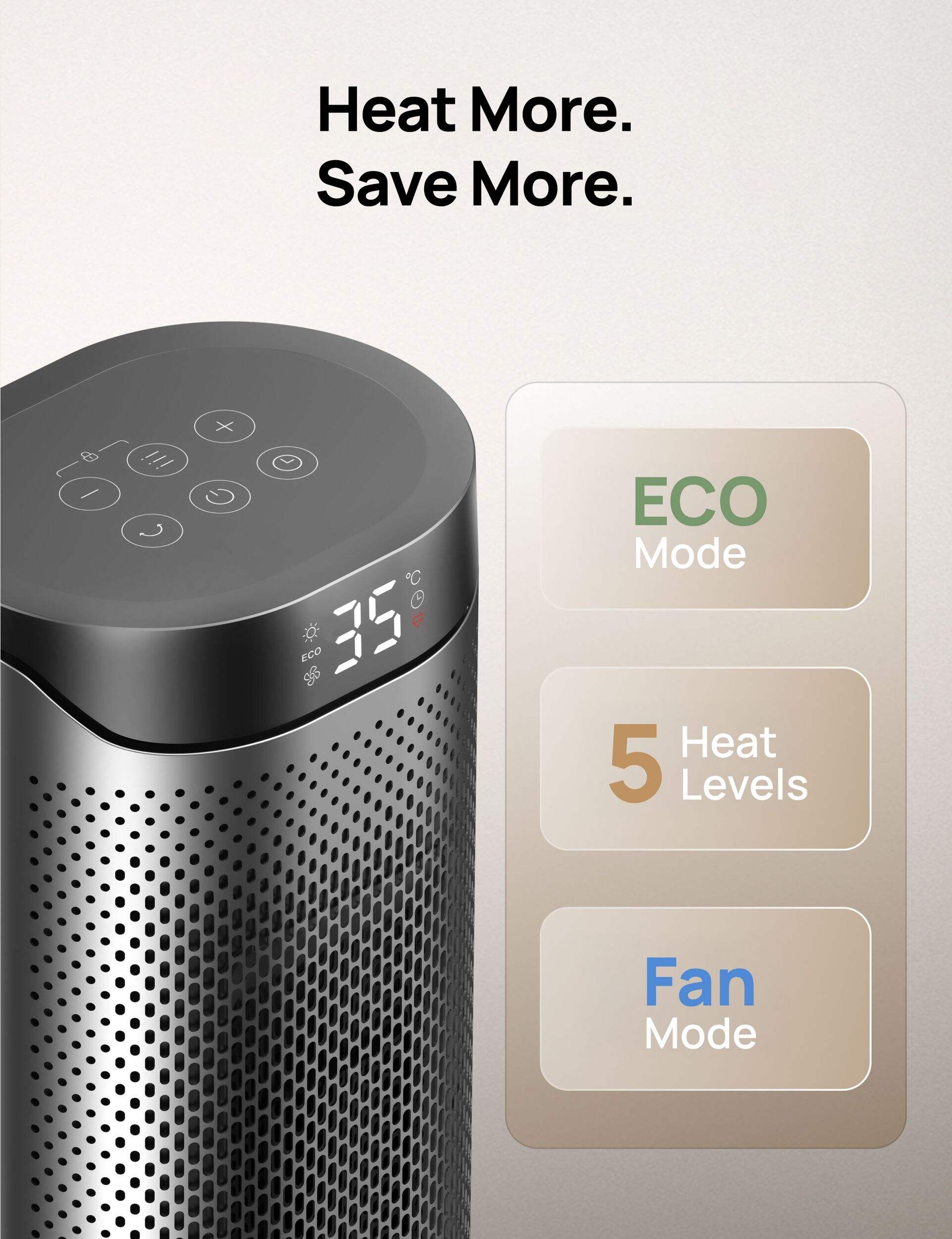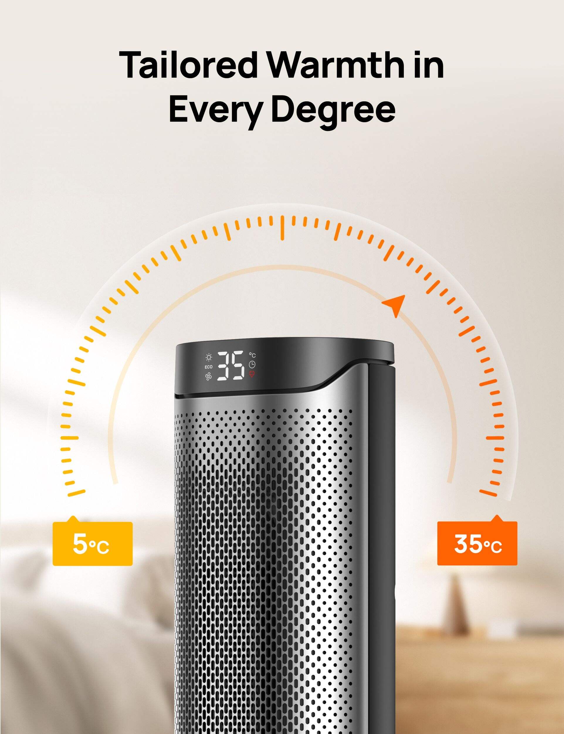 Tailored Warmth, Lower Bills: Adjust the temperature from 41-95°F in 1°F increments to create a perfectly personalized climate. With ECO mode, the heater automatically adapts its heat output, saving energy without sacrificing comfort.