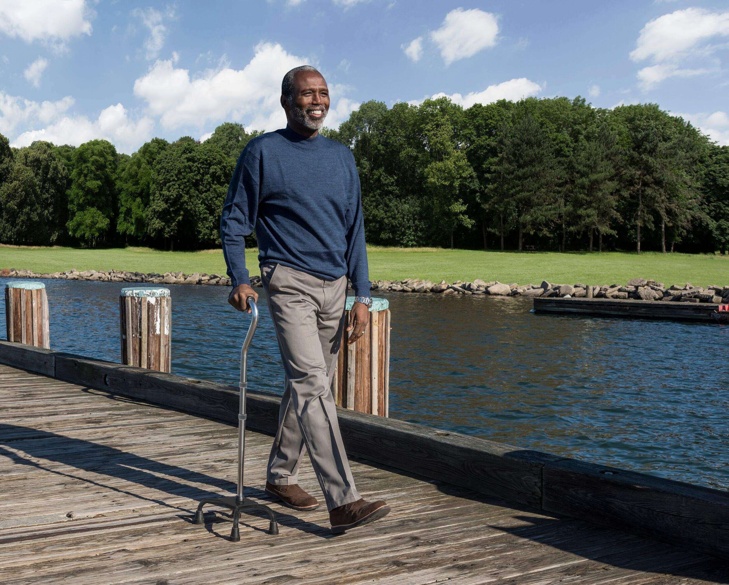 Equipped with a four-point base and offset handle, the cane provides added stability and adjusts from 30-39” to accommodate varying user heights