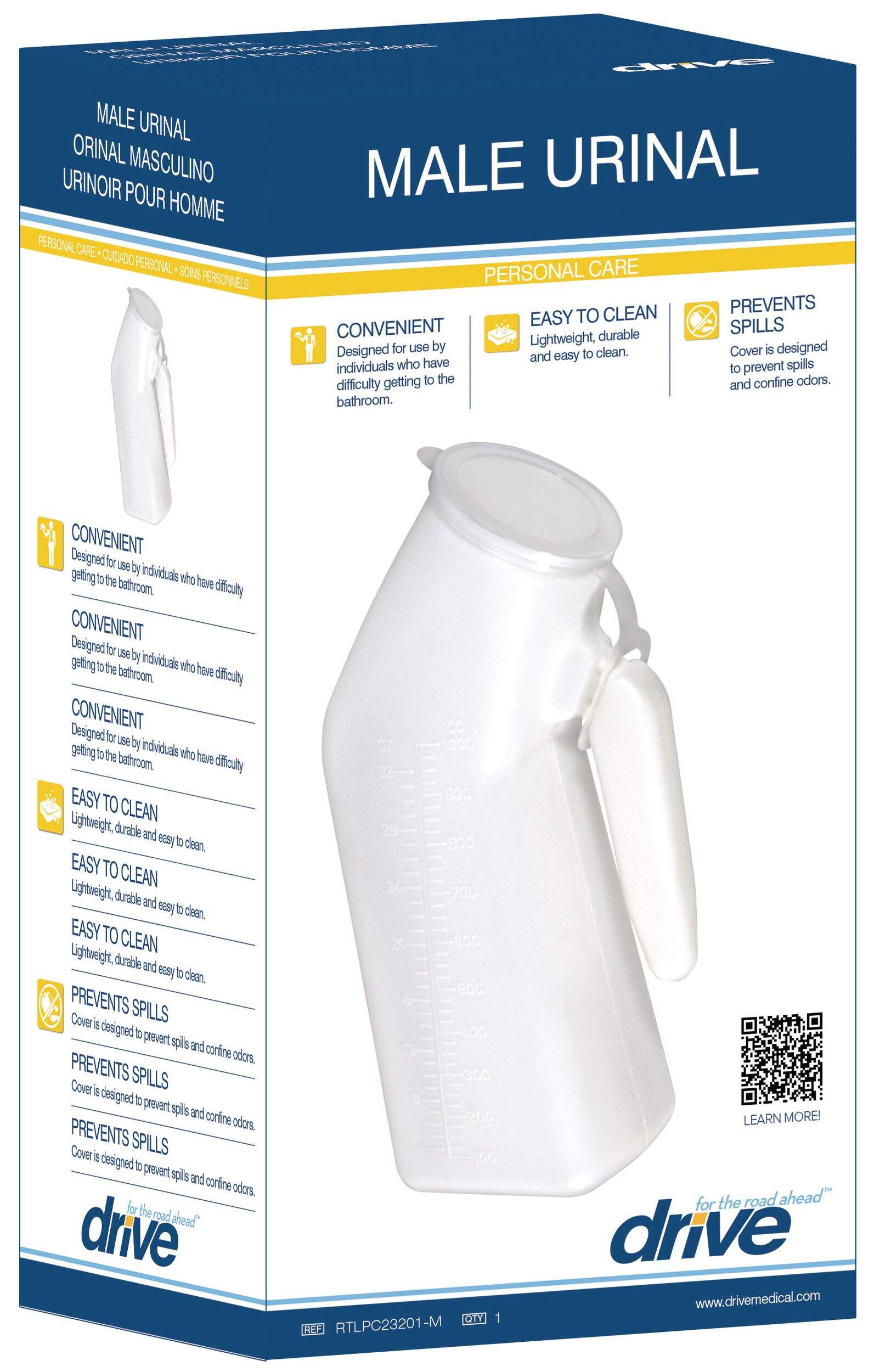 The Drive Male Urinal provides convenient and sanitary relief for men who have difficulty accessing the bathroom. Designed to prevent spills and leaks, this urinal features a sturdy, easy-grip handle that enables use in multiple positions. The urinal is easy to clean and the snap-on cap helps contain odours when not in use.