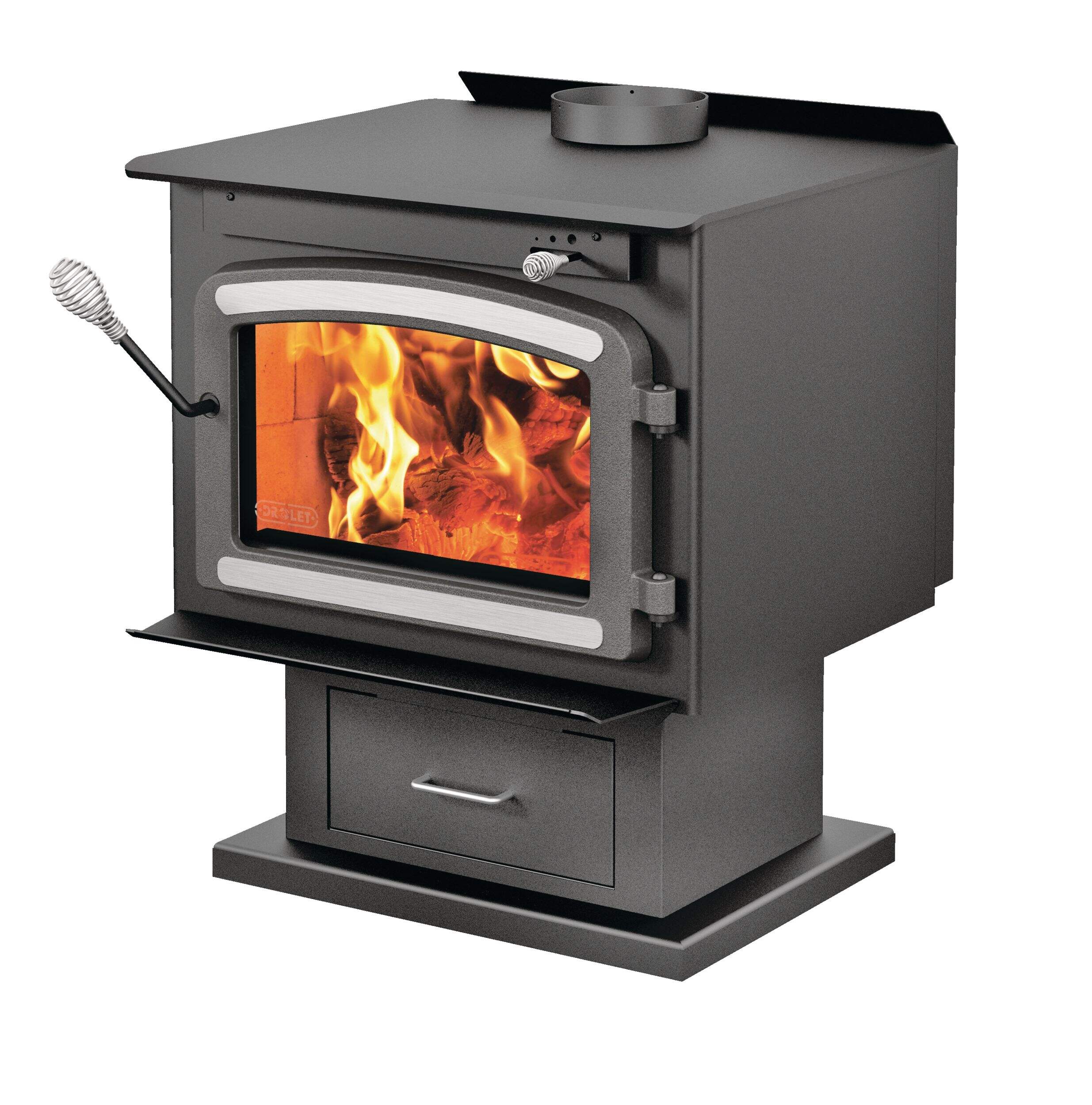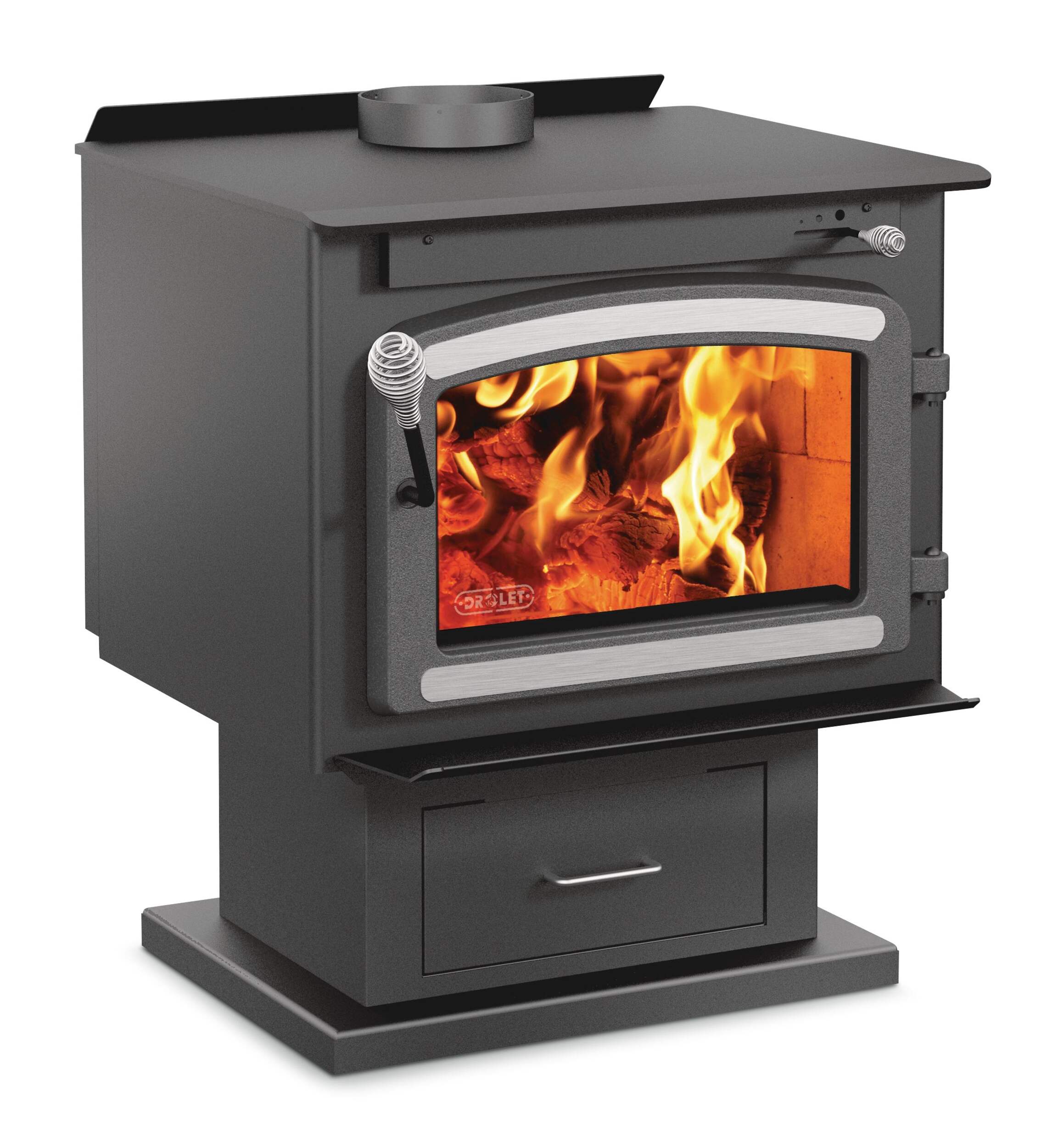 Drolet High Efficiency Classic EPA Wood Stove with Blower is finished in a stylish metallic black look