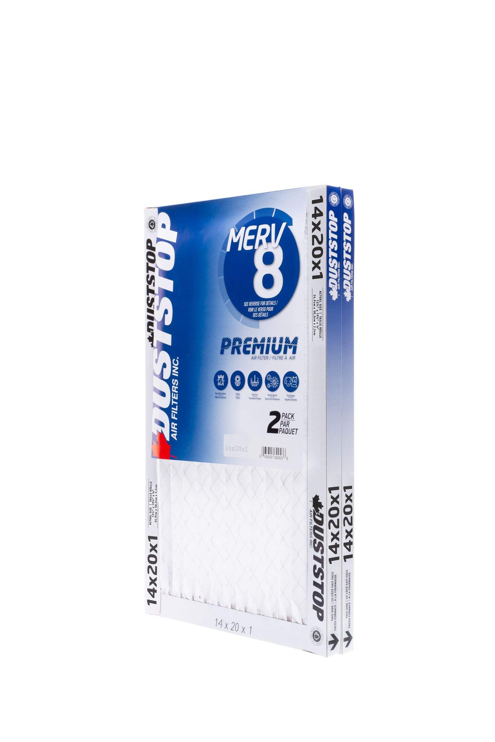These premium Duststop air filters are perfect for tidying up any home. Measuring 14 by 20 inches, these MERV 8 rated filters will trap dust, pollen and other allergens before they circulate through your HVAC system. Install these dust-stopping filters and say goodbye to sneezing fits, itchy eyes and stuffy noses caused by household particles floating through the air. These economical 2-pack filters are great for topping up between more heavy-duty cleanings of your ducts and vents.