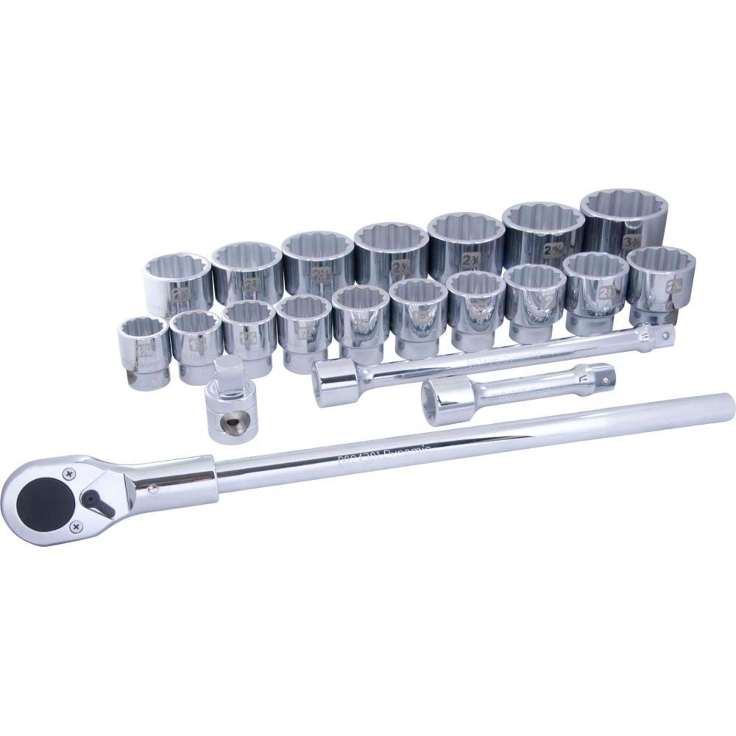Set contains: 17 Regular SAE Sockets: 1-7/16", 1-1/2", 1-5/8", 1-11/16", 1-3/4", 1-13/16", 1-7/8", 2, 2-1/8", 2-3/16", 2-1/4",2-3/8", 2-1/2", 2-5/8", 2-3/4", 2-15/16", 3-1/8, 8" & 16" Extension, Sliding T-Head, 24 Tooth Ratchet and metal case