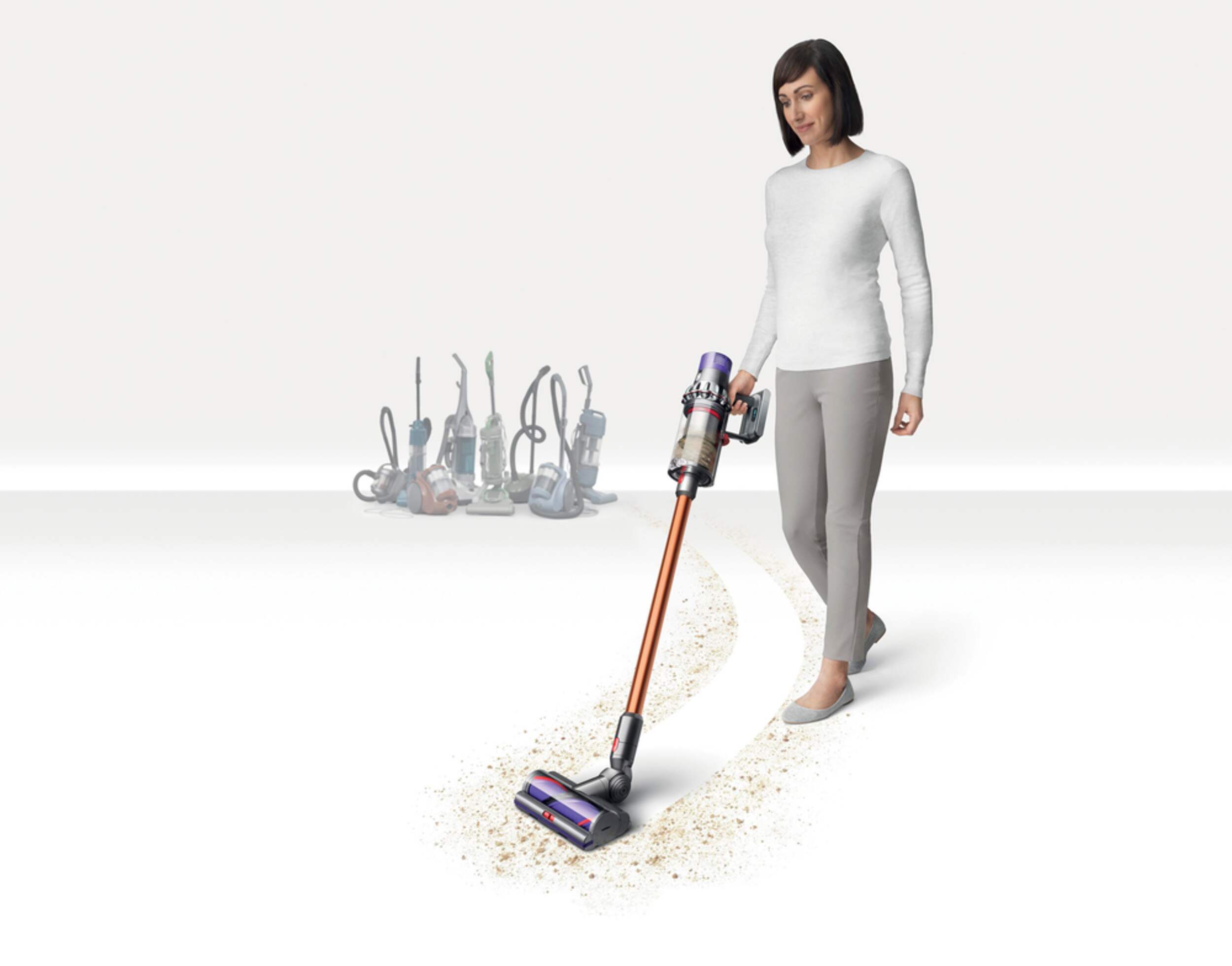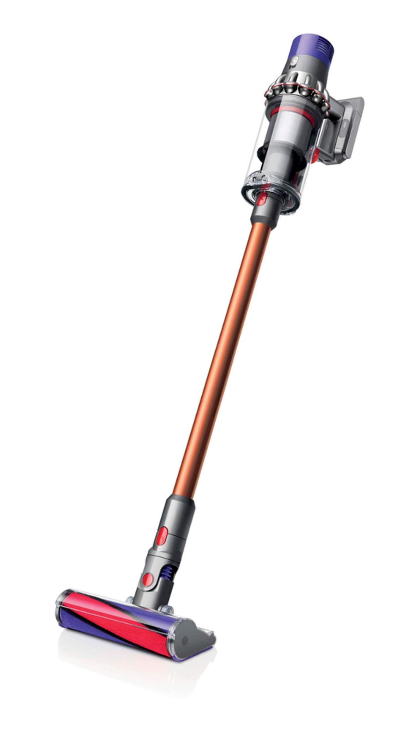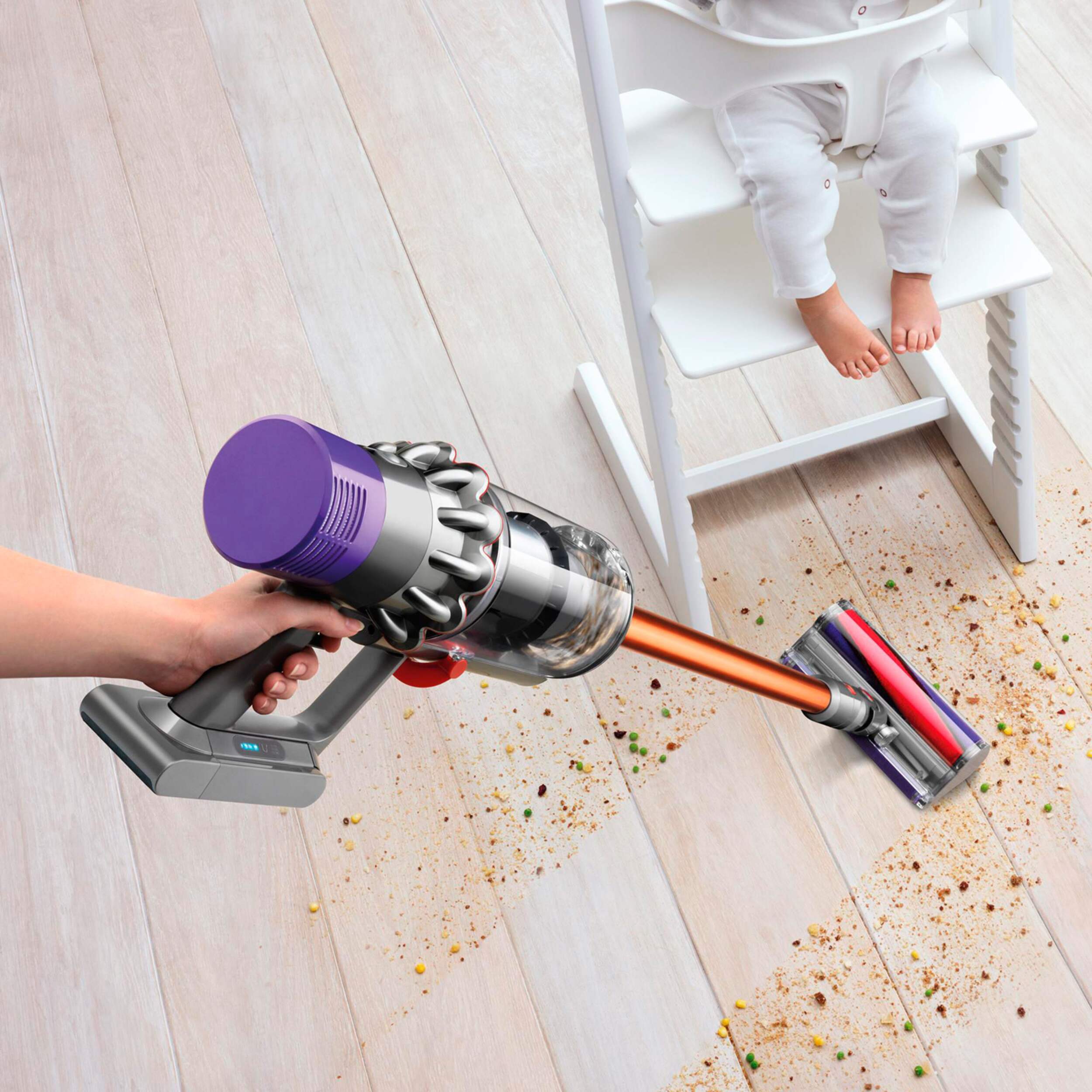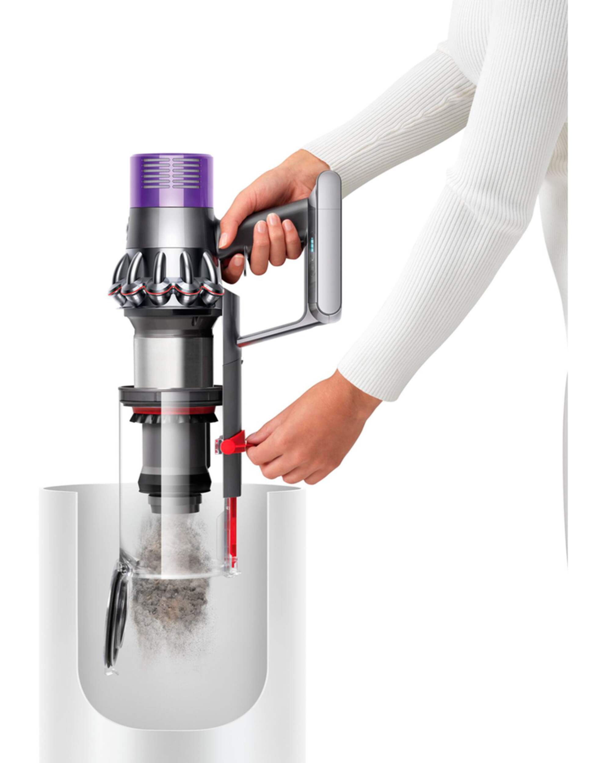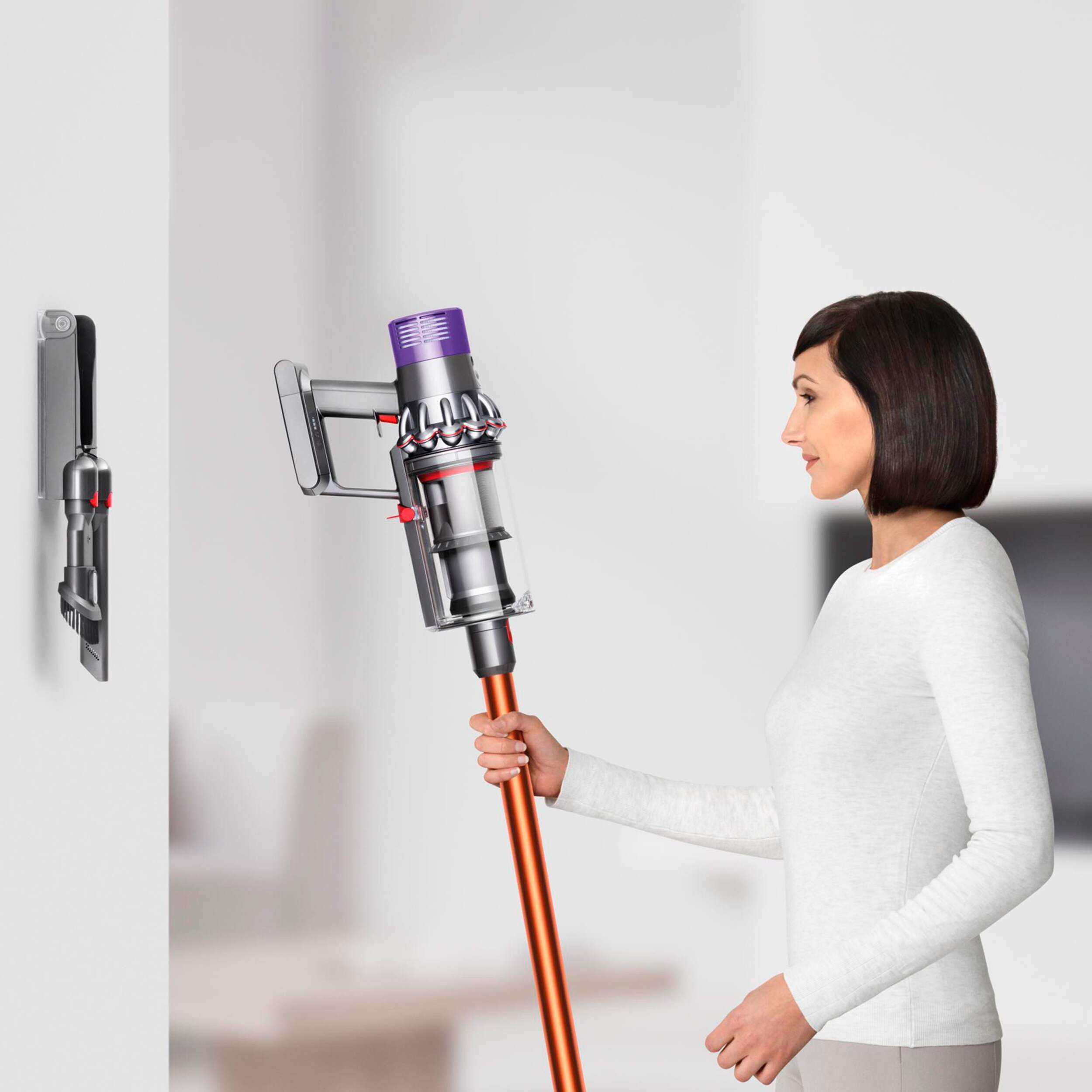 With big machine suction power*, and a 40% bigger bin for big cleans.** The Dyson Cyclone V10 Absolute cord-free vacuum has the most powerful suction of any cord-free vacuum.*** The Dyson Cyclone V10 Absolute cord-free vacuum is engineered for whole home cleaning and comes with 2 cleaner heads and 4 tools for tough tasks. The torque drive cleaner head removes 25% more dust from carpets than our previous Dyson V8 Animal vacuum. It's our most powerful cleaner head yet. The soft roller cleaner head removes fine dust and large debris from hard floors. The Dyson Cyclone V10 Absolute cord-free vacuum has powerful suction to deep clean carpets and remove ground-in dirt, with three power modes, to suit any task on any floor type. The Dyson Cyclone V10 Absolute cord-free vacuum quickly transforms to a handheld for quick clean ups, spot cleaning and cleaning difficult places. *Suction tested to ASTM F558 at the flexible inlet. **Compared to Dyson V8 Absolute vacuum. ***Tested to ASTM F558, against cord-free stick market.