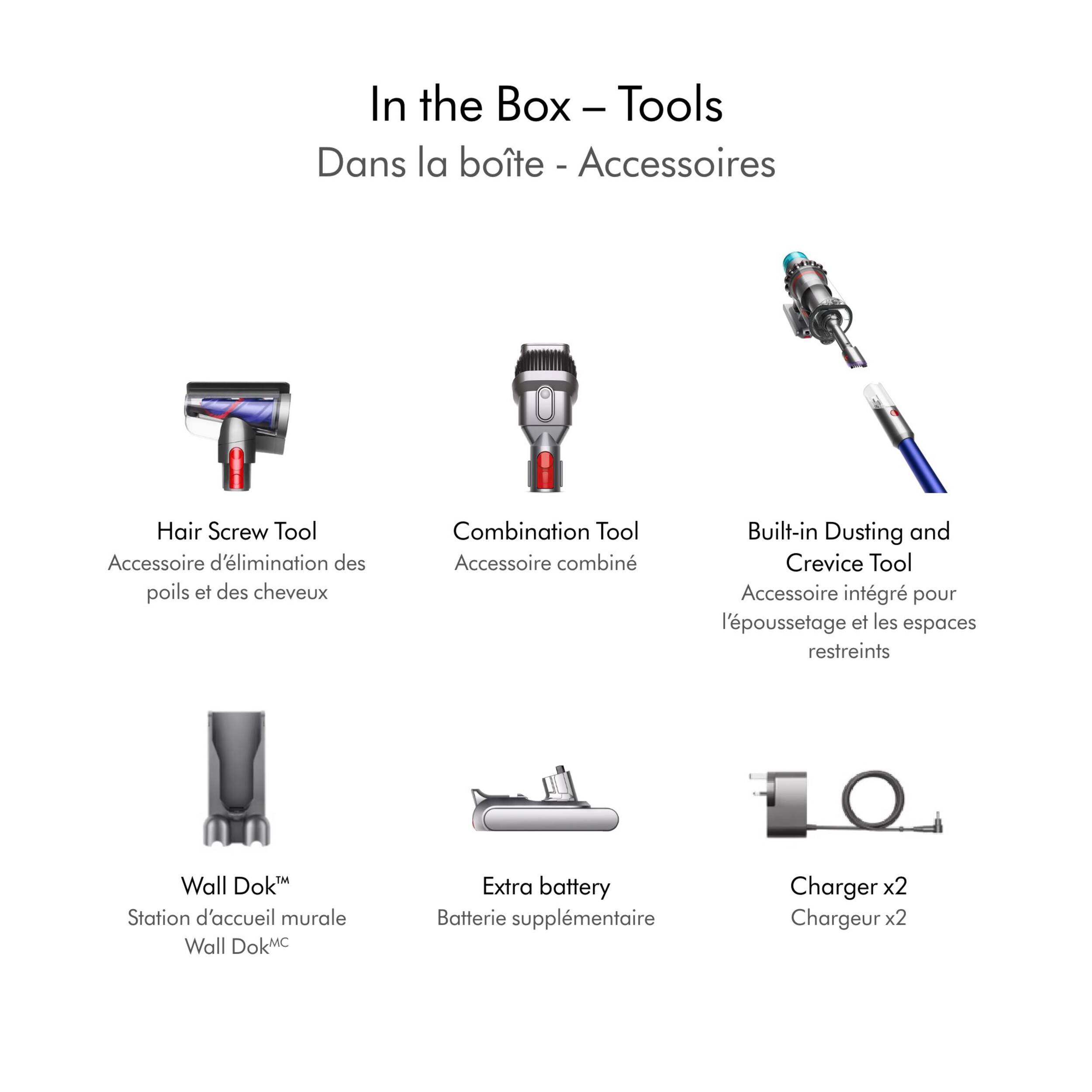 In the box: Dyson Outsize, Motorbar™ XL cleaner head, Fluffy Optic cleaner head, wall dock, combi tool, hair screw tool, extra battery, 2 chargers