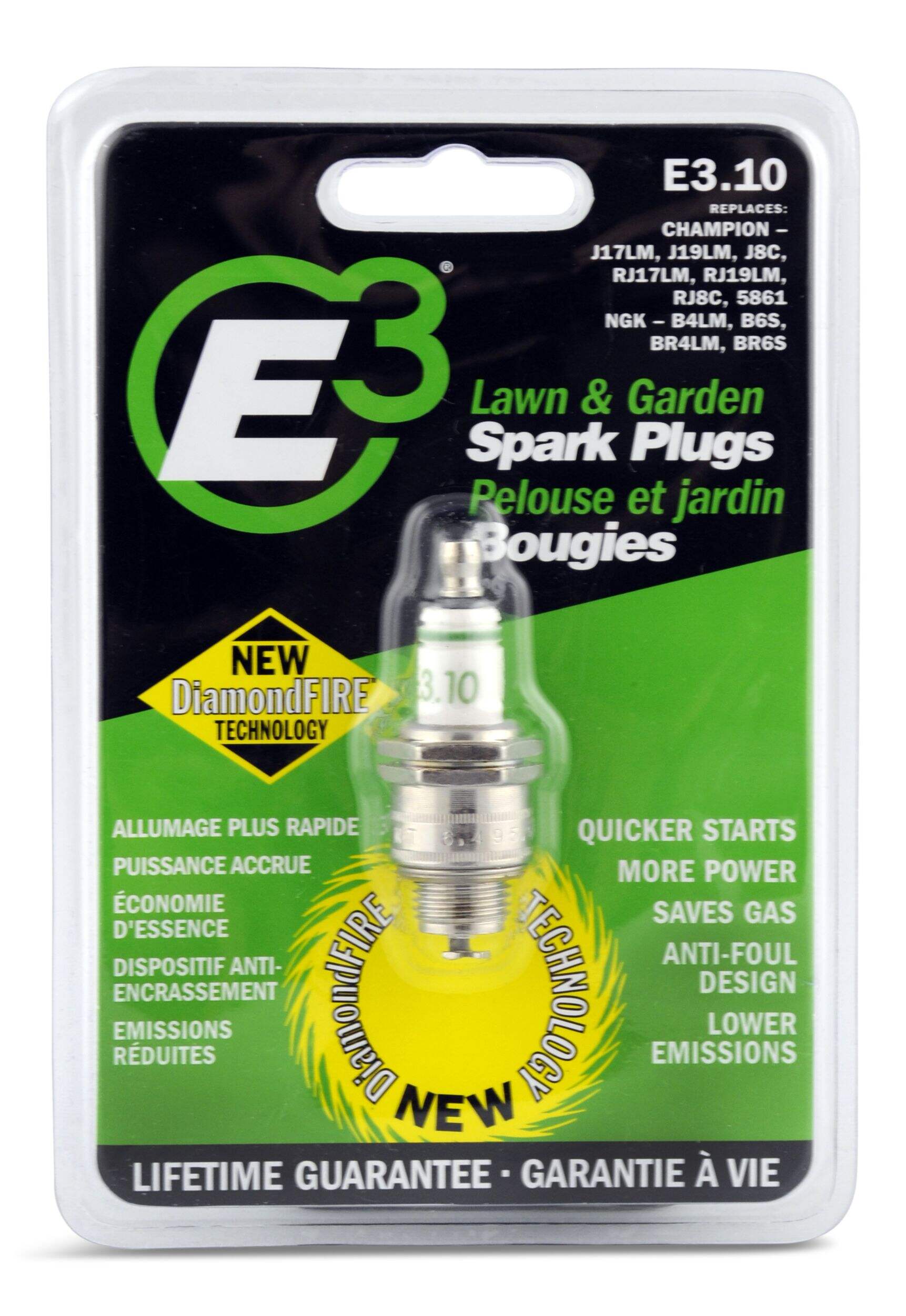 These E3 Replacement Spark Plugs feature DiamondFire technology for truly hassle-free performance. Providing better ignition, these plugs discharge properly and maintain a defect-free composition throughout the lifespan of your engine. Expect quicker starts, increased power output, fuel savings, resistance to fouling, and lower emissions. You'll gain up to 12% increased power over other brands in 2- and 4-stroke engines thanks to higher overall efficiency. These plugs will pay for themselves by using up to 13% less gas. The plugs also emit 58% less toxic emissions when compared to other spark plugs in the long run, making them an ecologically friendly option. These spark plugs are designed to replace the Champion J17LM, J19LM, and J8C, as well as NGK’s B4LM and B6S.