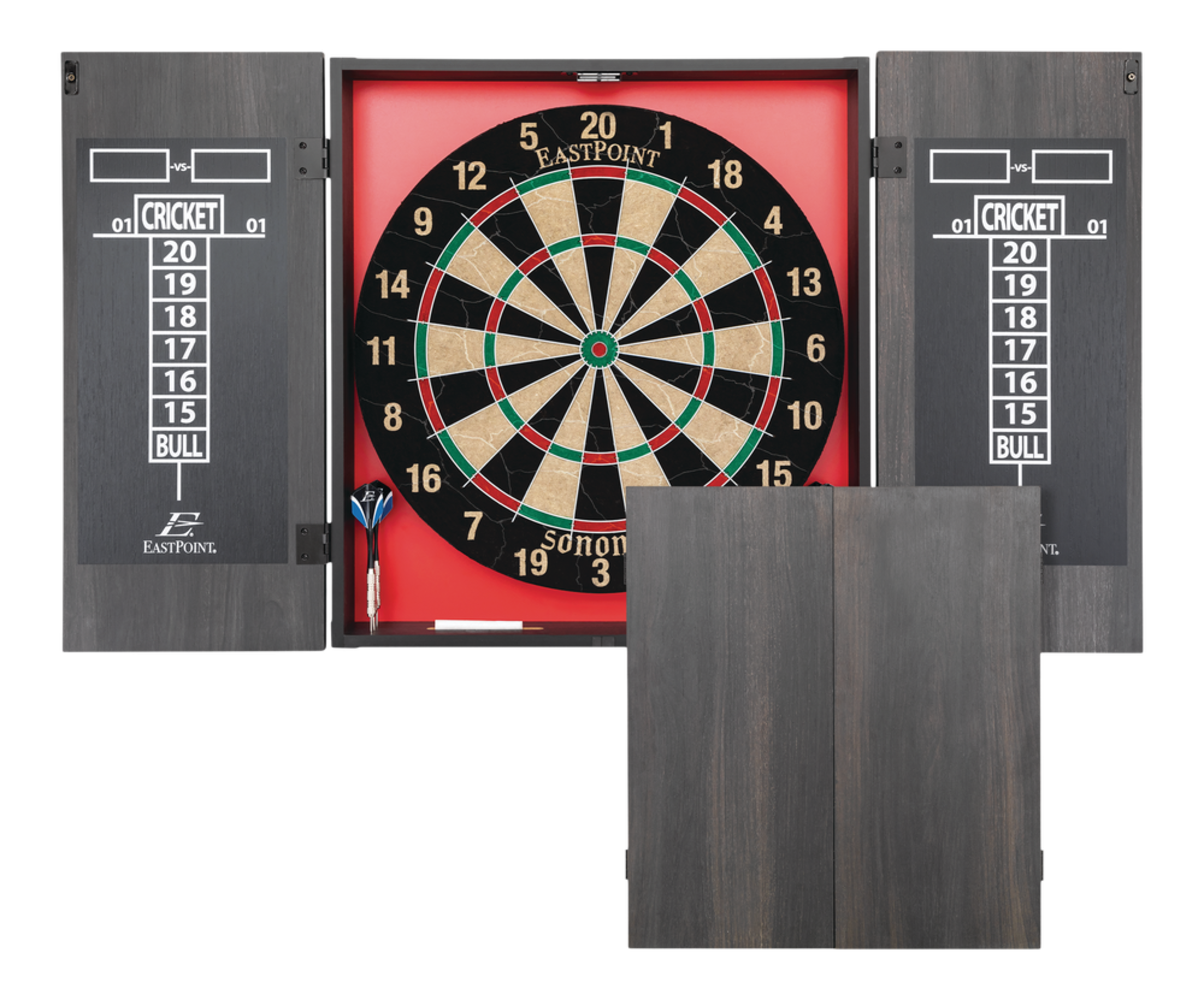 The EastPoint Sonoma Sisal Bristle Dartboard and Cabinet Set makes an excellent addition to game and family rooms for a new twist on game night. The easy-to-use dartboard features a self-healing sisal playfield and is designed to reduce bounce-outs, enhancing the flow of your game. This durable board is reinforced with a strong steel spider frame for durability, and is easy to mount on the wall. Dartboard set includes all the essentials for play.