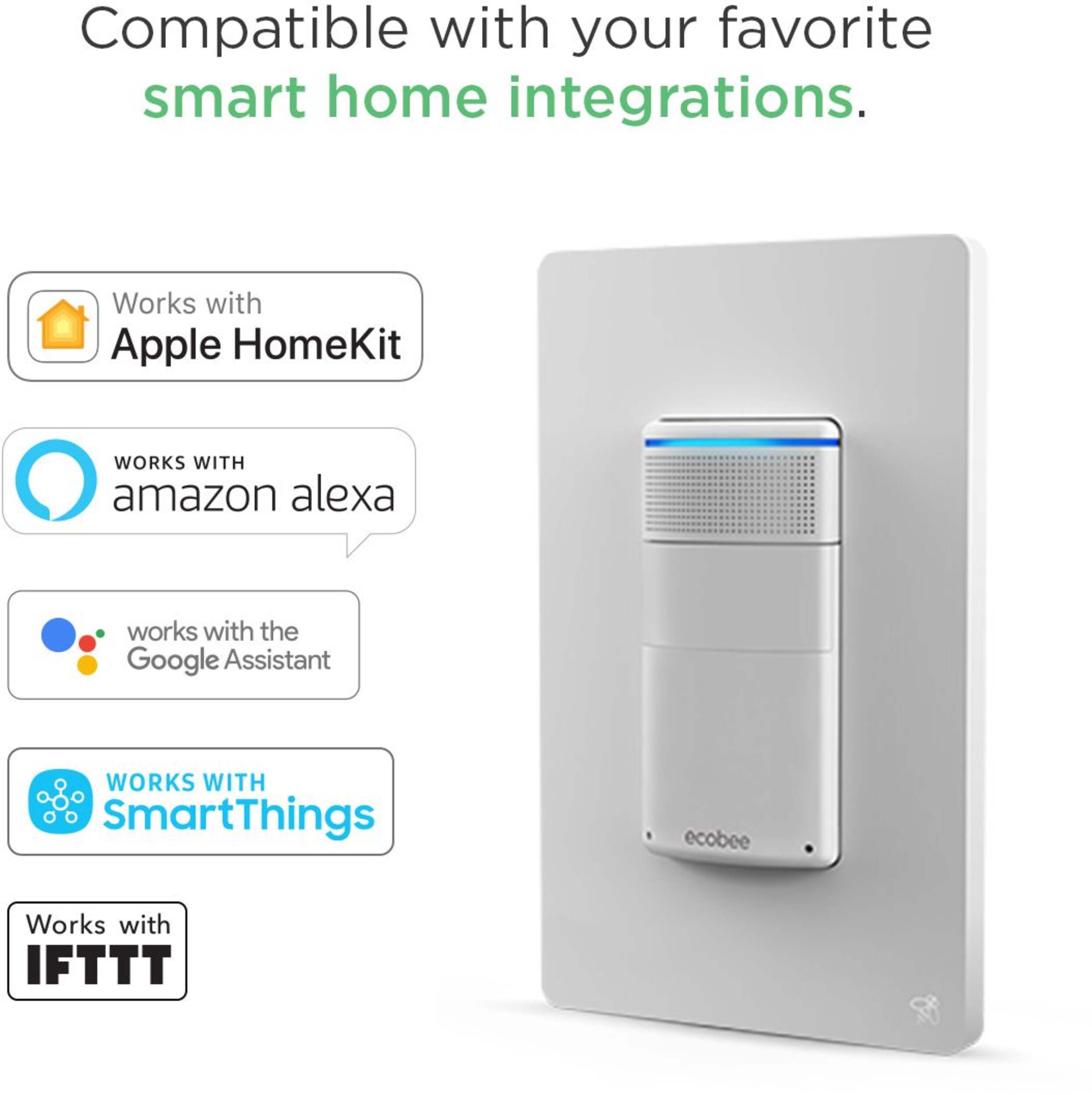 PLAYS WELL WITH OTHERS: ecobee Switch+ makes your smart home even smarter by seamlessly integrating with your favorite smart home platforms, including Apple HomeKit, the Google Assistant, Amazon Alexa, IFTTT, and Samsung SmartThings