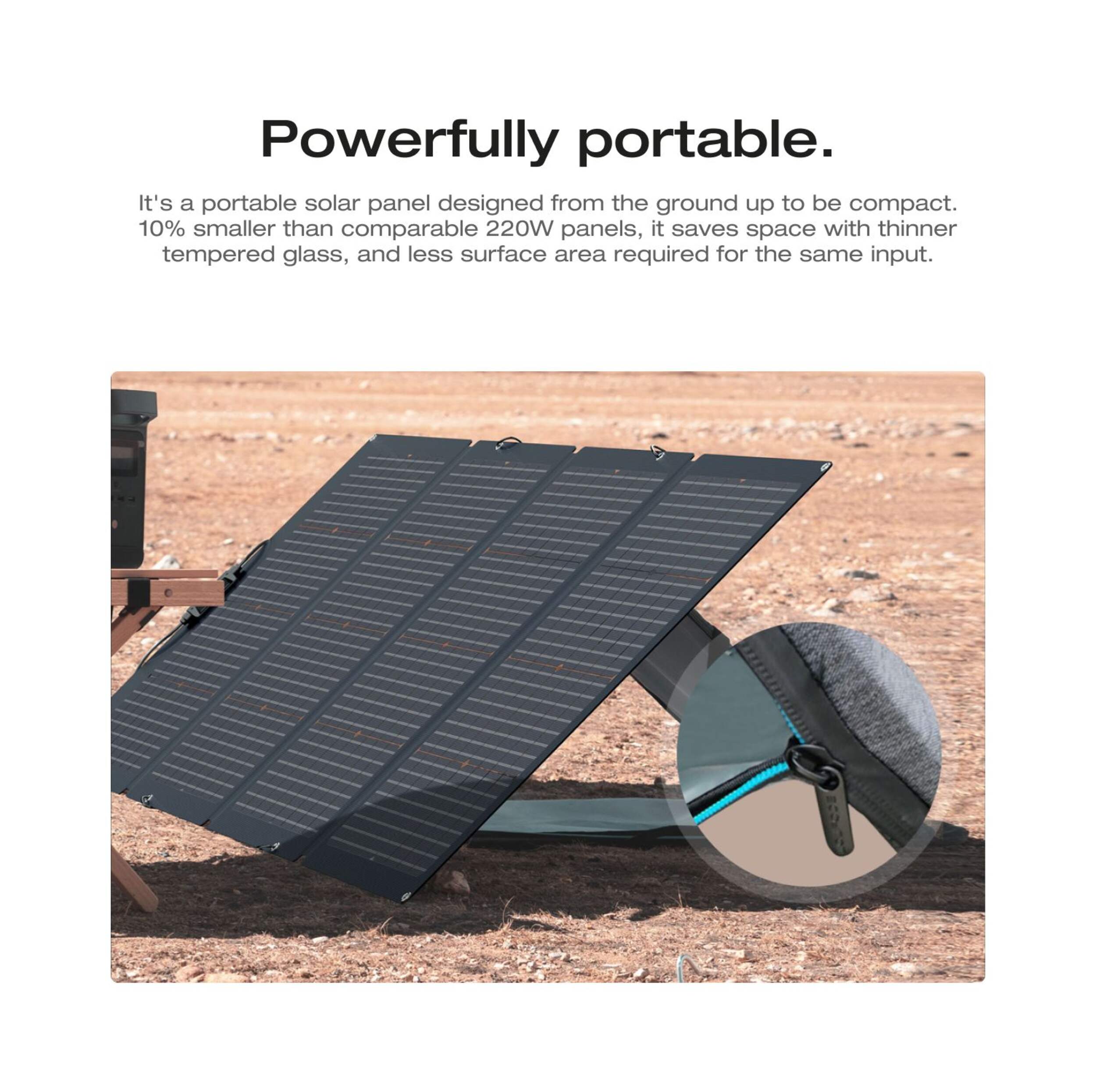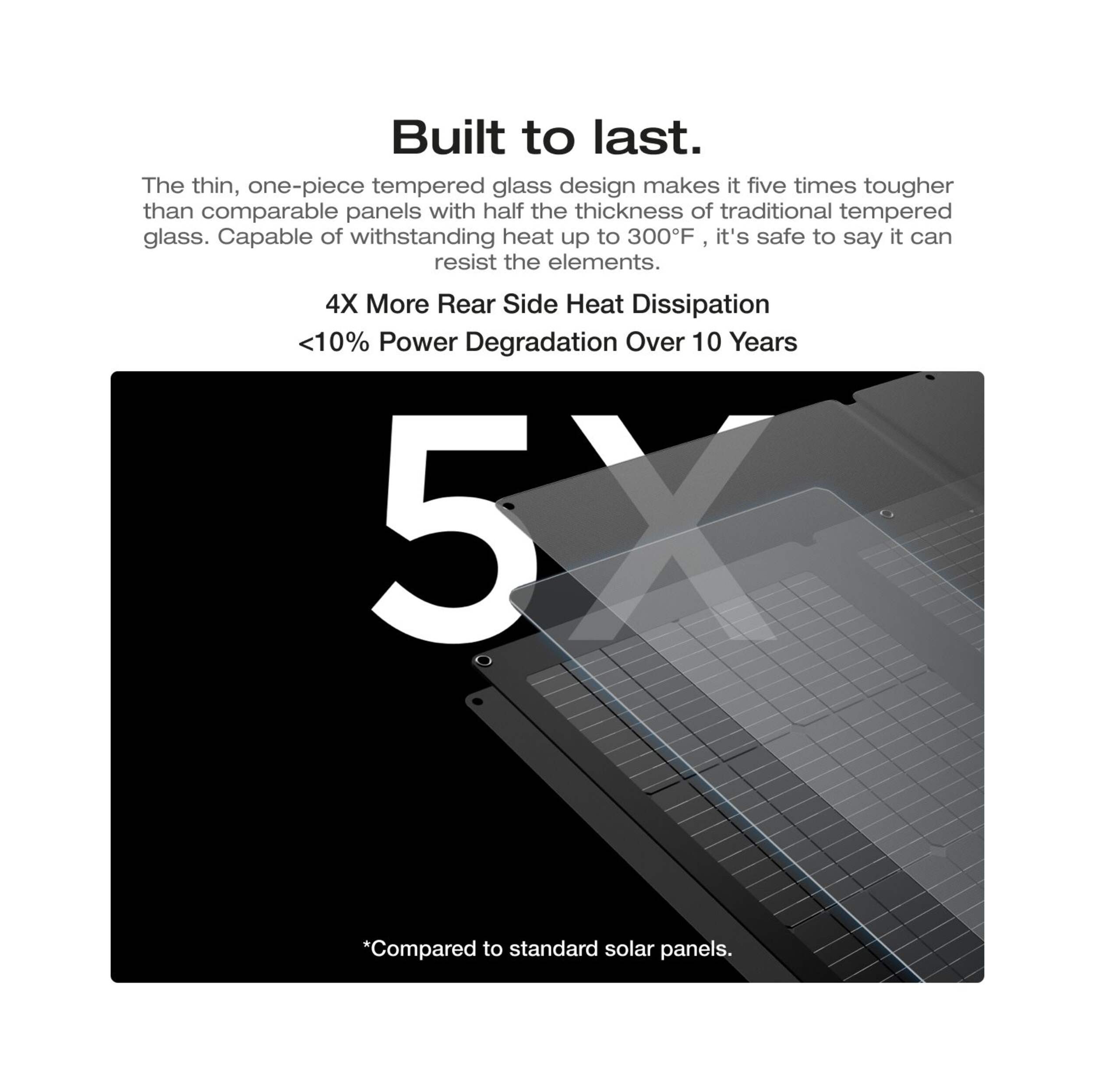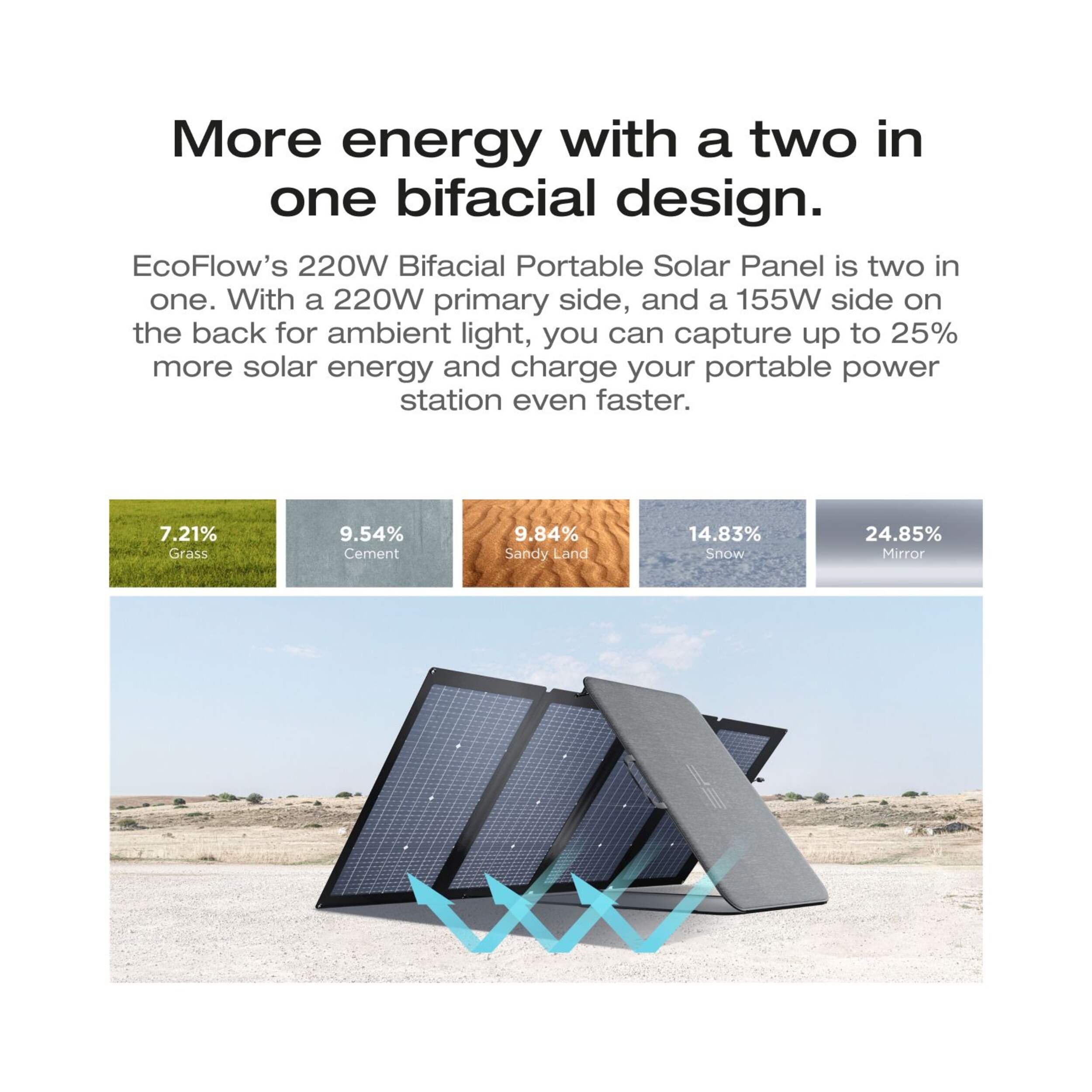 Compact and Space-Saving: The EcoFlow 220W Bifacial Portable Solar Panel is designed to be 10% smaller than comparable 220W panels, saving space and making it easier to transport. This compact design is achieved through the use of thinner tempered glass and a reduced surface area required for the same input, providing you with a more efficient and space-saving solar solution