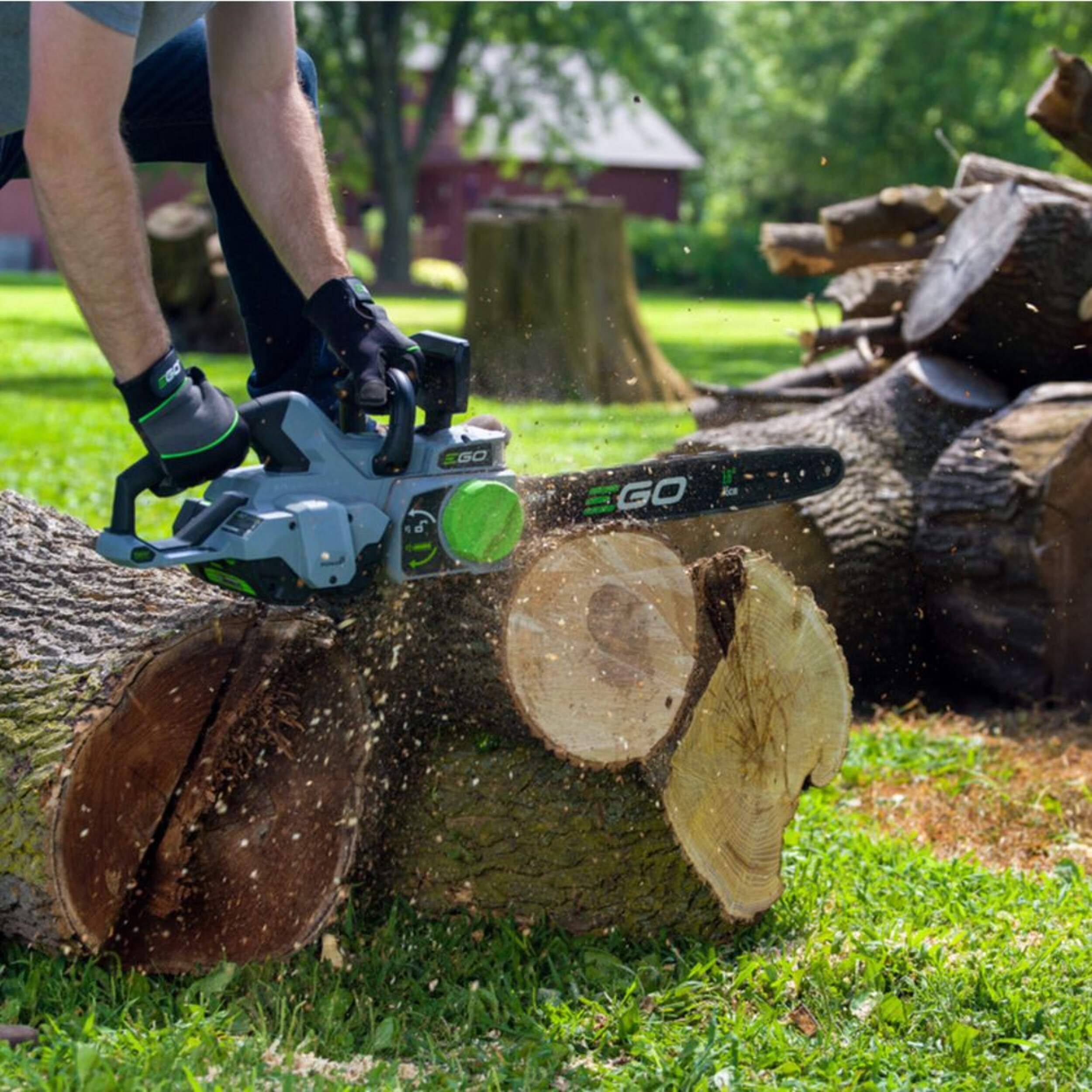 The EGO POWER Cordless Chain Saw provides the power of a gas saw without the noise or emissions. Powered by a 56V 5.0Ah ARC Lithium™ battery, this saw delivers up to 300 cuts on a 4x4. Its brushless motor runs at 11,000 RPM, making it ideal for tough jobs, like cutting large branches and stumps. The 18-inch bar and chain offer a robust performance, while the IPX4 rating ensures weather resistance.