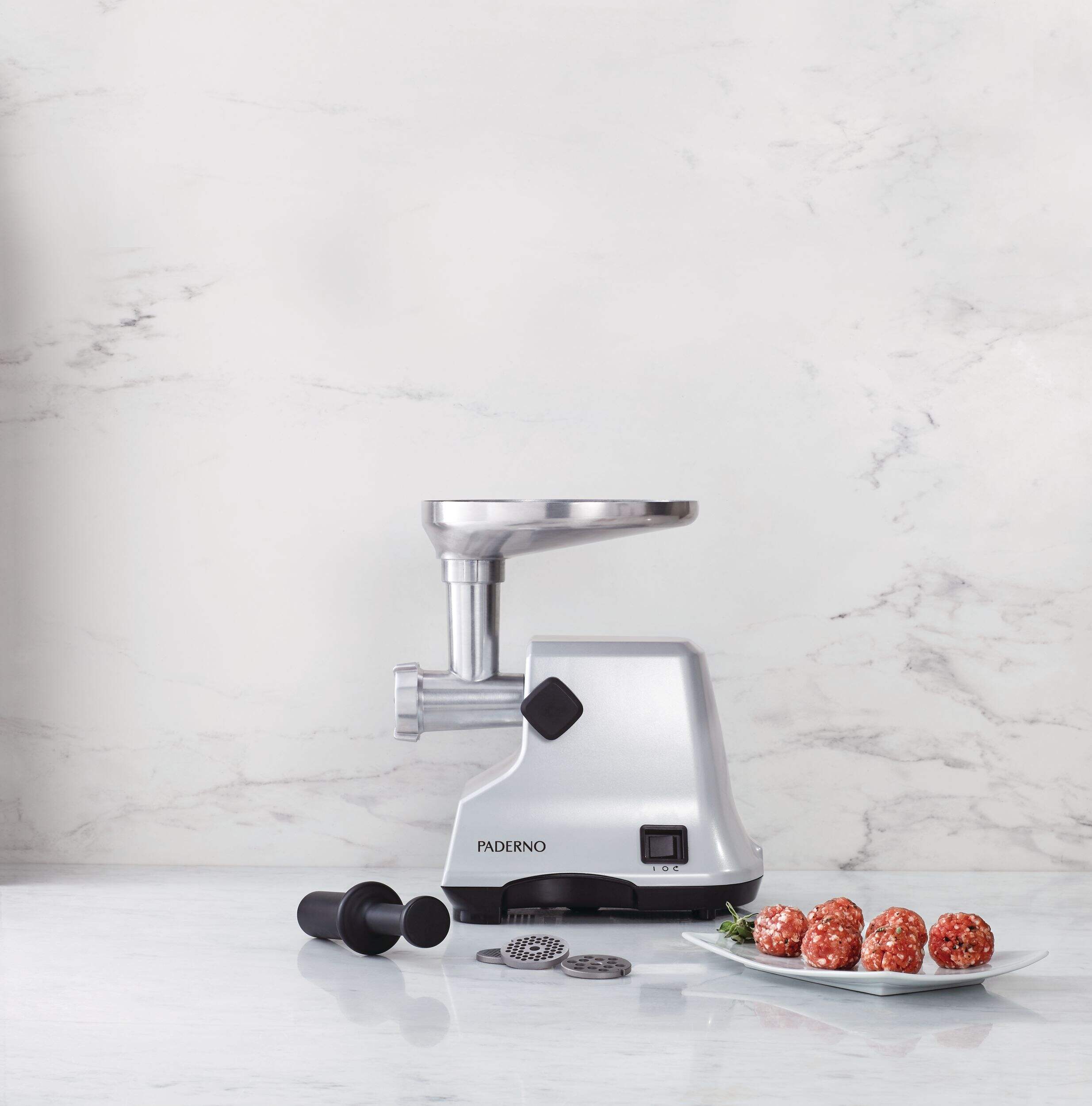 The PADERNO Electric Meat Grinder features a powerful 400W motor that grinds up to 2.5 lbs (1.1 kg) of fresh meat per minute