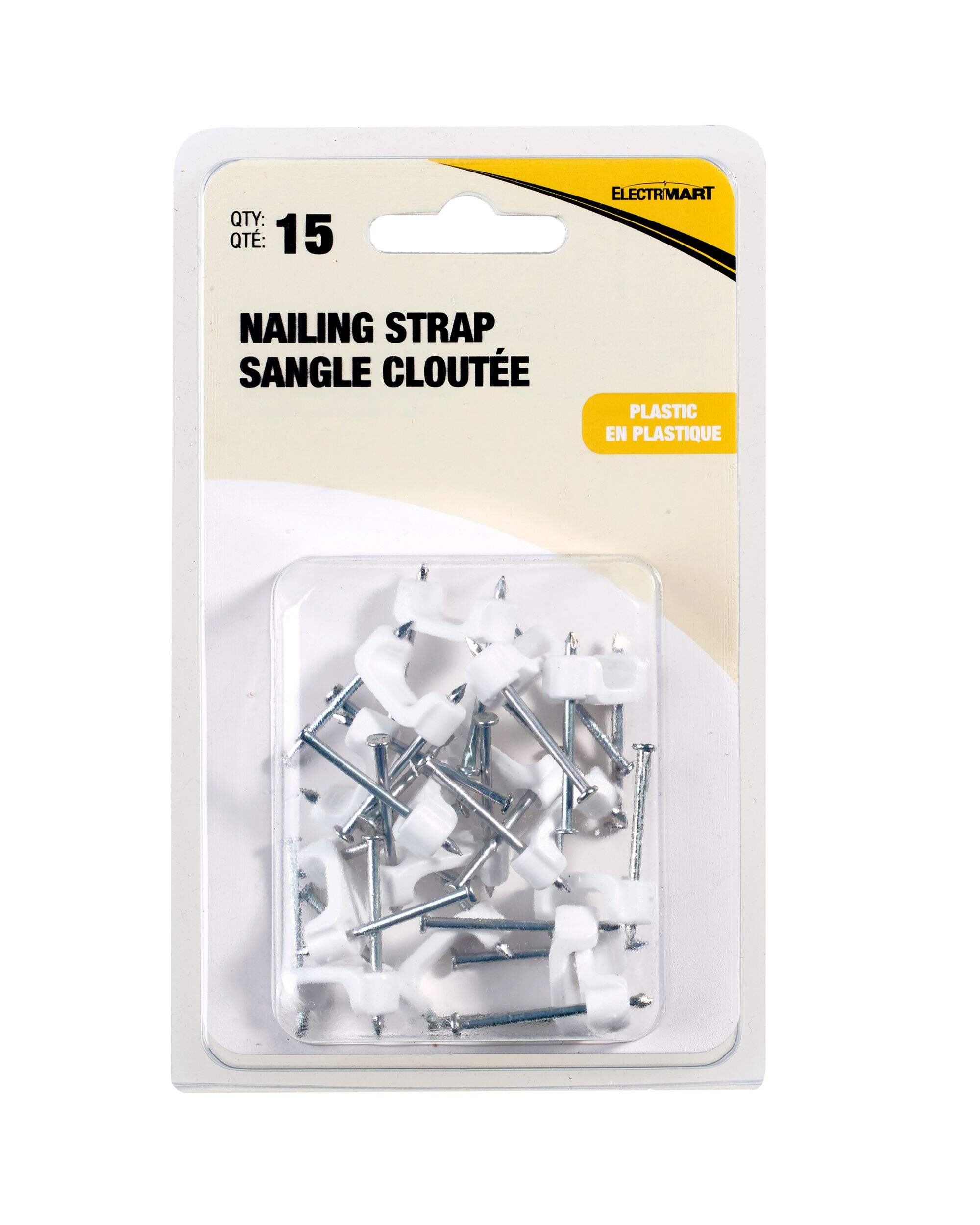 The Electrimart Plastic Nailing Staples, 15-pk, are designed to securely fasten 14/2 and 12/2 NMD90 cables to wood studs without splitting the wood. These staples ensure a reliable hold, with the restriction that two or more cables are not allowed under one strap. Ideal for both professional electricians and DIY enthusiasts, this pack of 15 provides a dependable solution for cable management in various installations.