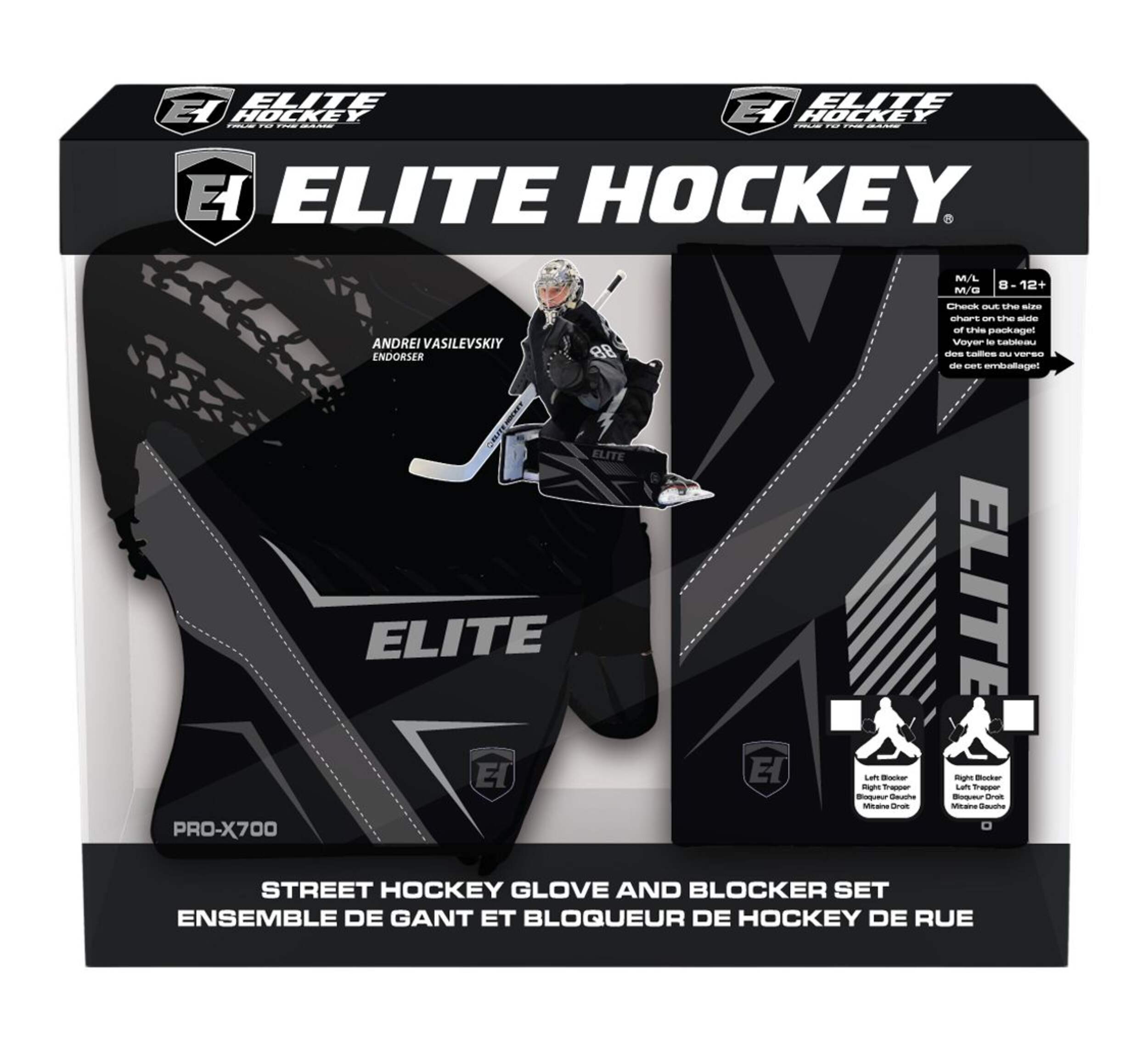 The Elite Hockey Vasilevskiy PRO-X700 Intermediate Street Hockey Goalie Glove and Blocker Set is designed for right-handed players. The set includes a catching glove for the right hand and a blocker for the left hand. The sleek black design offers a professional look. This set is designed for intermediate age group players, providing a supportive fit for growing hands. It is perfectly suited for those seeking to enhance their street hockey game.