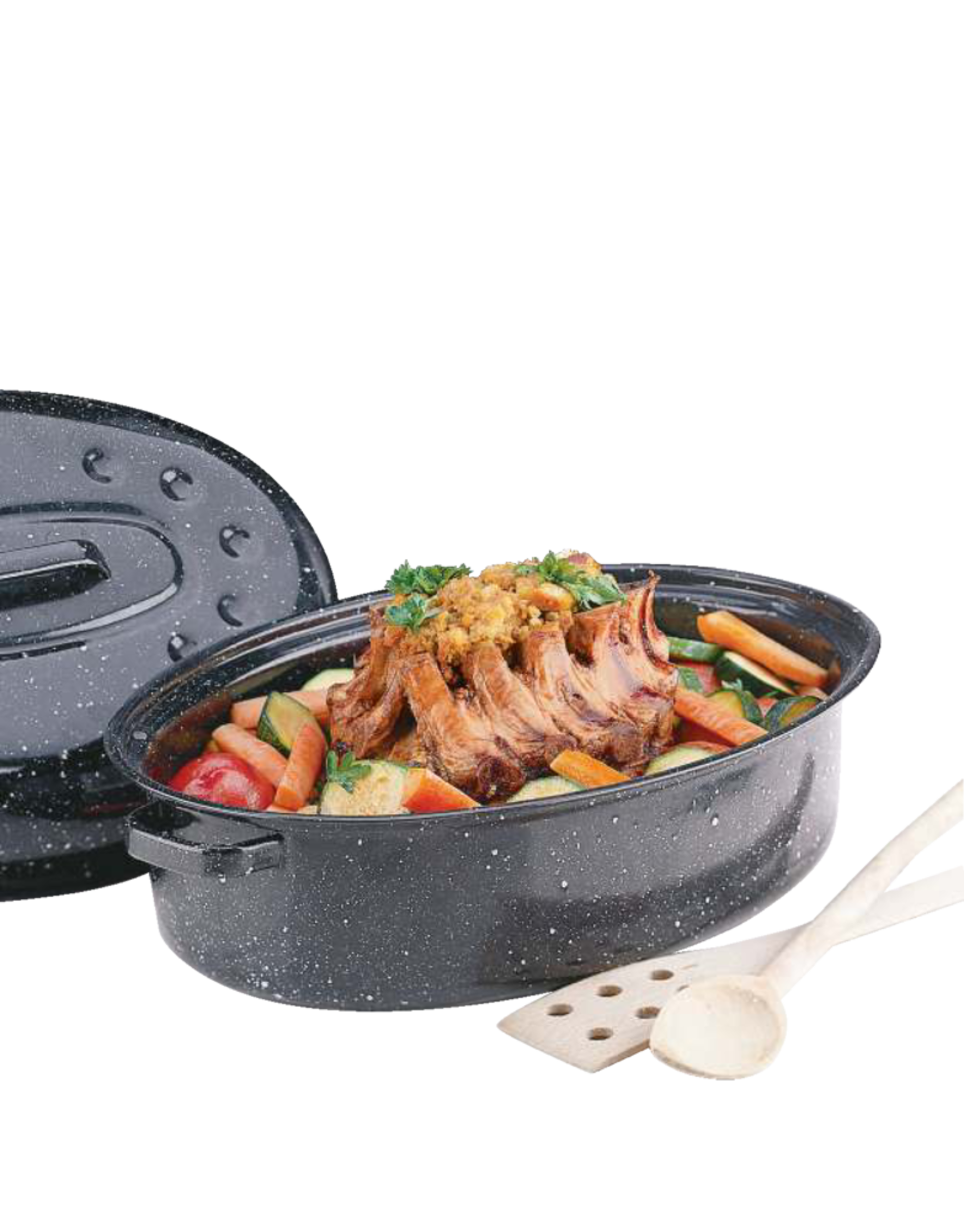 This classic Oval Roaster is ideal for preparing whole chickens, turkeys, roasts and more. Made with durable, heavy glaze enamel on steel with the classic speckled finish, this roaster heats up quickly, helps foods lock in flavour and moisture and cleans up in a snap. Designed for stove top or oven; not to be used in microwaves.