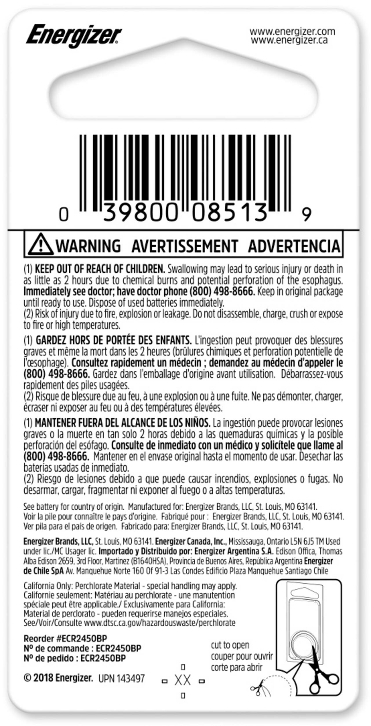 Keep important equipment running dependably with the Energizer CR2450 3 Volt Lithium Coin Cell Battery. This all-purpose battery is perfect for powering items that need to run dependably for years. Coin cell batteries are thin and circular, commonly used in hearing aids, wrist watches, key fobs, digital tools, and small flashlights. They have a low discharge rate that helps them keep their charge for a long shelf life and years of use, so you can depend on reliable power.
