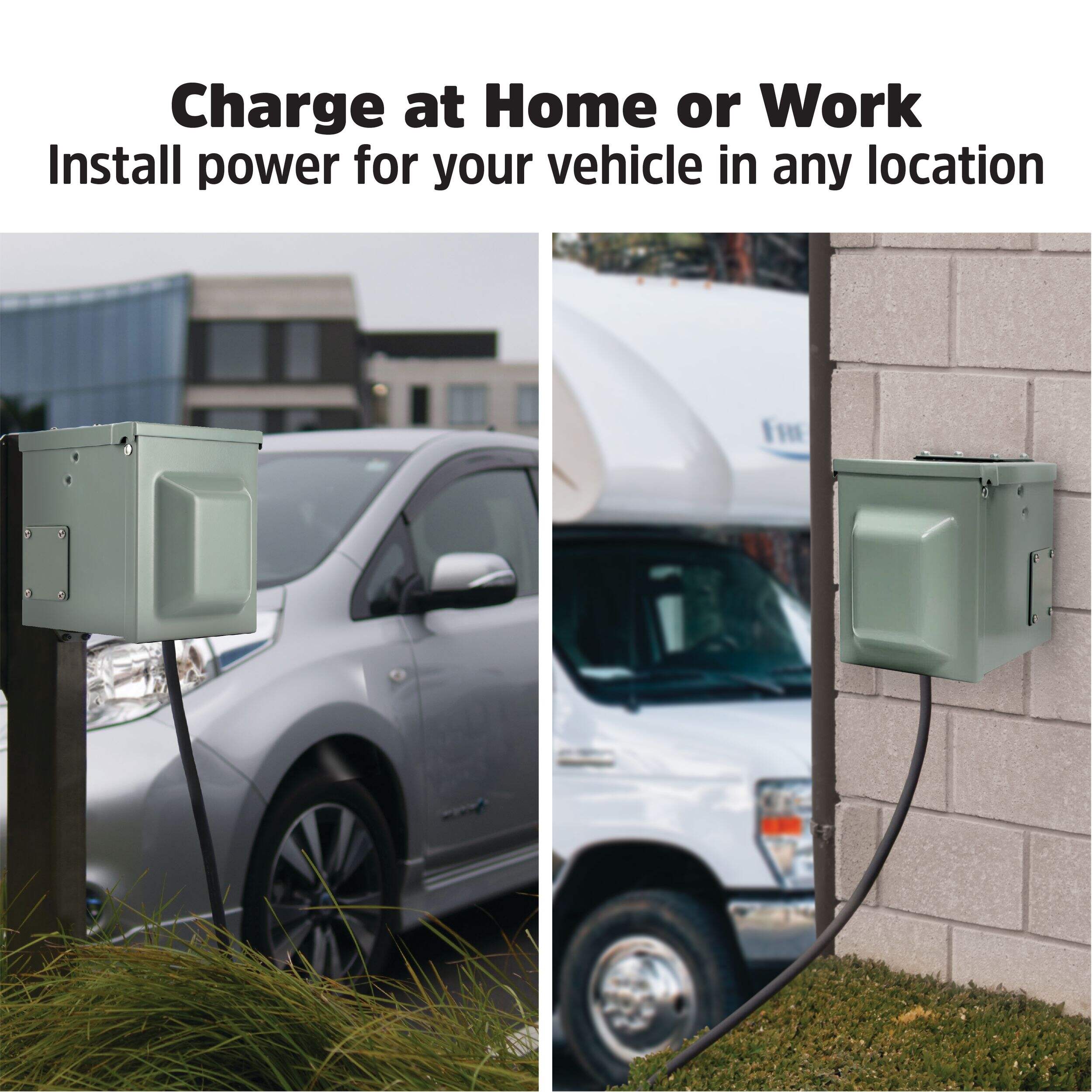 Easy to install, weatherproof, and lockable enclosed receptacle outlet for easy RV and EV charging