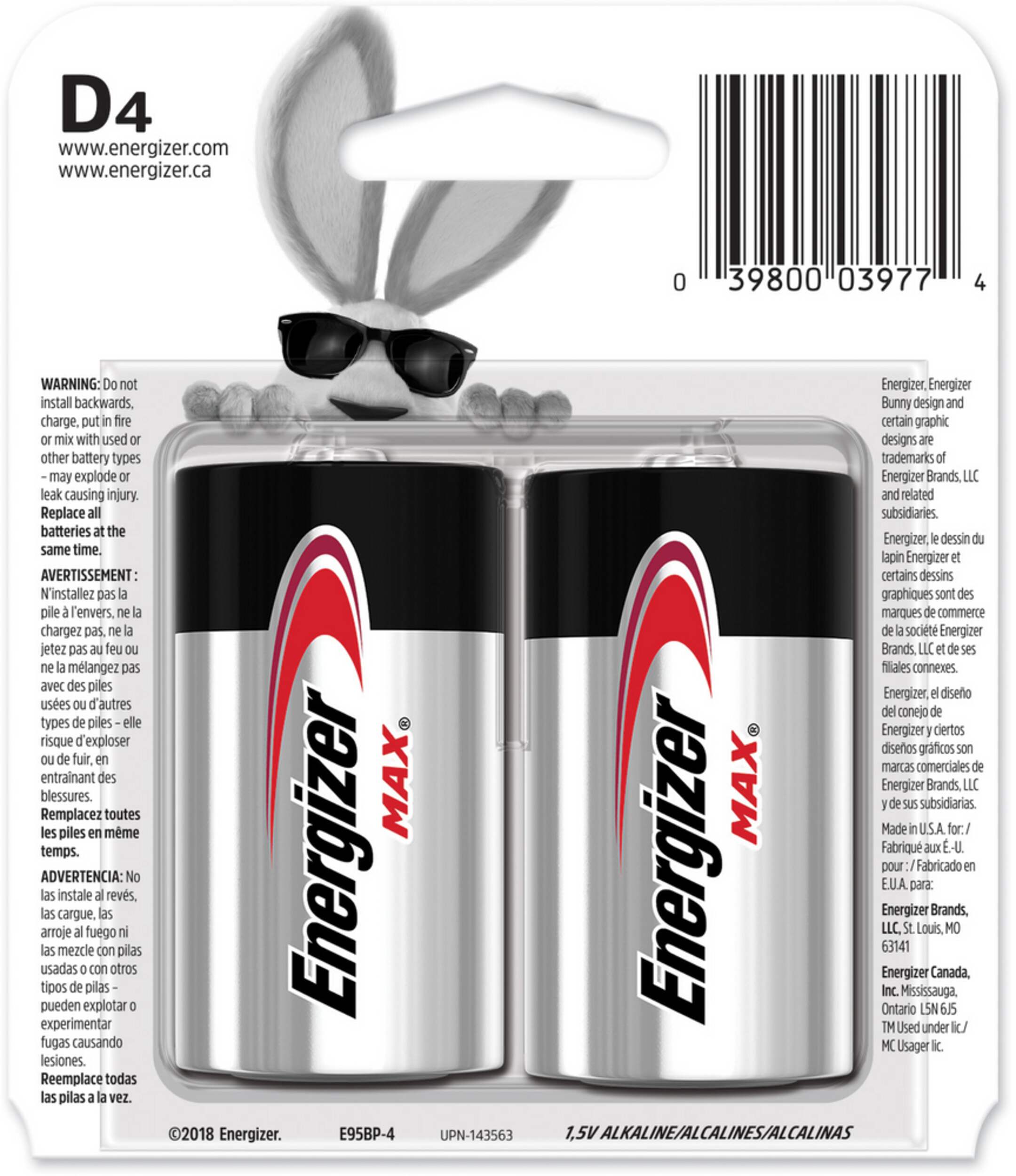 Keep your high-drain devices running with Energizer MAX D Alkaline Batteries. Energizer provides long lasting power for your everyday devices, whether you need replacement D cell batteries for high-tech flashlights or backup batteries for your child's toys. Made to last, not to leak, these Energizer D batteries have a shelf life of up to 10 years, so they're ready to keep your devices operating when you need them most. Depend on Energizer MAX D batteries to fuel your everyday electronics, whether you're at home, work or play.