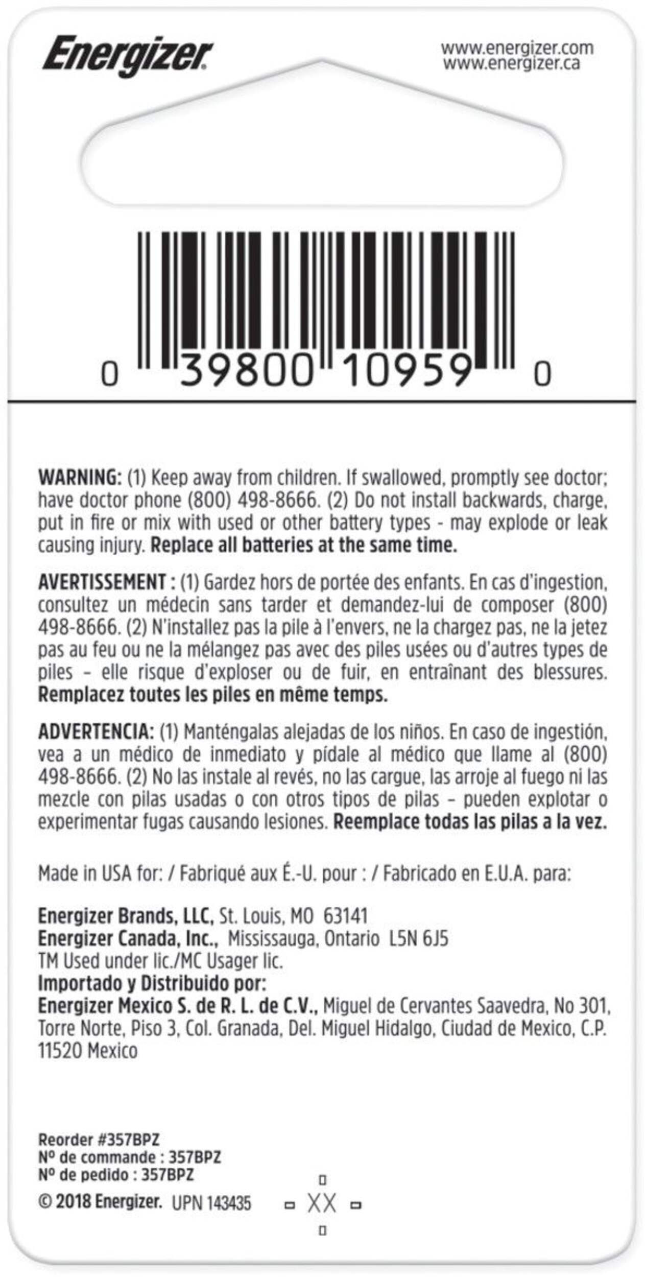 Energizer 357/303 Silver Oxide Button Cell 1.5-Volt Battery delivers long-lasting, dependable power to your button-battery-operated devices, like medical devices, calculators, toys, and watches