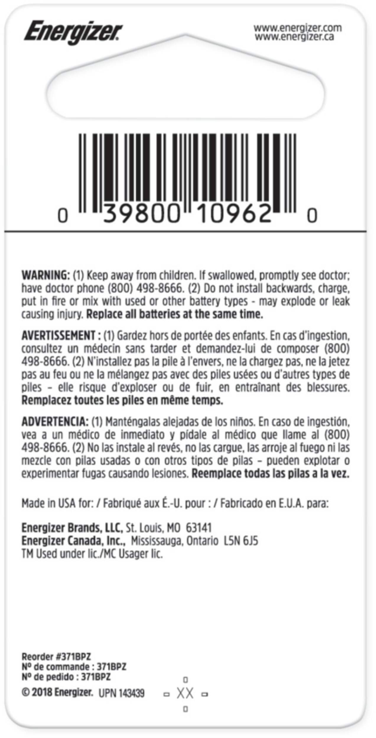 | Battery Type/Battery Size | 371 |