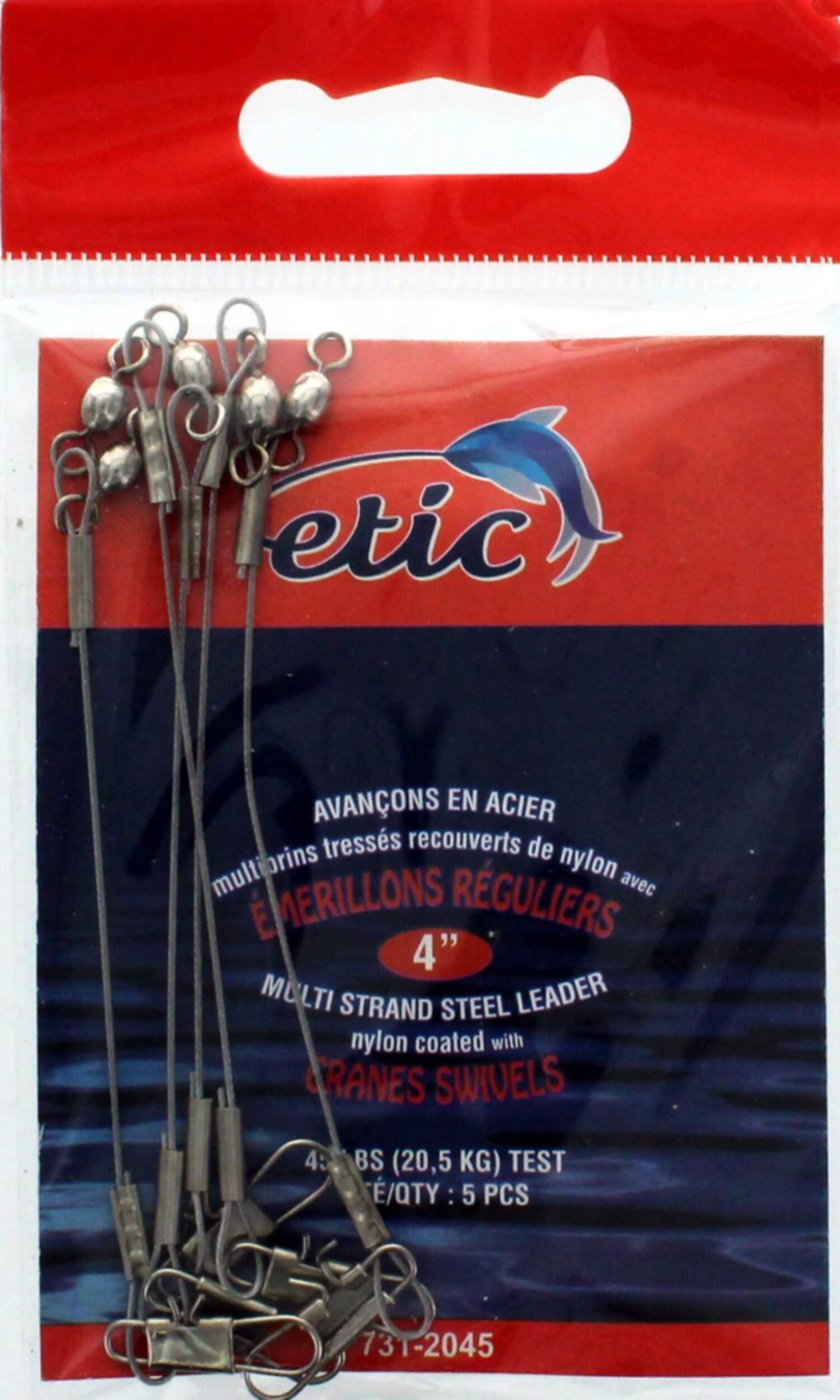The Etic steel leaders are designed for anglers who want quick and easy lure changes without twisting. The nickel finish offers excellent no-twist protection, making them ideal for catching toothy fish like pike, muskie and walleye. They come in assorted sizes and depths, and a pack of five leaders means you'll have a spare on hand whenever one gets chomped by a fighter.