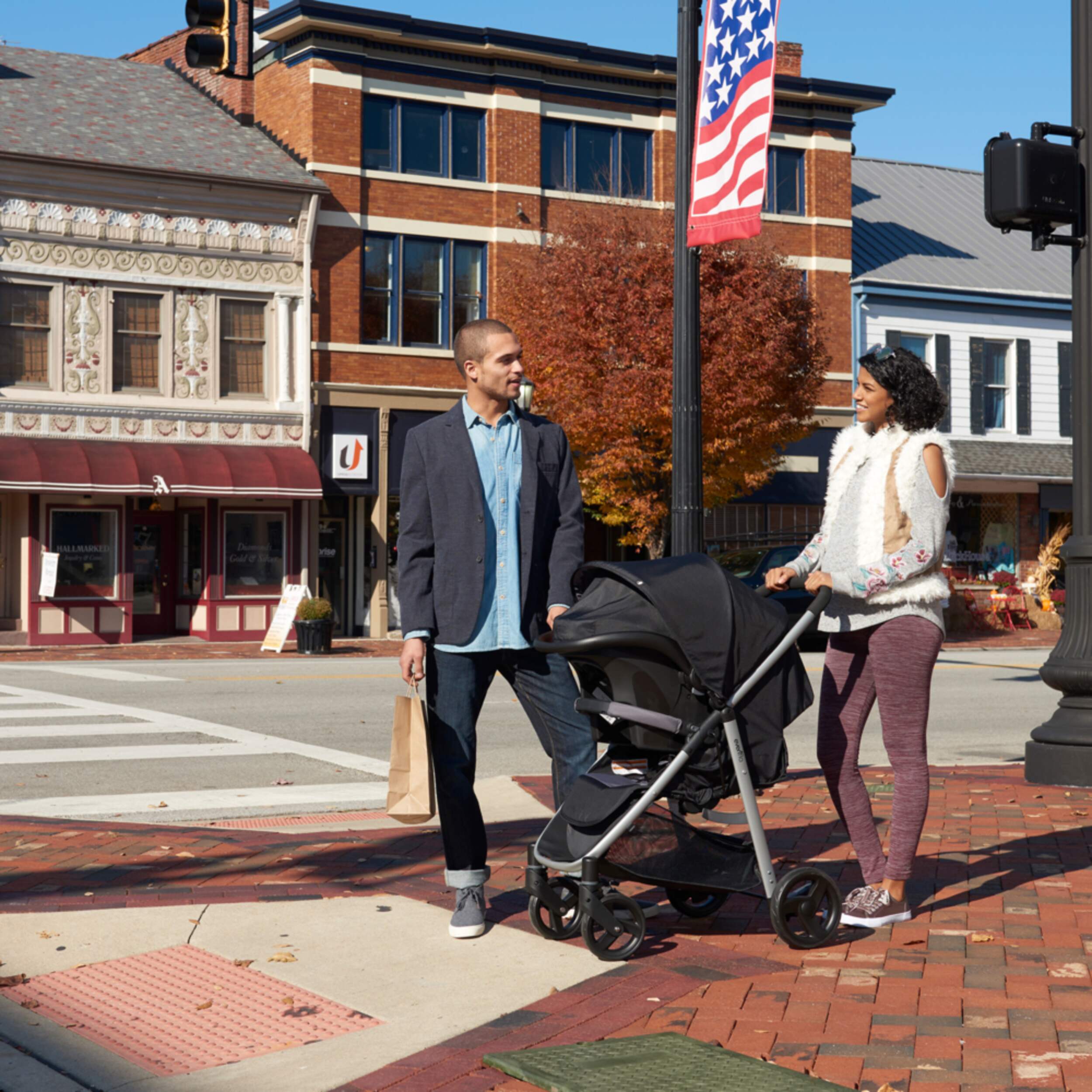 Easy infant car seat transfer moves from base to stroller with one secure click