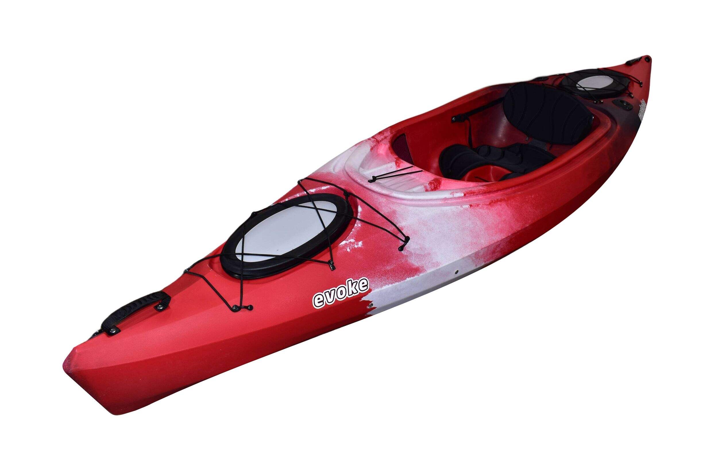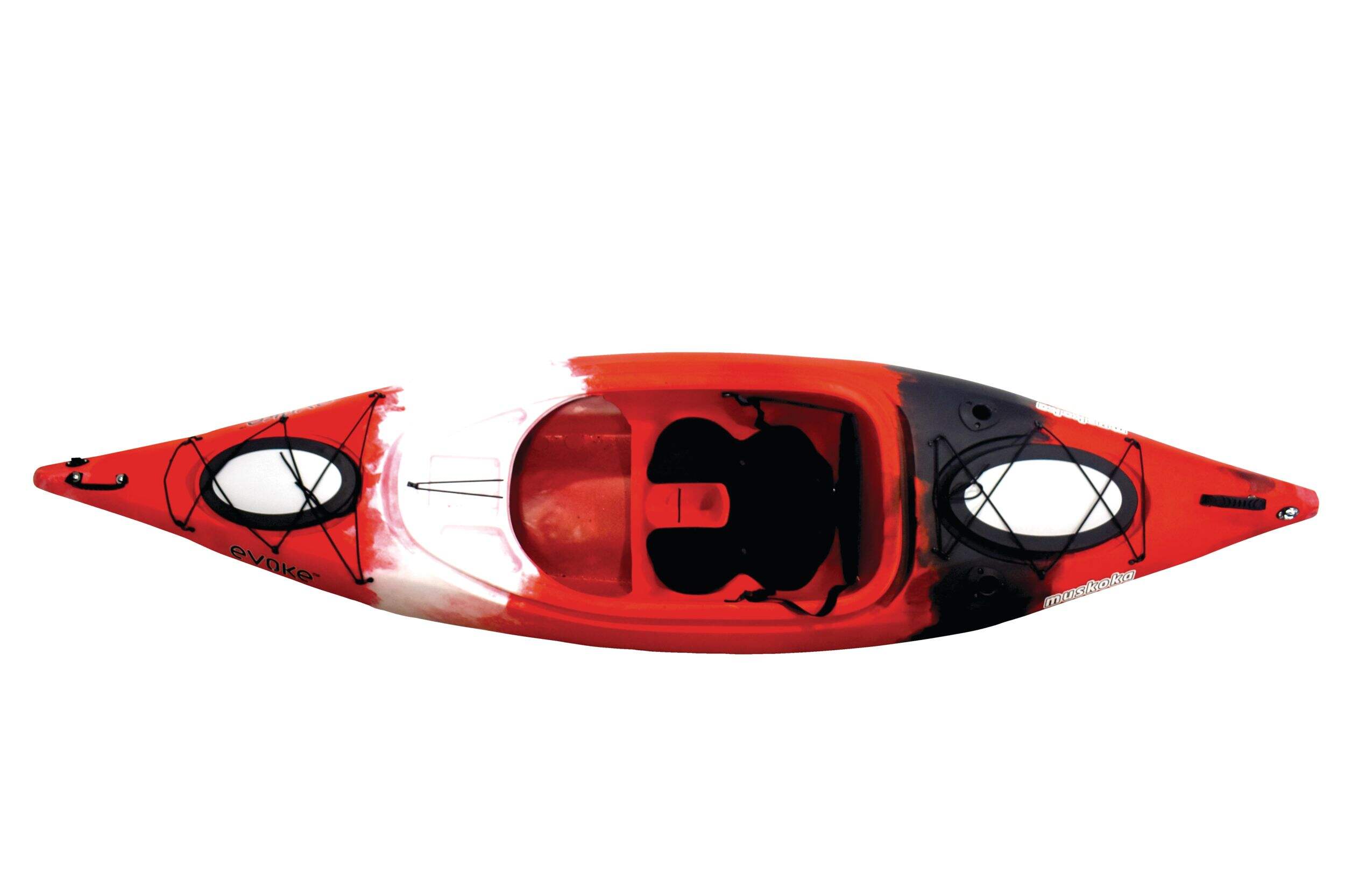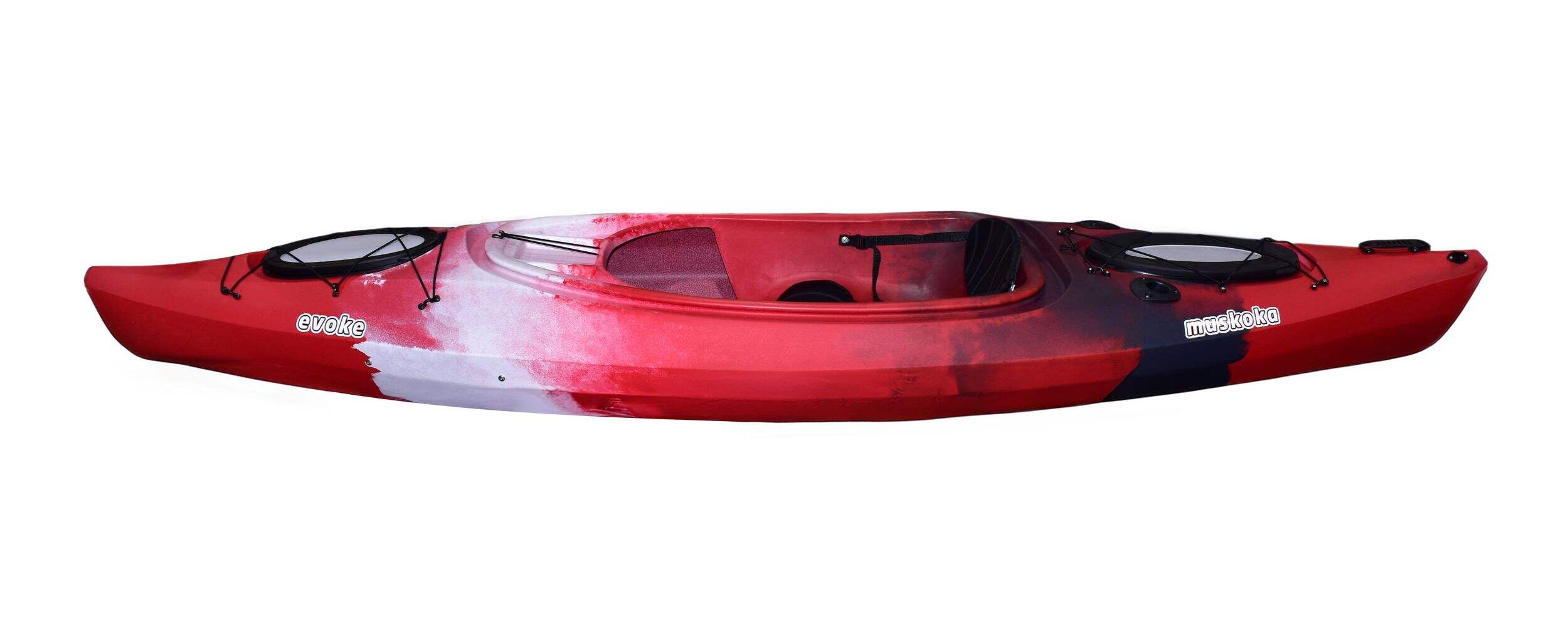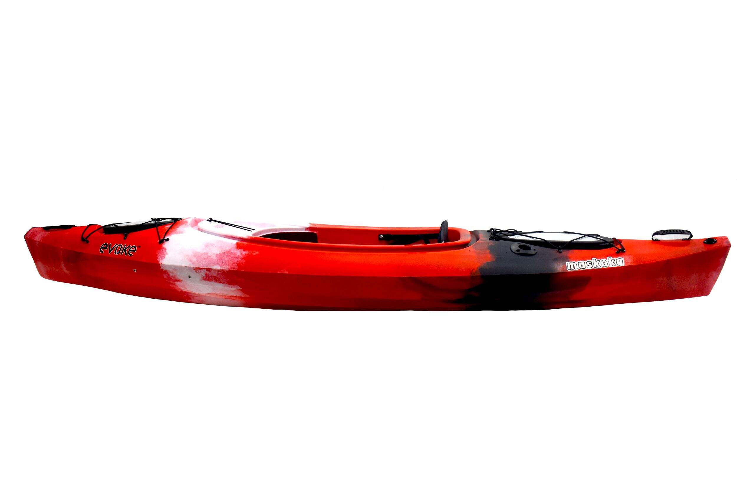 The Evoke Muskoka sit-in fishing kayak is perfect for the angler who enjoys a productive fishing experience or an occasional fun day of paddling on pristine waters. At 46 lbs., this 10 ft. kayak is easy to transport while its dihedral hull provides stability and swift tracking. The adjustable foot braces and padded seat system with a built-in bottle holder allow you to comfortably paddle through tranquil waters or rugged shorelines. Bring your essentials in the two storage hatches and keep items secure with the bungee cords. Fishing enthusiasts will appreciate the two flush mount fishing rod holders so you can reel in that trophy-sized lake trout, walleye, or bass. The Muskoka also features a cockpit table with handy compartments to keep gear at the ready. Made of UV-stabilized Fortiflex® High Density Polyethylene, the Muskoka kayak will join you for years of connecting with the natural world and pursuing your passion for fishing.