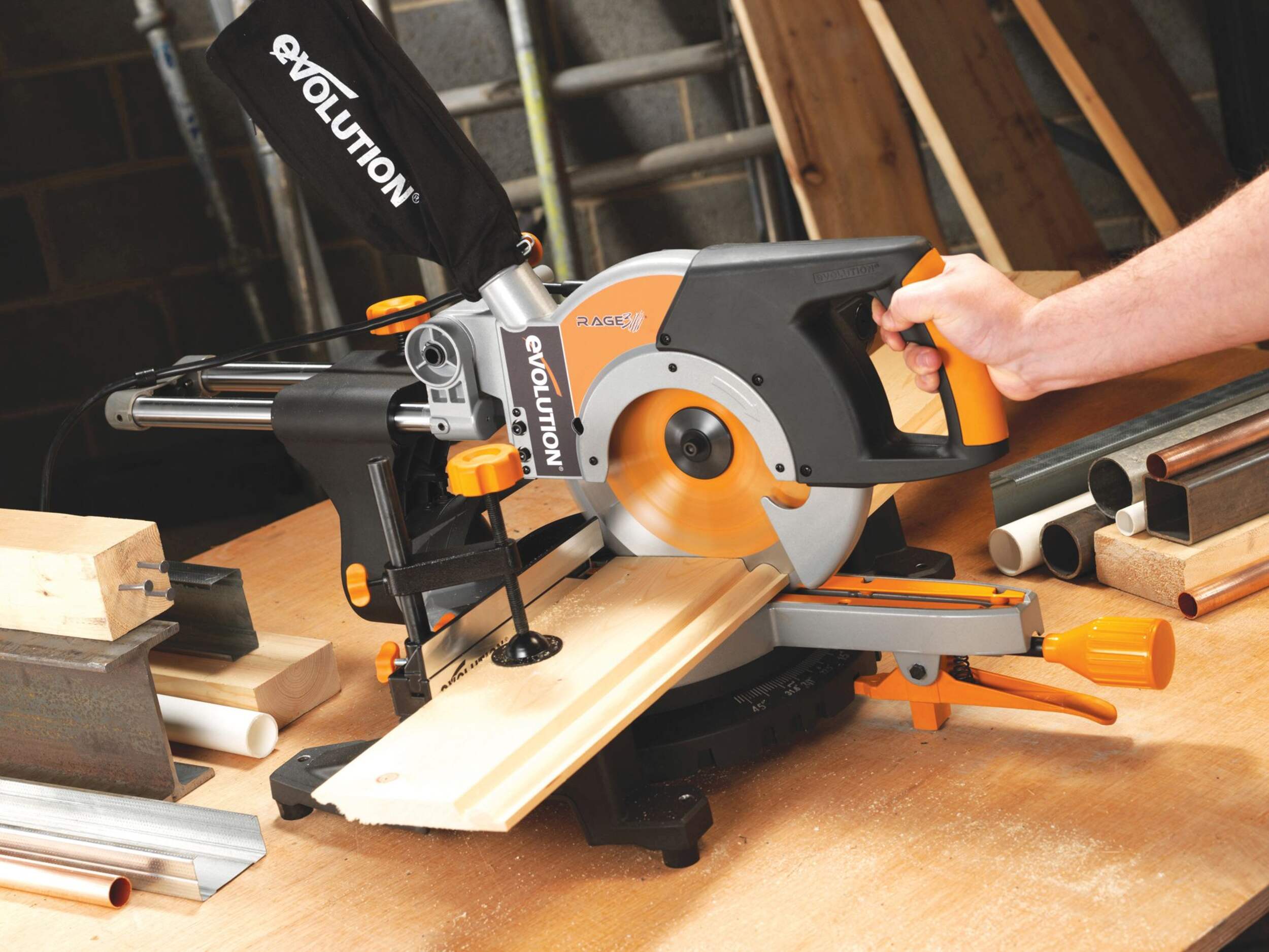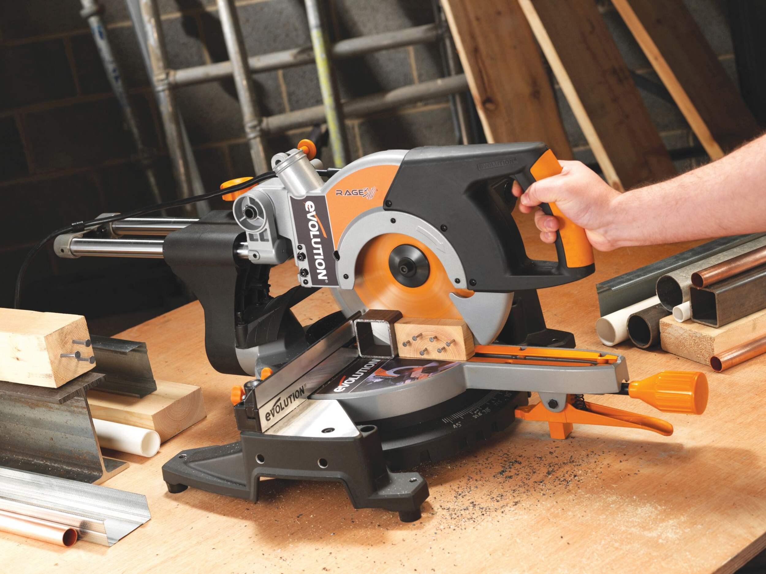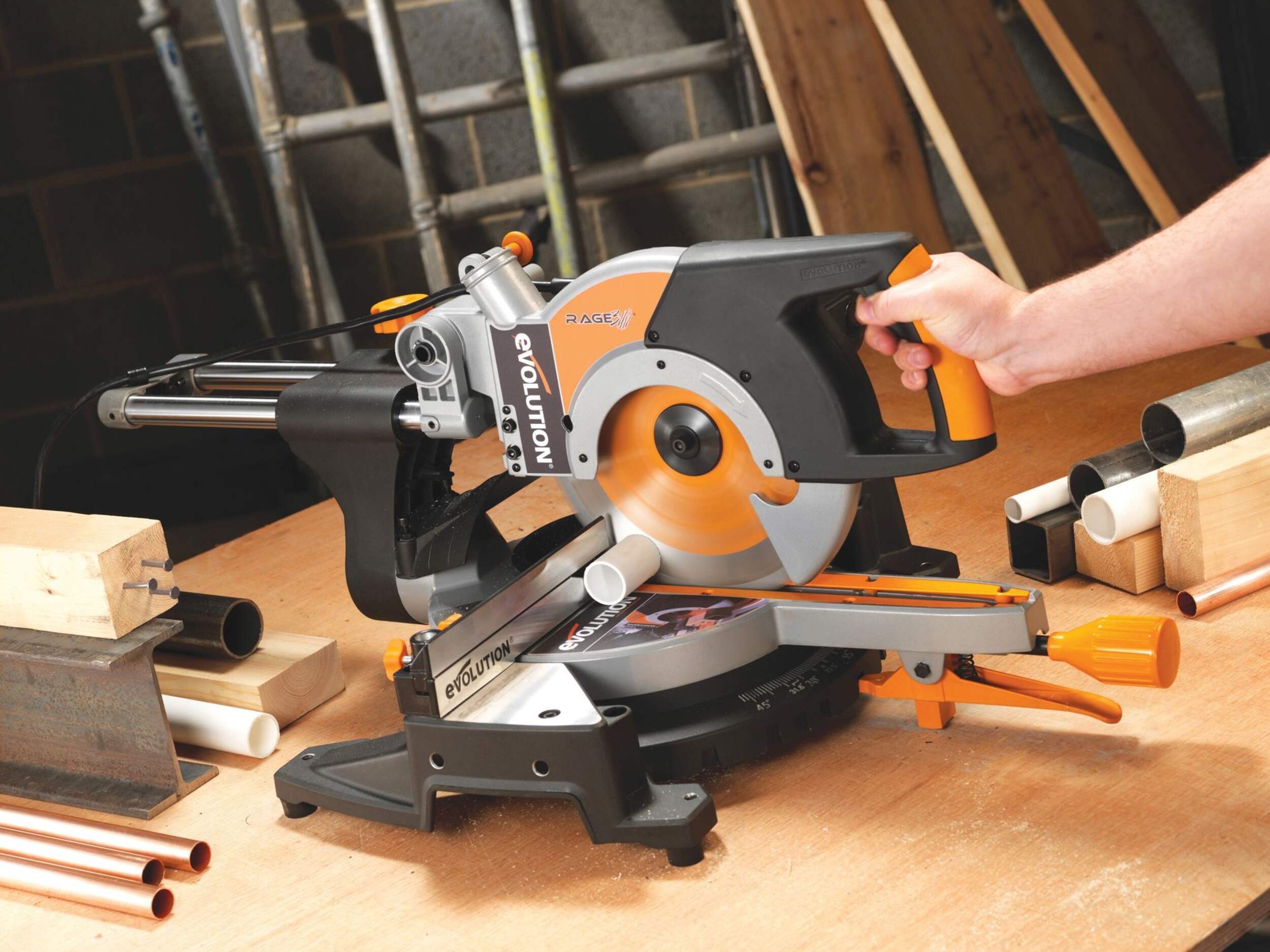 The Evolution Multi-Purpose 10" Sliding Mitre Saw features patented professional Rage technology to easily cut steel, aluminum, wood and plastic with just one blade