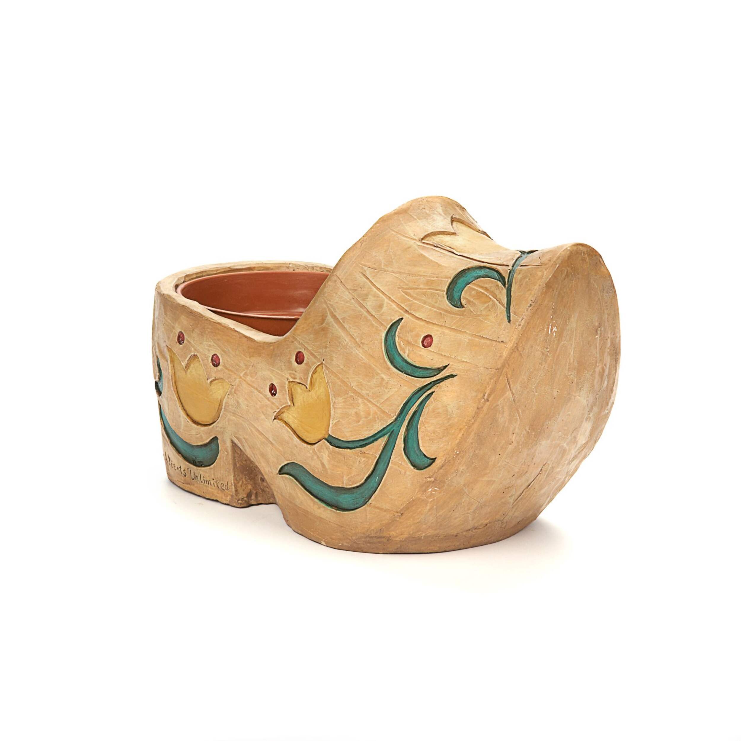 It has a carved clog design with hand painted details, and a 5" (13 cm) diameter for a grower's pot