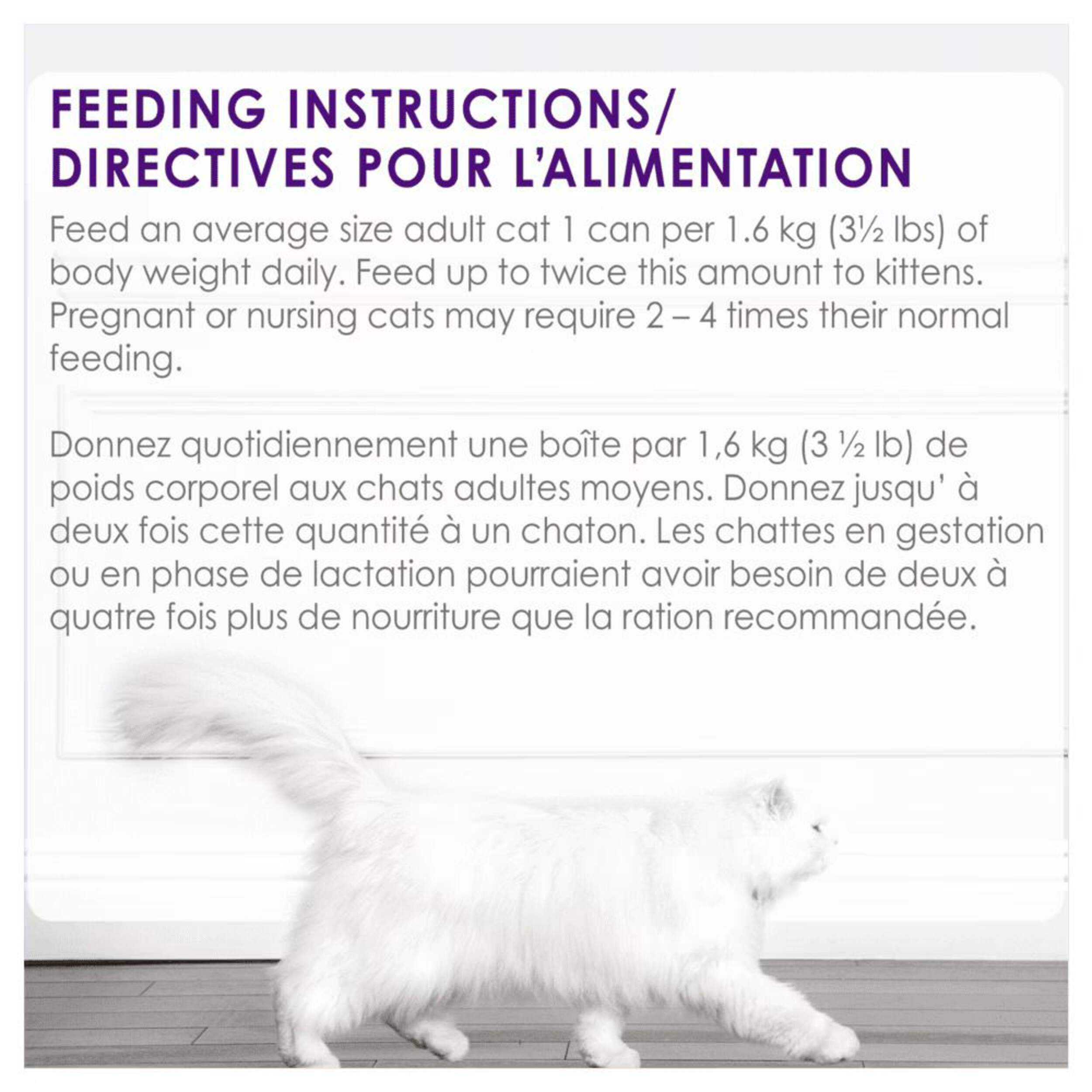 Feed an average size adult cat 1 can per 1.6 kg (3.5 lbs.) of body weight daily. Feed up to twice this amount to kittens. Pregnant or nursing cats may require 2 - 4 times their normal feeding
