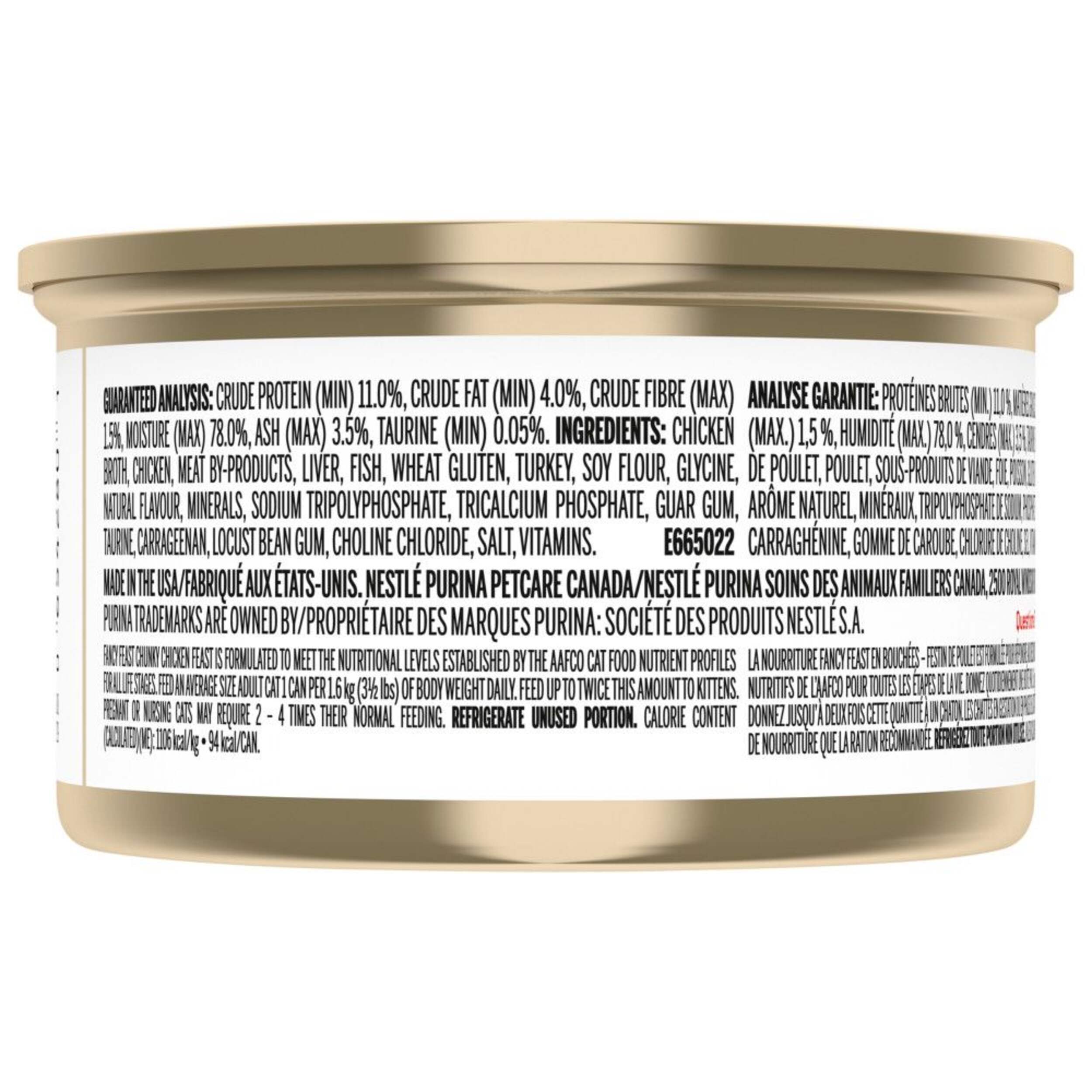 Fancy Feast Chicken Feast Chunky Wet Cat Food delivers a flavourful feast for your feline friend. Succulent chunks of real chicken combined with a finely ground paté made with high-quality ingredients. This savoury combination provides 100% complete and balanced nutrition for adult cats. Purina's Fancy Feast brand offers a variety of mouth-watering flavours your cat will love. Perfect for everyday feeding, this grain-free recipe will have your cat purring with delight.