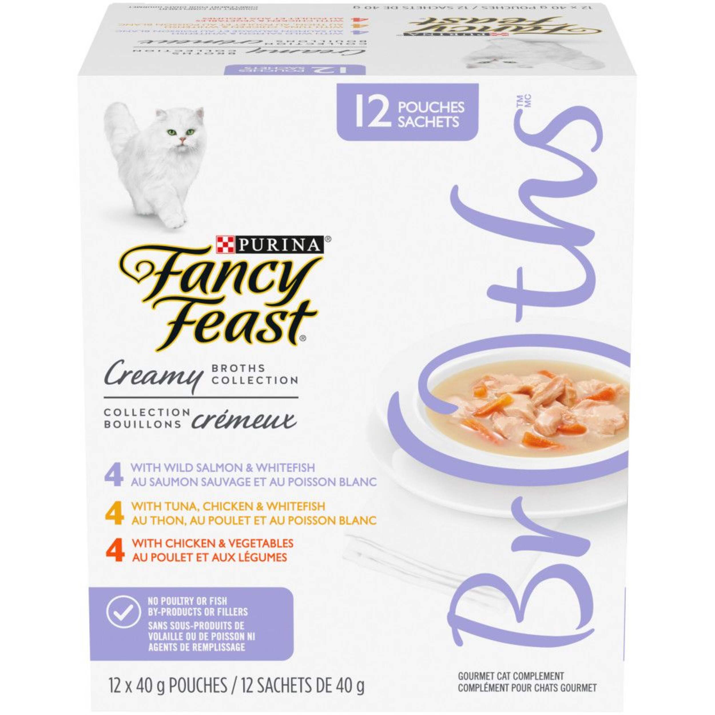 The Fancy Feast Creamy Broths Gourmet Wet Cat Food Complement Variety Pack, 40-g, 12-pk, is made for a real feline feast. This 12-pack of 40g pouches features a delectable trio of flavours - tuna and whitefish, salmon and whitefish, and chicken and vegetables - all made with high-quality proteins and no artificial additives. Your cat will lap up these creamy, flavourful pet broths that are the perfect complement to their regular meals. Treat your furry friend to a gourmet experience with this variety pack that's sure to have them purring in delight. Indulge your cat's cravings for something special with Fancy Feast's Broths.