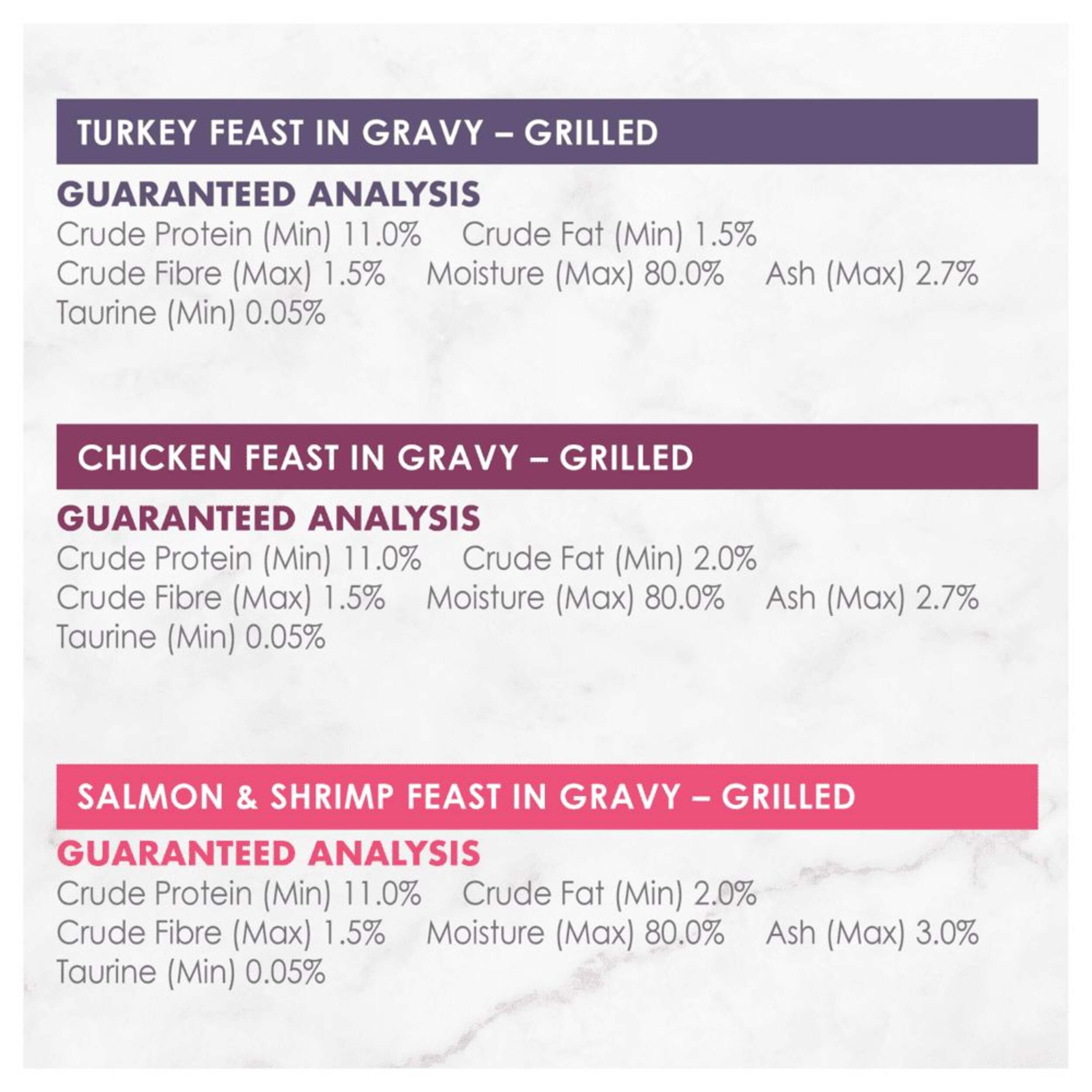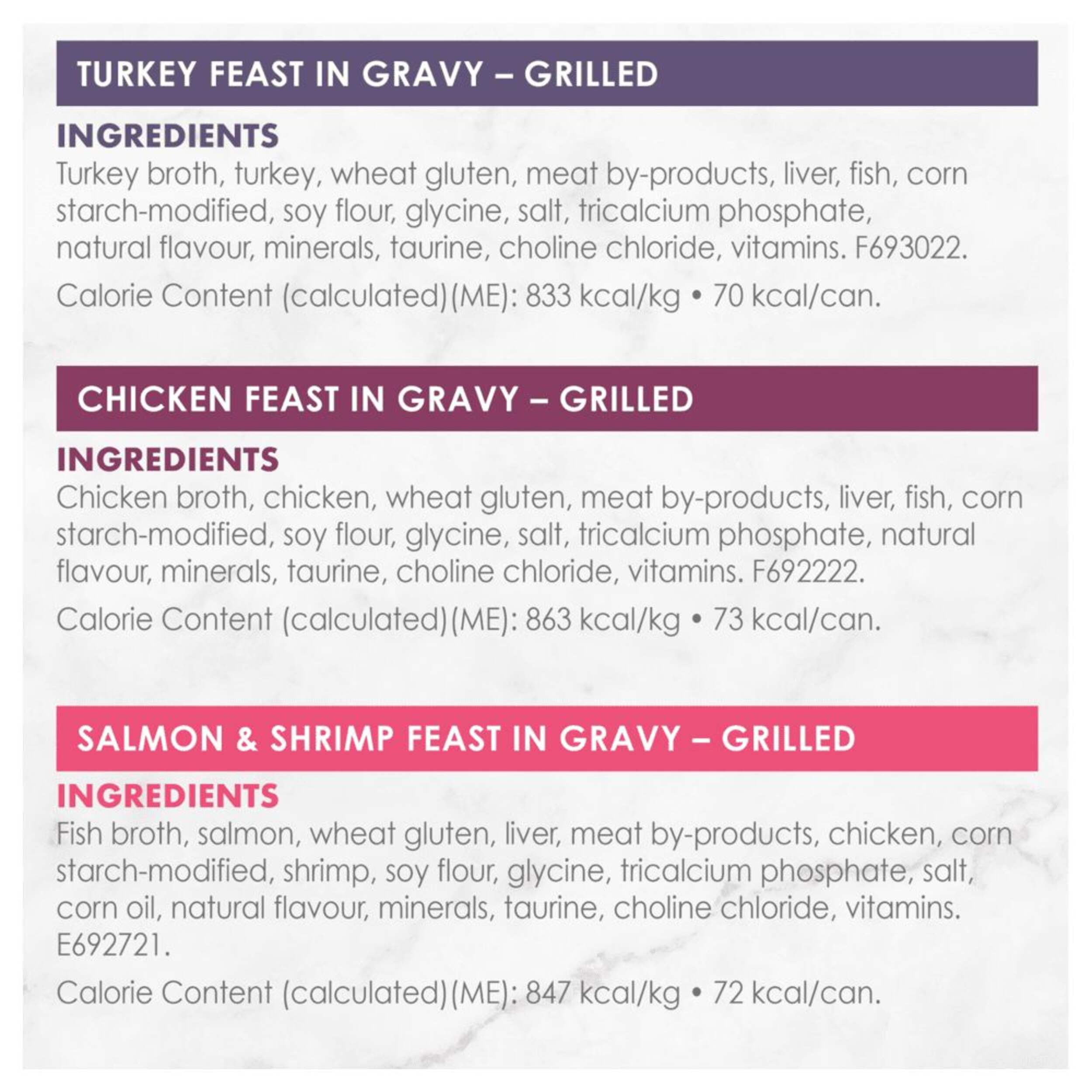 Variety pack includes (4) 85 g cans of turkey feast, (4) 85 g cans of chicken feast, and (4) 85 g cans of salmon and shrimp feast