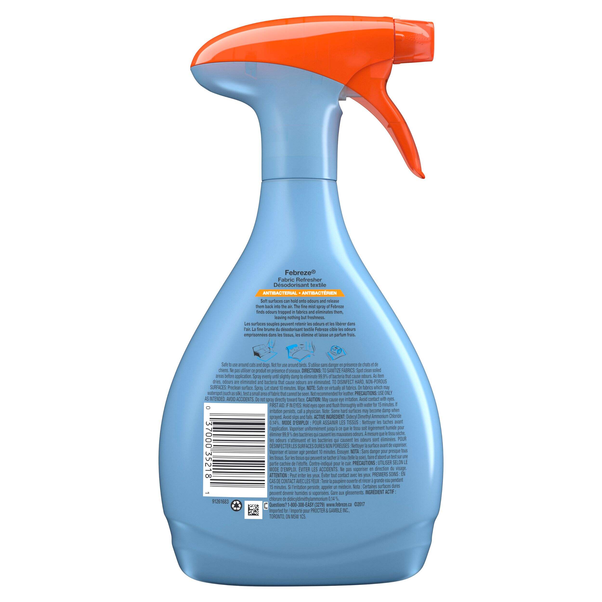 Febreze Antibacterial Fabric Freshener Spray freshens carpets, curtains and other hard-to-wash fabrics to replace lingering odours with long-lasting freshness