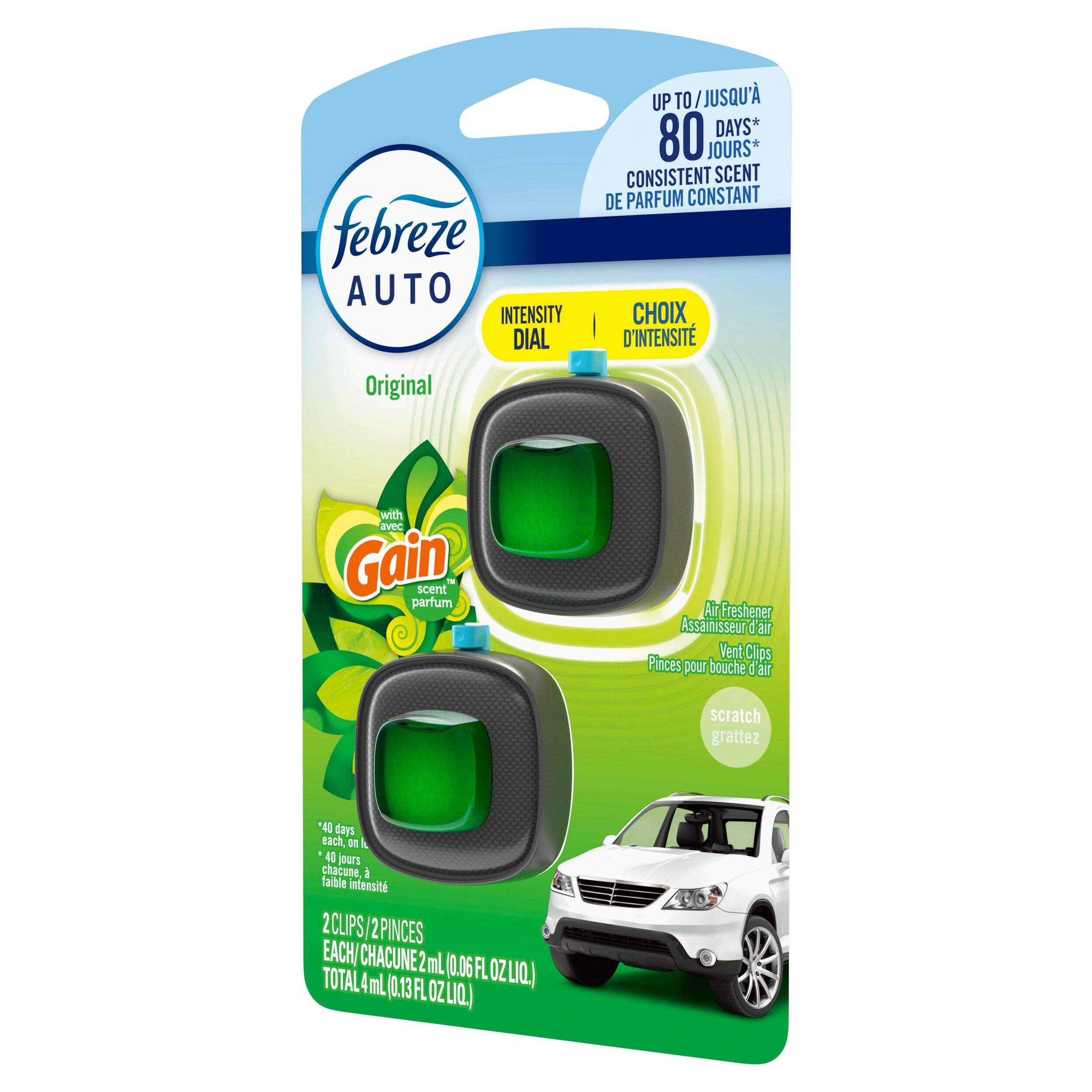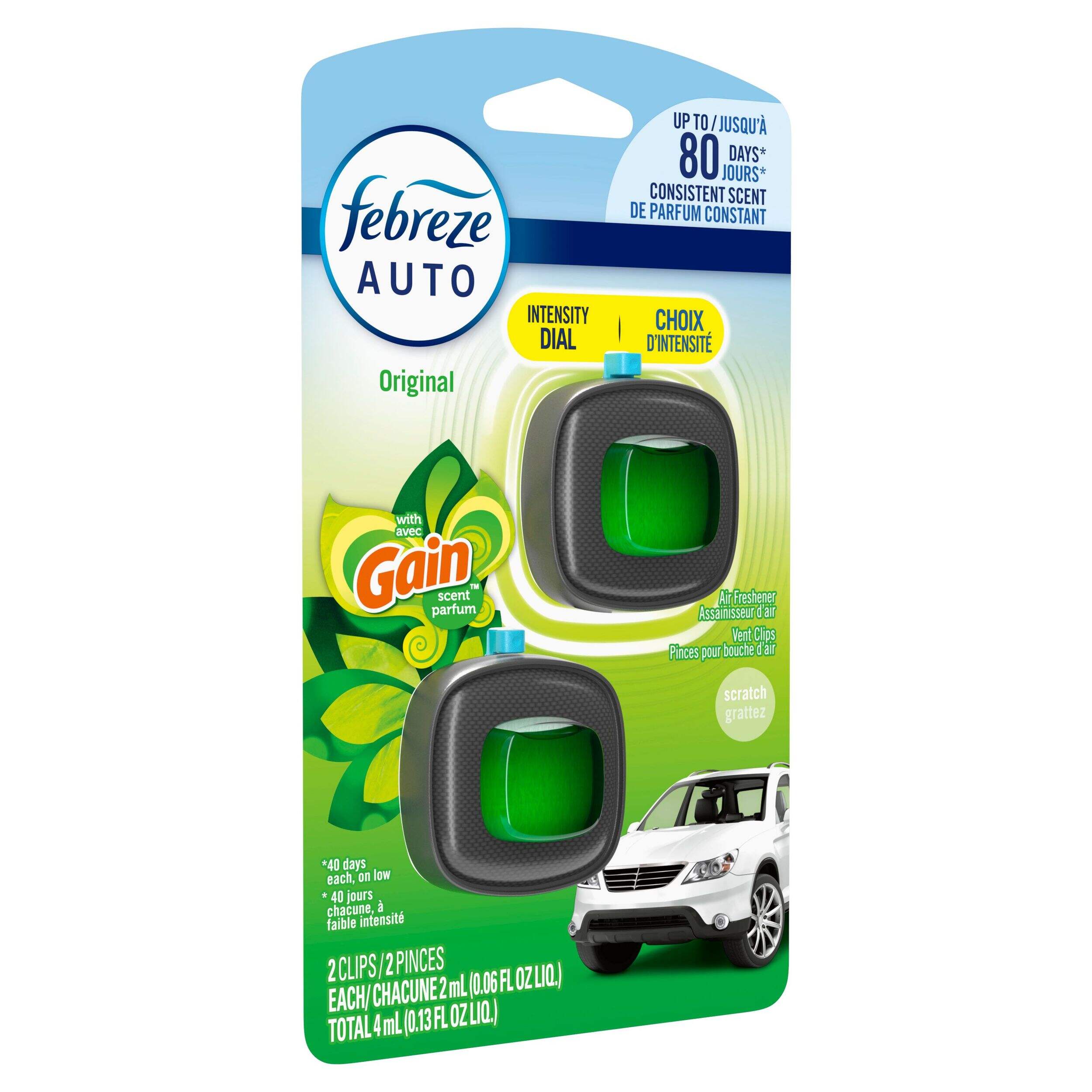 Kick car odors to the curb and enjoy up to 40 days of consistent scent with Febreze Car Vent Clips. While other car refreshers start off like a floral punch in the face, Febreze smells just right, right away. You’ll get that first-day Febreze fresh for up to 40 days courtesy of its patented Steady Release Technology. This car air freshener vent clip is a breeze to install: Just unfold the clip until you hear a click, then clip it to your vent. It uses your car’s fan to circulate an even scent through your entire vehicle. With rich amber, invigorating greens, and sweet florals, the freshness of Gain Original Scent is a treat to your nose... without doing a single load of laundry. These tiny car deodorizers are made with odor fighters that fight any car stink with a scent that lasts. So forget those overwhelming, fade-too-soon fresheners and enhance every drive with the long-lasting freshness of Febreze Car. Want a fresh that lasts at home, too? Try Febreze Fade Defy PLUG.