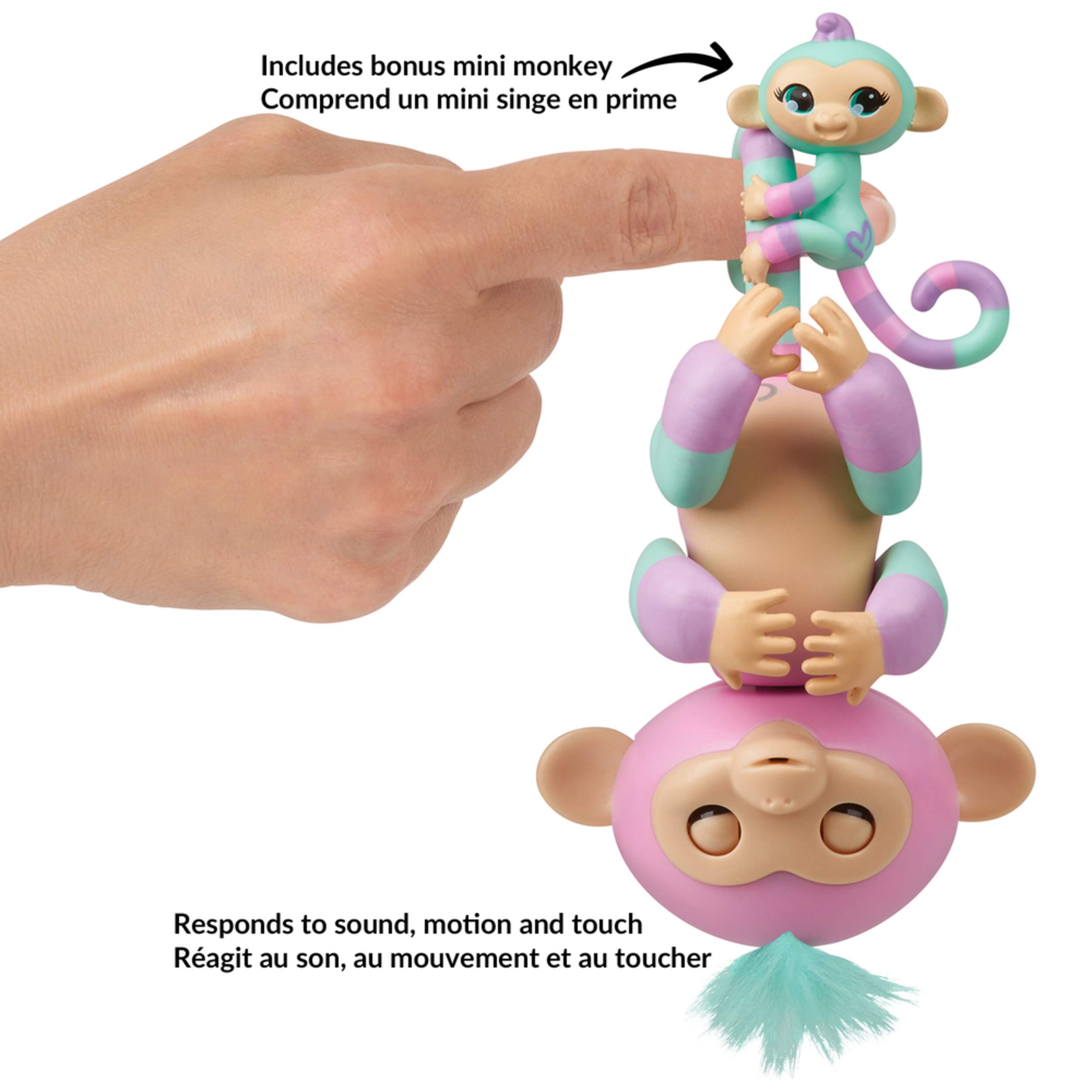 Each Fingerlings baby monkey in the BFF series comes with a mini monkey friend that can hang onto their tail or your pencil. Fingerlings are adorable baby animals that are curious about the world around them—starting with you! These interactive pets love to hang onto your finger, blink their eyes, turn their heads, blow kisses, swing by their tails, and talk in monkey babble!