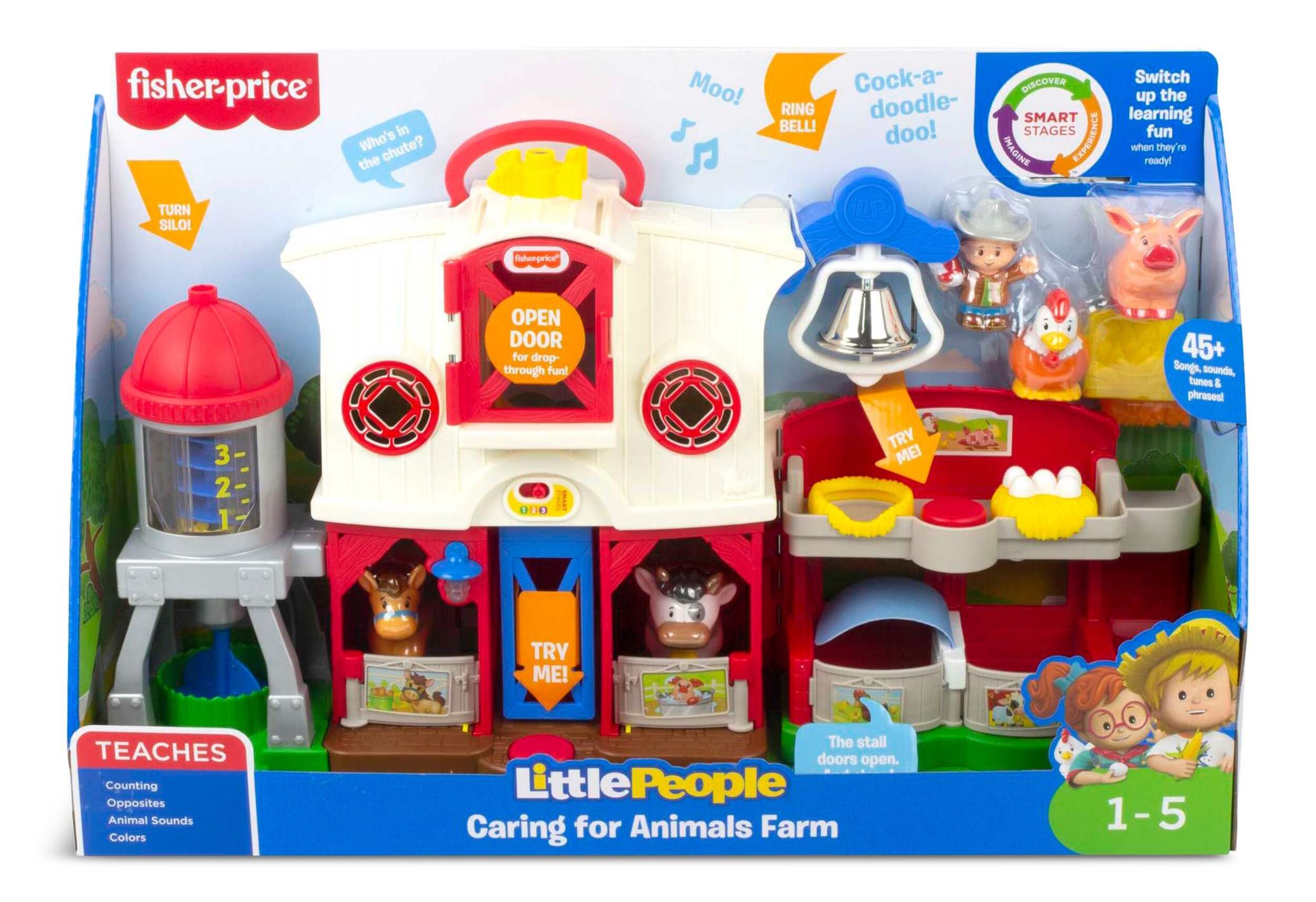 Press the barn door button or drop figures through the hayloft for songs, sounds and phrases