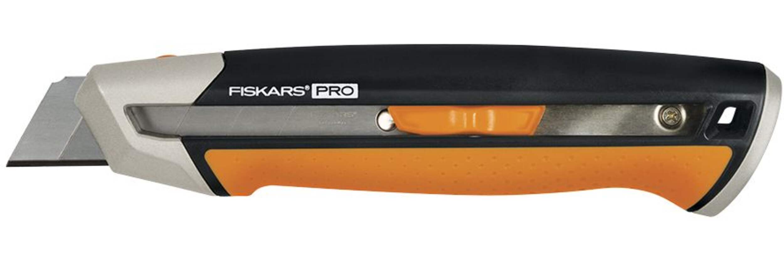 The Fiskars® Pro Snap-off Utility Knife is the first snap-off knife to feature front-loading blade change with no loose parts, making your blade changes easier and quicker. An integrated segment snapper easily snaps old blades and then captures them so you don't have to worry about stray, used blades. The reinforced metal end provides sturdy, reliable resistance against pounding and drops. Includes one CarbonMax(TM) snap-off utility blade that lasts 24X longer than standard utility blades.