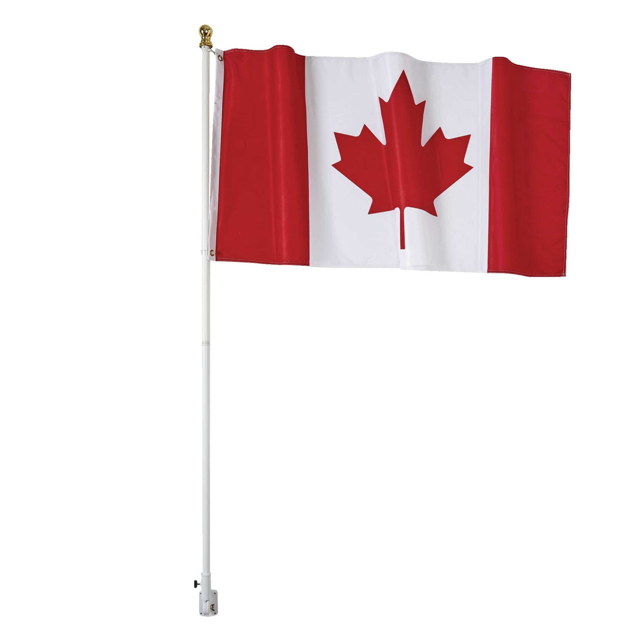 Includes a 2-piece spinning flagpole, adjustable bracket, flag fasteners, and a Canadian flag