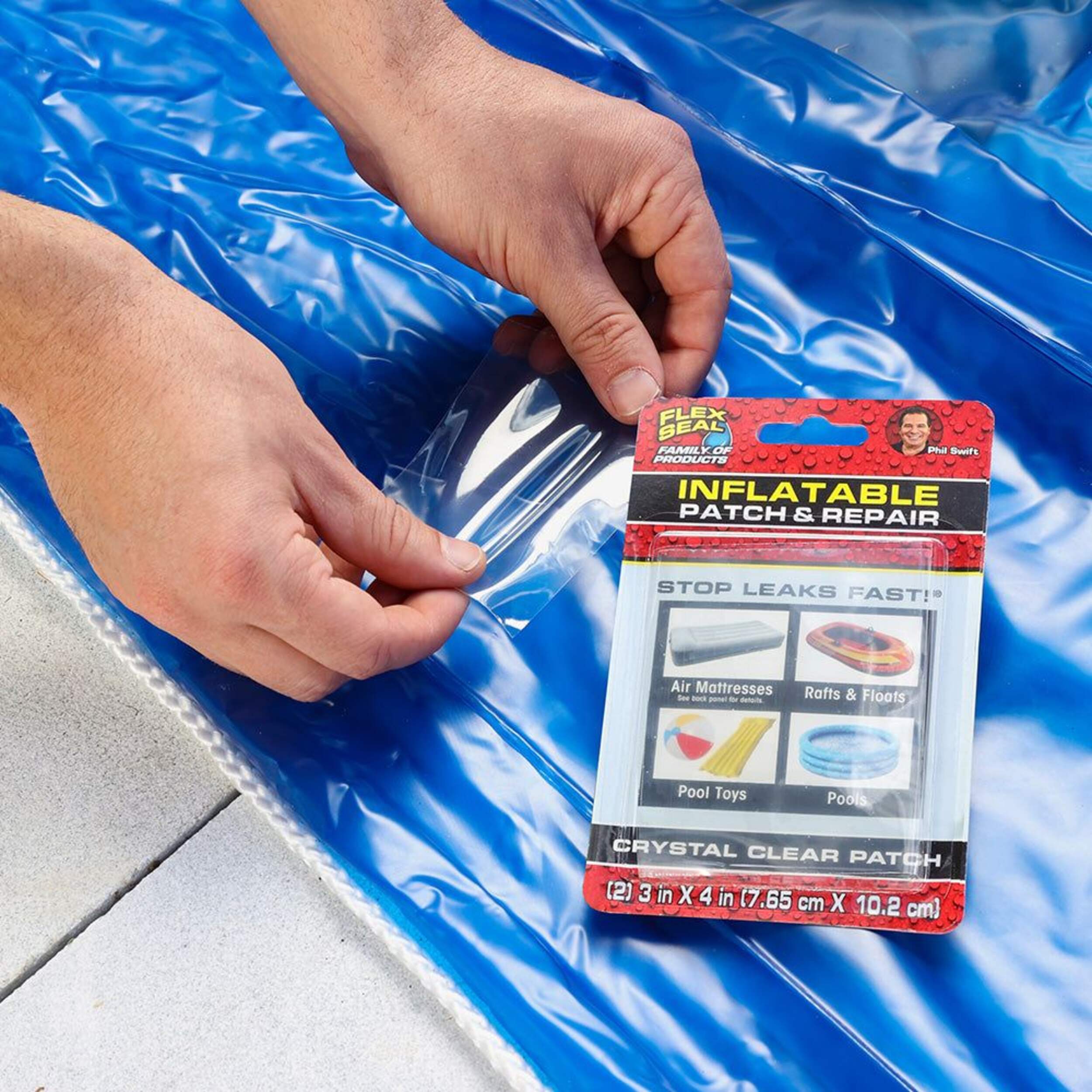Rips, punctures and tears are quickly repaired with this super strong Flex Seal Inflatable Rubberized Crystal Clear Patch & Repair Kit. It's designed to be used on PVC plastic inflatables to keep the fun going all summer long. It's excellent for all smooth PVC plastic surfaces: air mattresses, inflatable toys, pool toys, rafts/floats, inflatable pools, exercise balls, waterbeds, pool liners, inflatable chairs, floating beverage coolers, bounce houses, inflatable yard, holiday decorations and more.