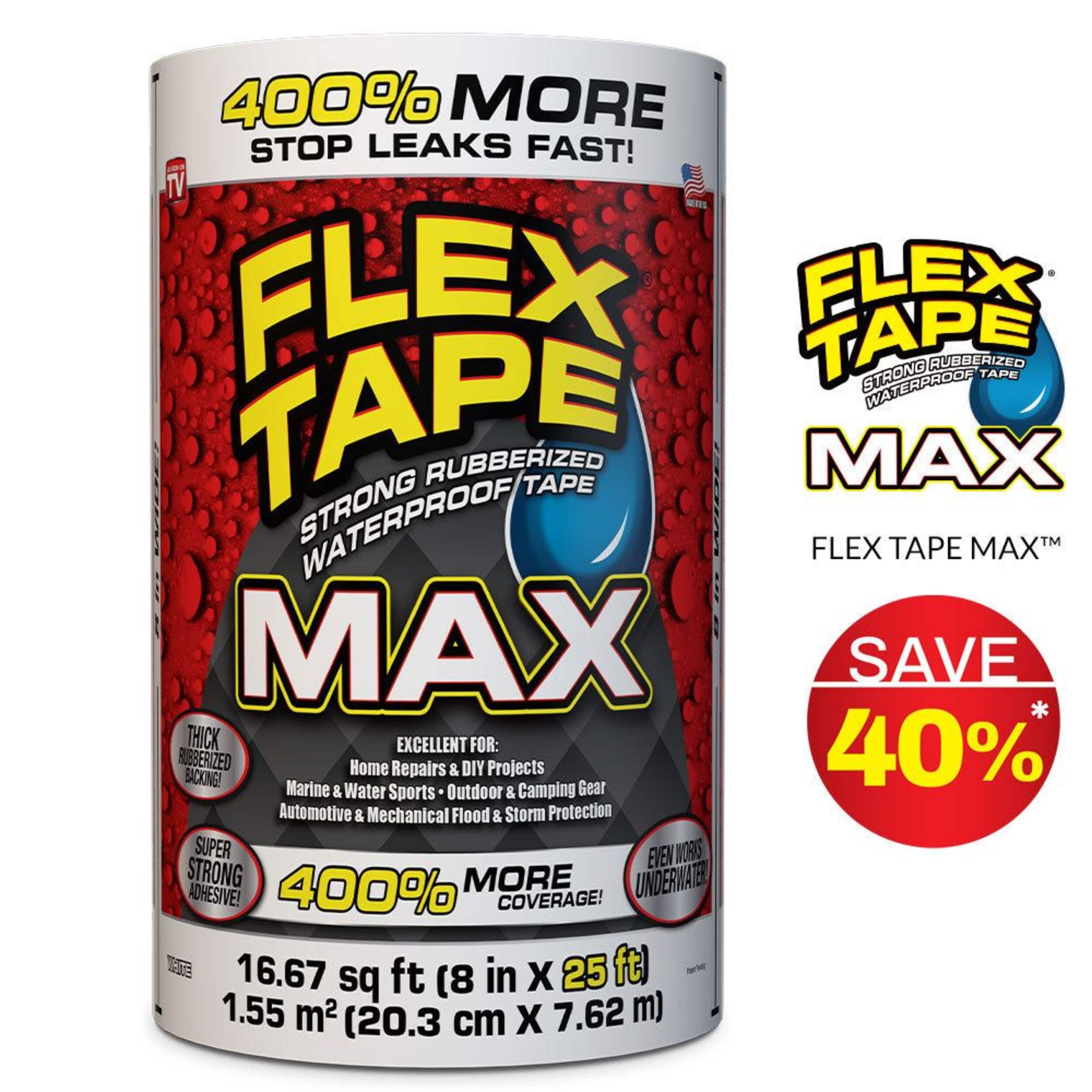 FLEX TAPE® is an exceptionally strong waterproof tape that can instantly patch, bond, and seal virtually anything. Its powerful adhesive bonds instantly to almost any surface and actually becomes stronger over time and with pressure. It features a thick, flexible rubberized backing that conforms to any shape or object. Additionally, it is UV resistant, VOC-free, and can withstand extreme temperatures and weather conditions. FLEX TAPE® is perfect for various applications, including plumbing and general home repairs, quick fixes on boats, automobiles, or RVs, as well as for roof, pool, bath, and shower repairs. It’s also great for DIY projects and more! It works on a wide range of materials such as PVC, acrylic, metal, wood, ceramic, porcelain, glass, rubber, fiberglass, stucco, plaster, cement, concrete, drywall, certain plastics, fabrics, vinyl, and more.